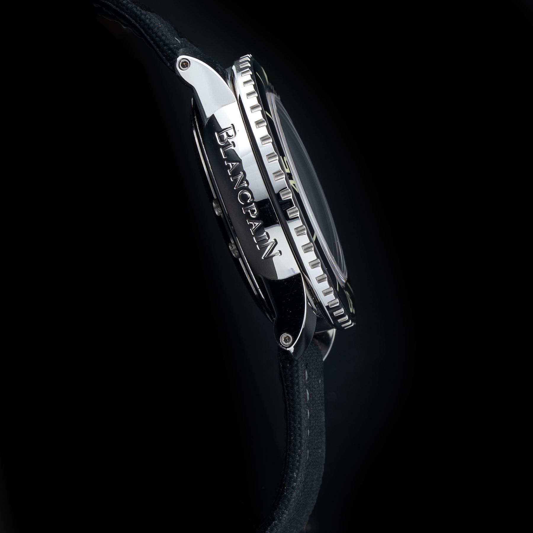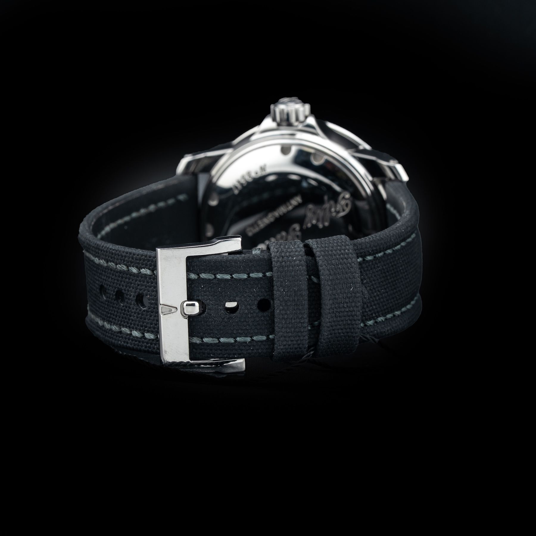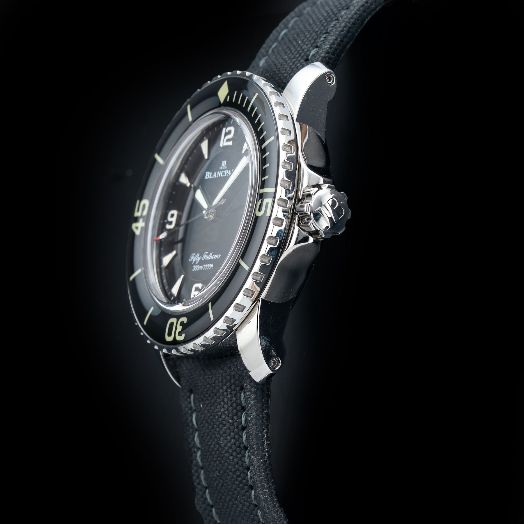 This watch features a 45mm stainless steel case on sail canvas strap. This watch also sports a black dial. Powered by a mechanical automatic movement. Water resistance up to 300 meters.
