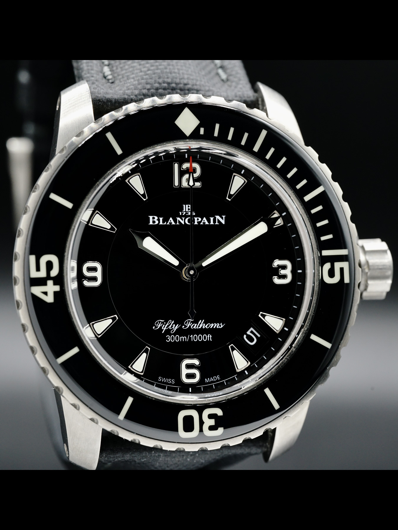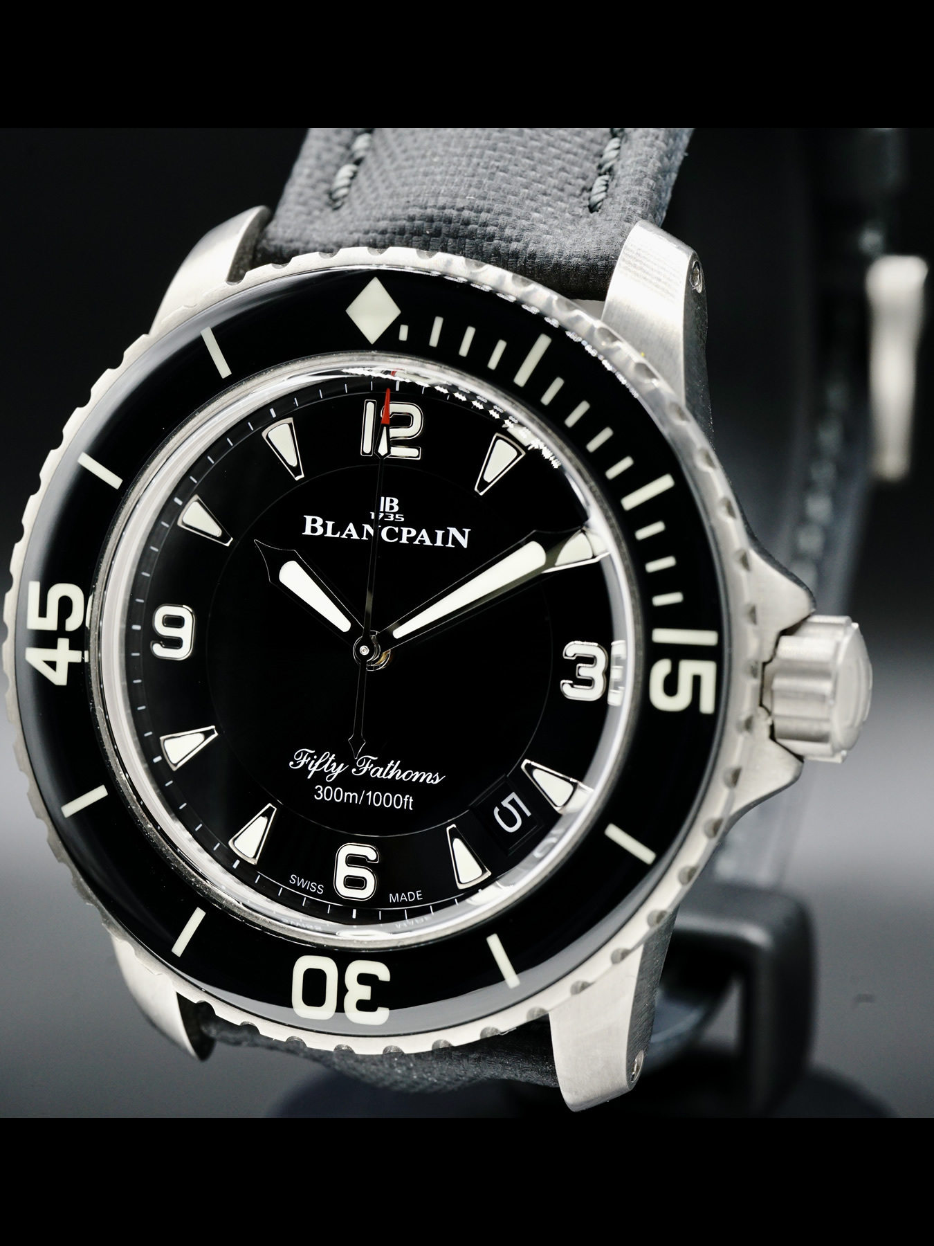 This Blancpain Fifty Fathoms Titanium 5015-12B30-B52A is in EXCELLENT condition. This watch includes its original box, diver's logbook, instruction manual, technical & service booklet, and international warranty card dated for July 2020.