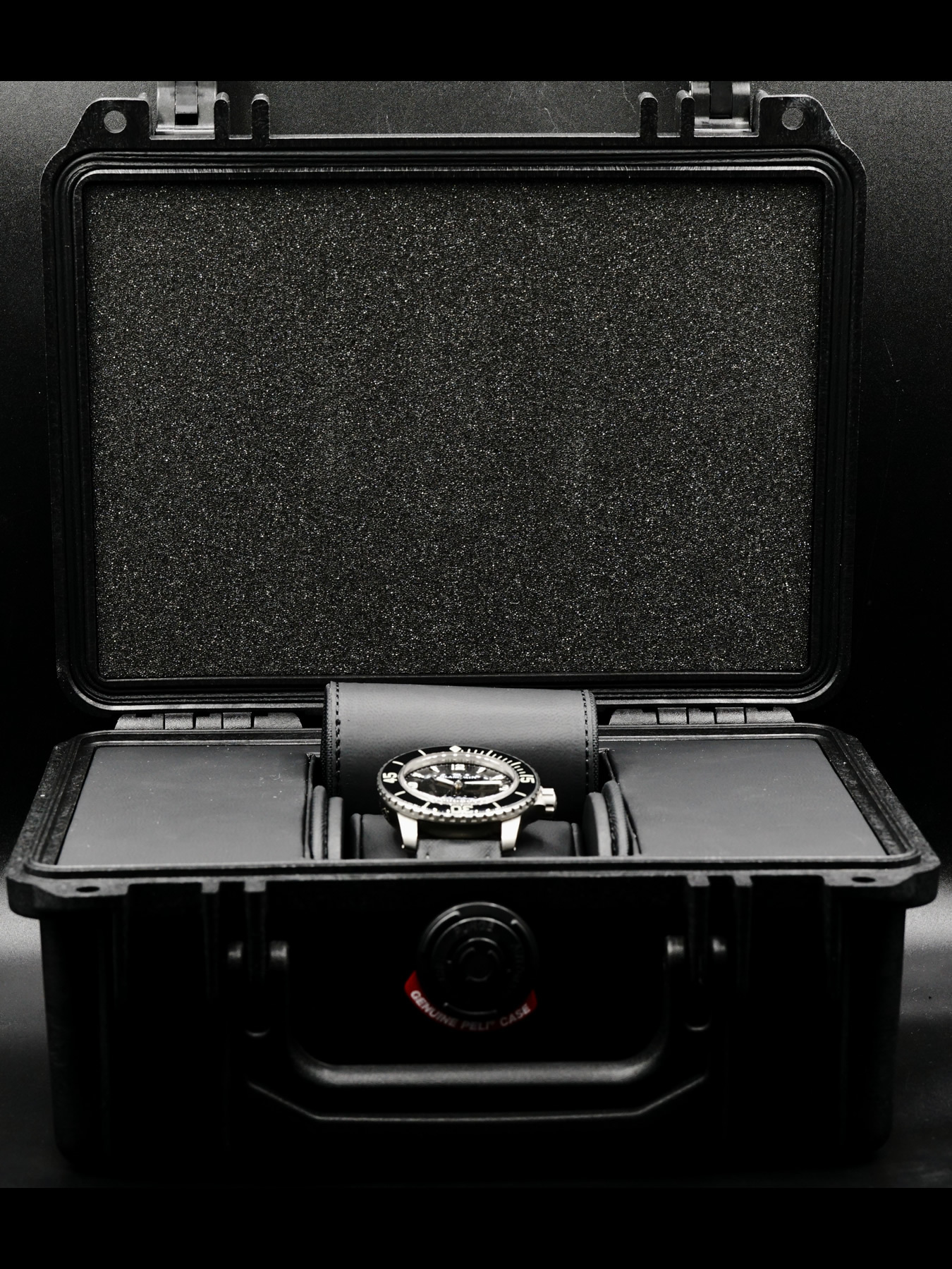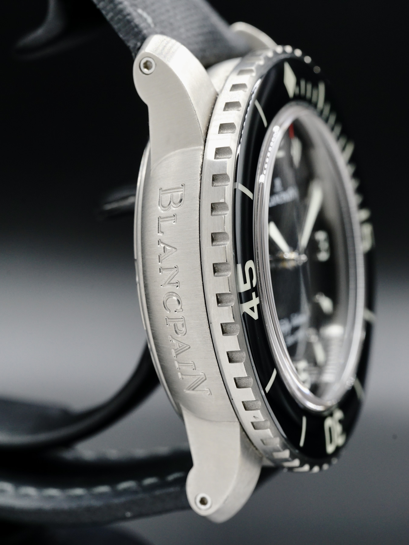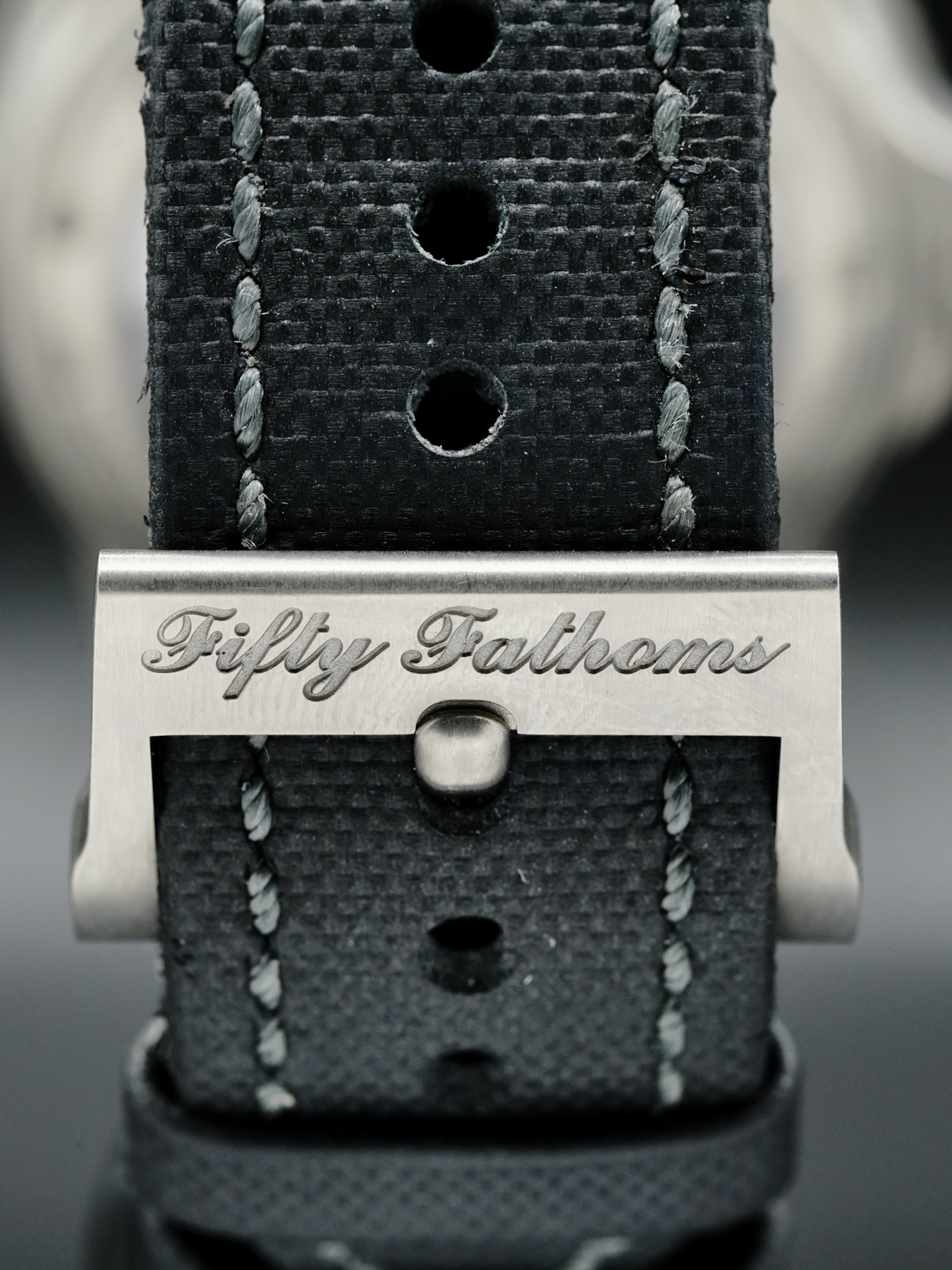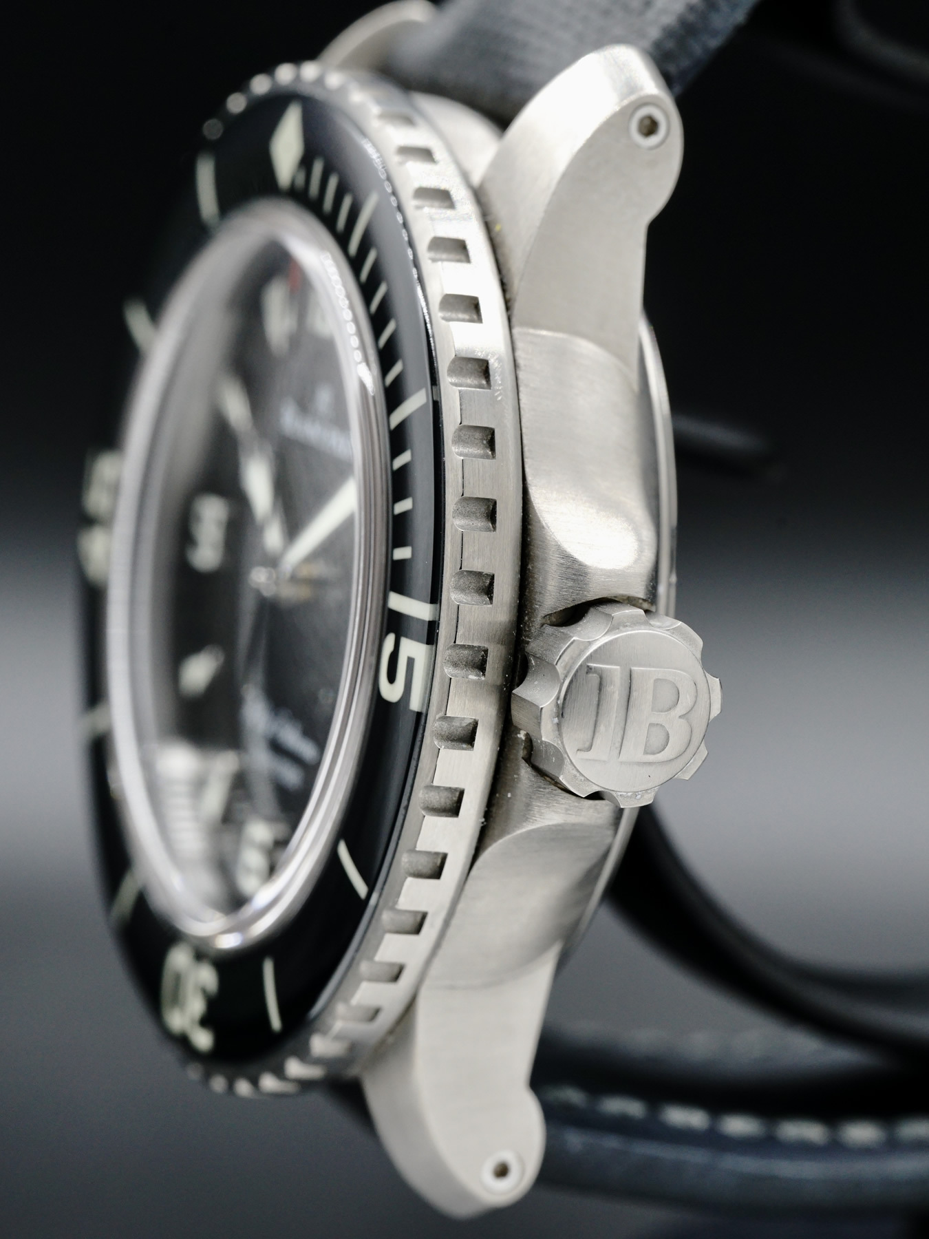 The Blancpain Fifty Fathoms Titanium 5015 12B30 B52A is created from a beautiful solid titanium case and features a sapphire crystal exhibition caseback which features the lovely Caliber 6918B Blancpain movement. The titanium case measures at 45 millimeters, so it's considered a bit big for the average human. The dial is a sleek black color and it also features luxurious luminous hands. The functions of this Blancpain Fifty Fathoms includes seconds, minutes, hours and a large date (This function shows the date in much larger figures than normal by appearing in two separate windows for each digit). This Fifty Fathoms is water resistant up to 300 meters, making it the perfect dive watch. It is showcased on a black sail canvas strap.
