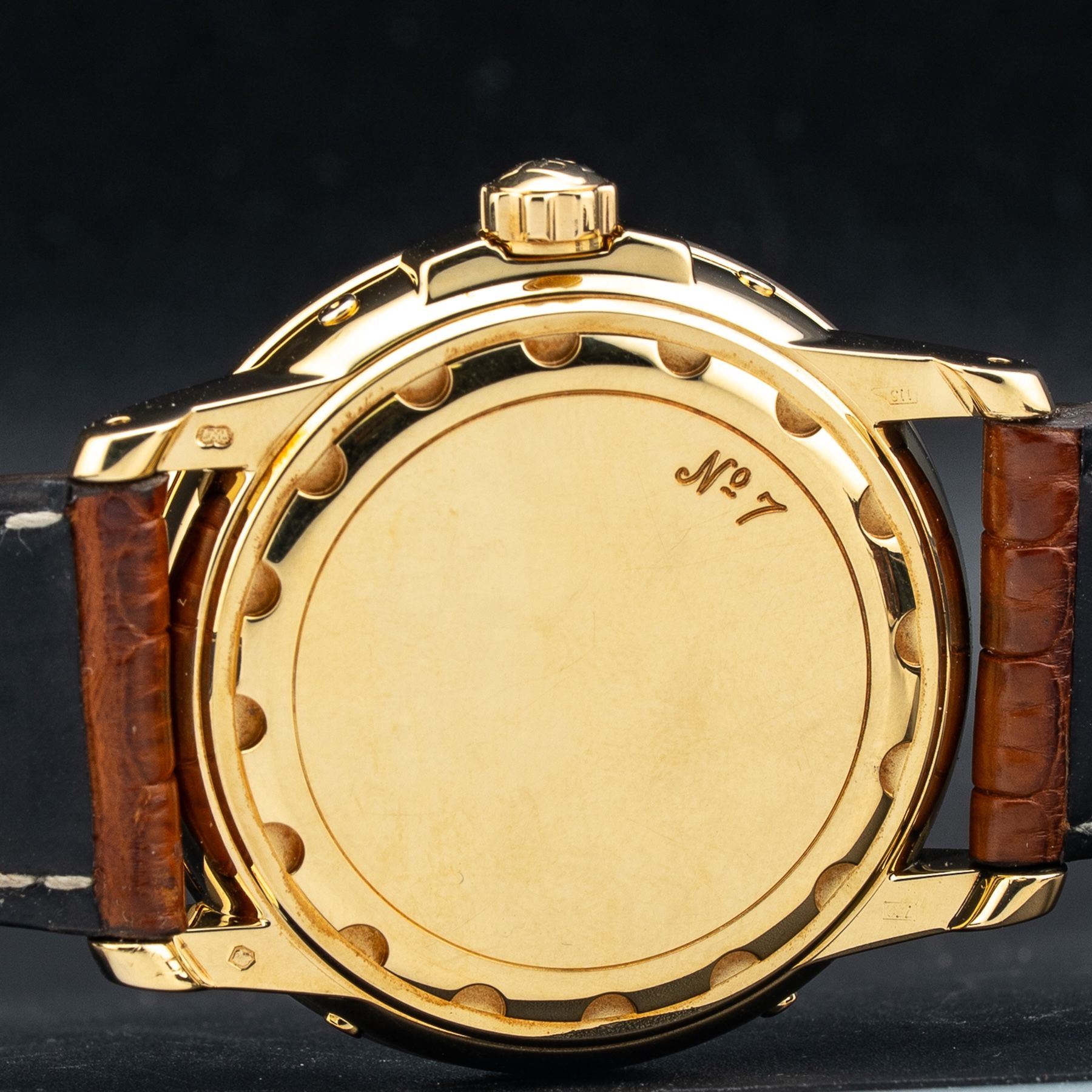 This watch features a 38mm 18kt yellow gold case on leather strap. This watch also sports a white dial. Powered by an automatic movement. Water resistance up to 100 meters.