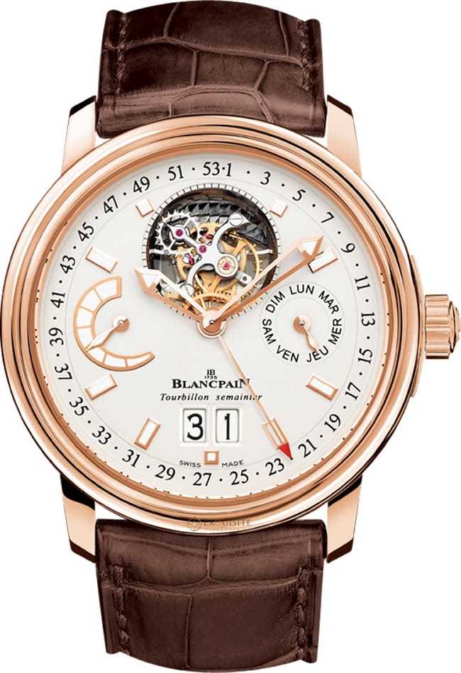 This Blancpain Leman Tourbillon with Grande Date watch in rose gold features a 38mm case, opaline dial and a crocodile strap. The Blancpain Leman Tourbillon also features a self winding movement with big date, power reserve indicator and tourbillon. This watch is water resistant to 100 meters and is a limited edition watch of 188.