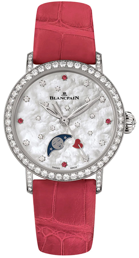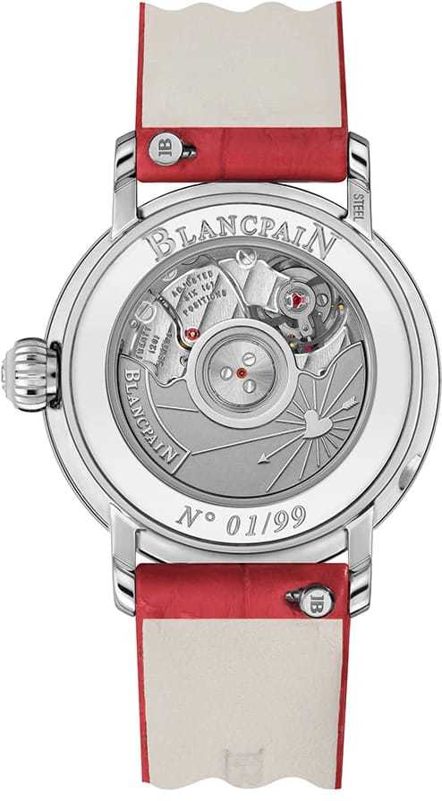 The backdrop for the dial of this new watch designed to mark the day of love and romance is a mother-of-pearl sky sprinkled with 19 diamonds and four rubies, all brilliant-cut and secured using the “star-setting” technique. This type of gemsetting involves using a metal base in order to drive the stone into the dial. For the very first time in the Blancpain collections, the exquisite sapphire moon phase has been placed at a sloping angle at 6 o’clock. It is adorned with a slender border and the opening features a softly rounded shape. This moon with its unmistakably feminine face is an amusing nod to history, since the artificial mole of “beauty spot”, known as a mouche for its similarity to a fly appearing at the corner of its smiling mouth, was regarded in 18th century France as symbolizing a playfully teasing attitude. Mouches were used by ladies of the Court as a message to their suitors that differed according to where these coquettish signs were placed.