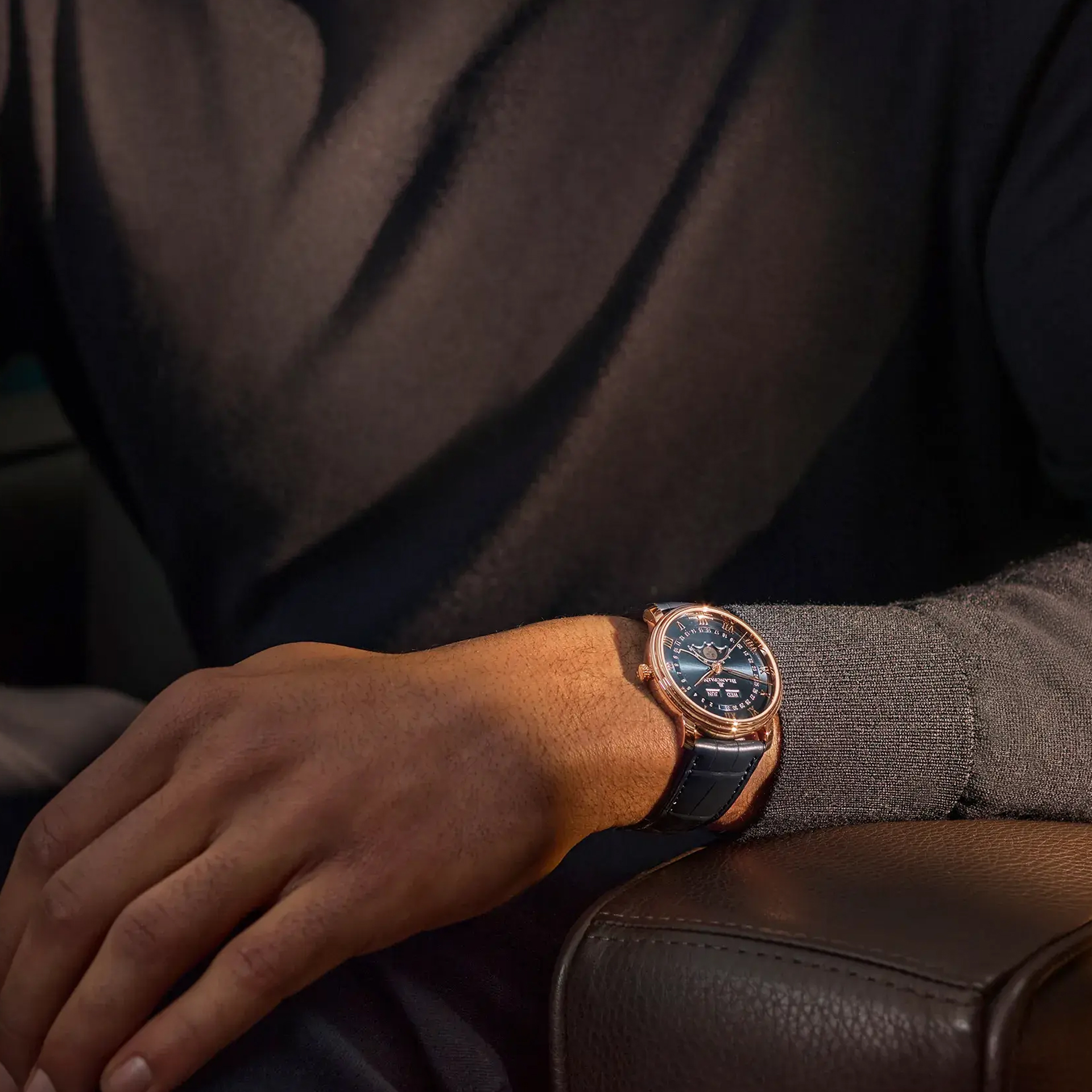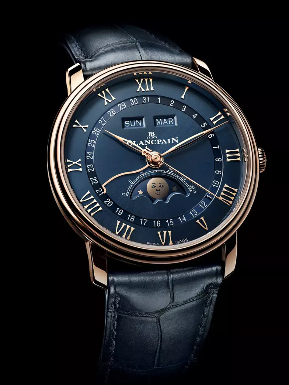 The Villeret Quantième Complet model harmoniously combines a complete calendar and moon phases. Its dial features discreet apertures indicating the day of the week and month at 12 o'clock, a calendar with a serpentine hand and a moon-phase display with a mischievous face positioned at 6 o'clock.