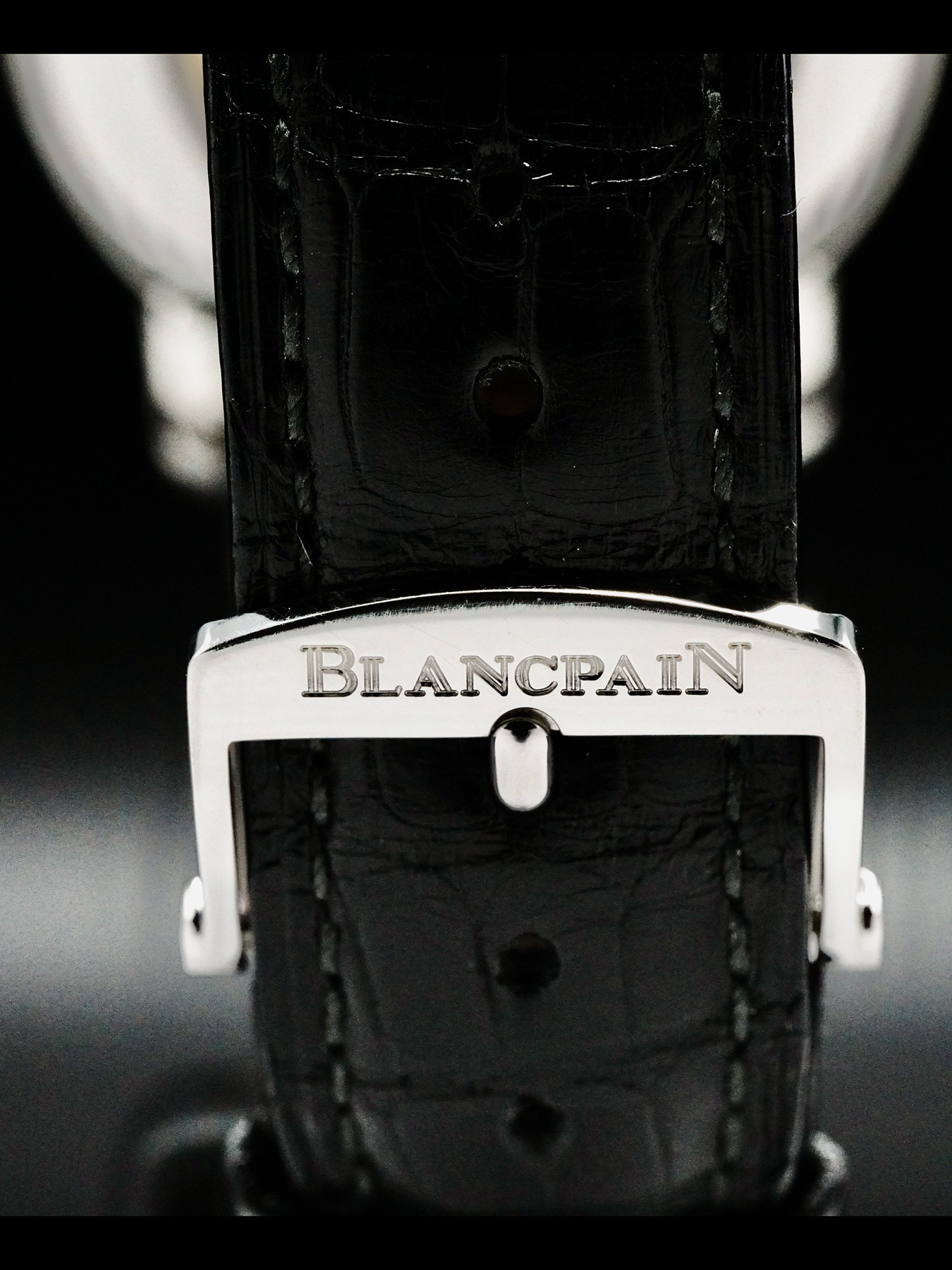 This Blancpain Villeret Ultra-slim Complete Calendar 6654-1113-55B is in EXCELLENT condition. It has boxes and papers. This watch has been fully authenticated and certified by Exquisite Timepieces.