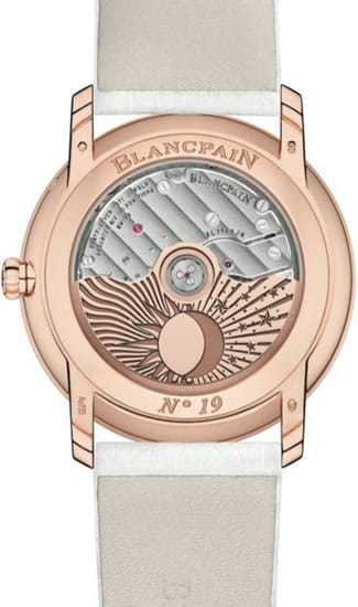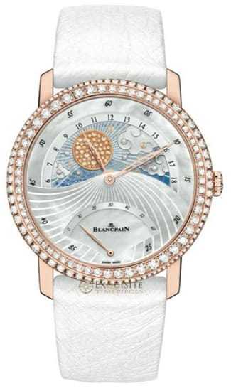 WOMEN, DAY AND NIGHT INDICATOR WATCH, 60 seconds retrograde, Caliber 1163JN, white gold, Bezel set with 204 diamonds (carat weight 2.167), mother-of-pearl dial , day and night disk set with diamonds and yellow sapphire, sapphire crystal case, self-winding, 40 hrs power-reserve, White ostrich leater bracelet.