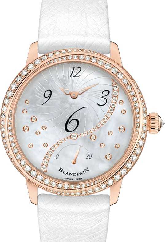 Retrograde small seconds, Off centered hour, Silicon balance spring, Mother-of-pearl set with diamonds dial, Ostrich Leather strap.