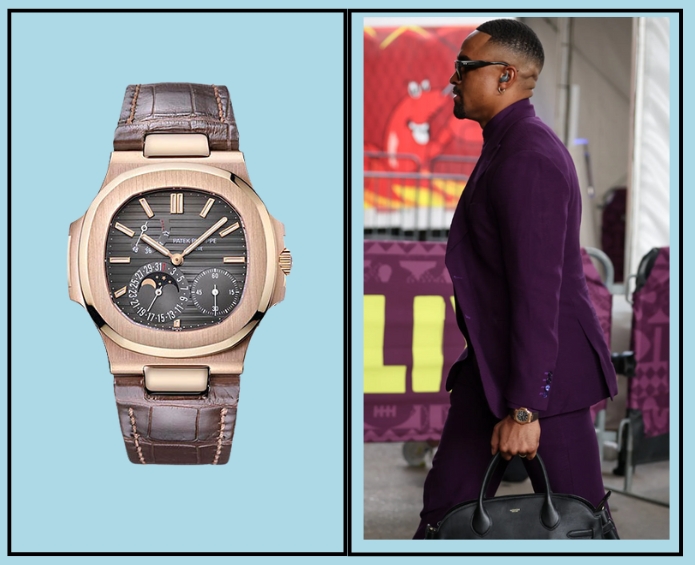 The dial is a semi-transparent smoked sapphire coated with Super-LumiNova, making the date discs, subdials, and moonphase glow brilliantly in the dark.