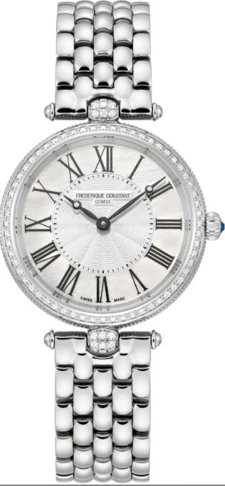 Frederique Constant crafts the 30mm model from steel, equips it with a polished bracelet and adds a sprinkle of delicate round brilliant-cut diamonds around the dial for an extra touch of panache. This is another quartz-powered watch, allowing for the case to sit at a mere height of just 5.65mm. The “clous de Paris” guilloché dial and black Roman numeral hour markers also infuse this watch with a vintage-inspired essence.