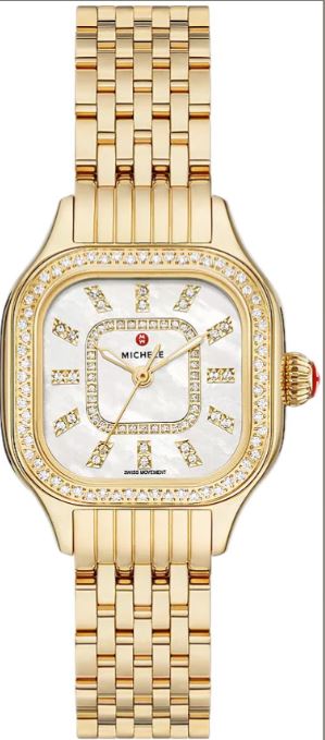 The Michele Meggie Gold Diamond watch celebrates a very feminine silhouette, with rounded corners that soften the square shape of the case. This modern and graceful alternative to the rectangular watch is adorned with a total of 124 hand-set diamonds, which frame the dial and also feature on the mother-of-pearl display.