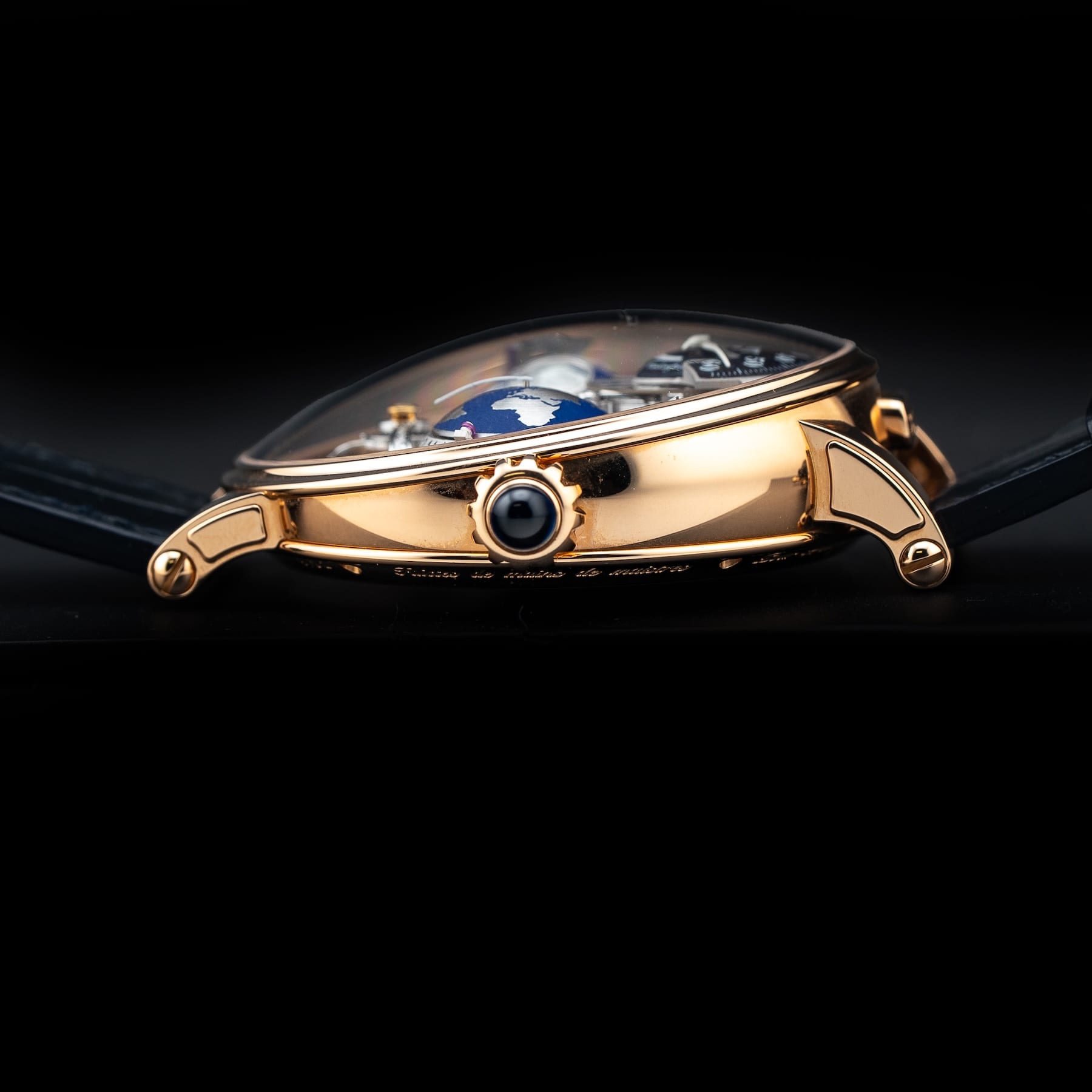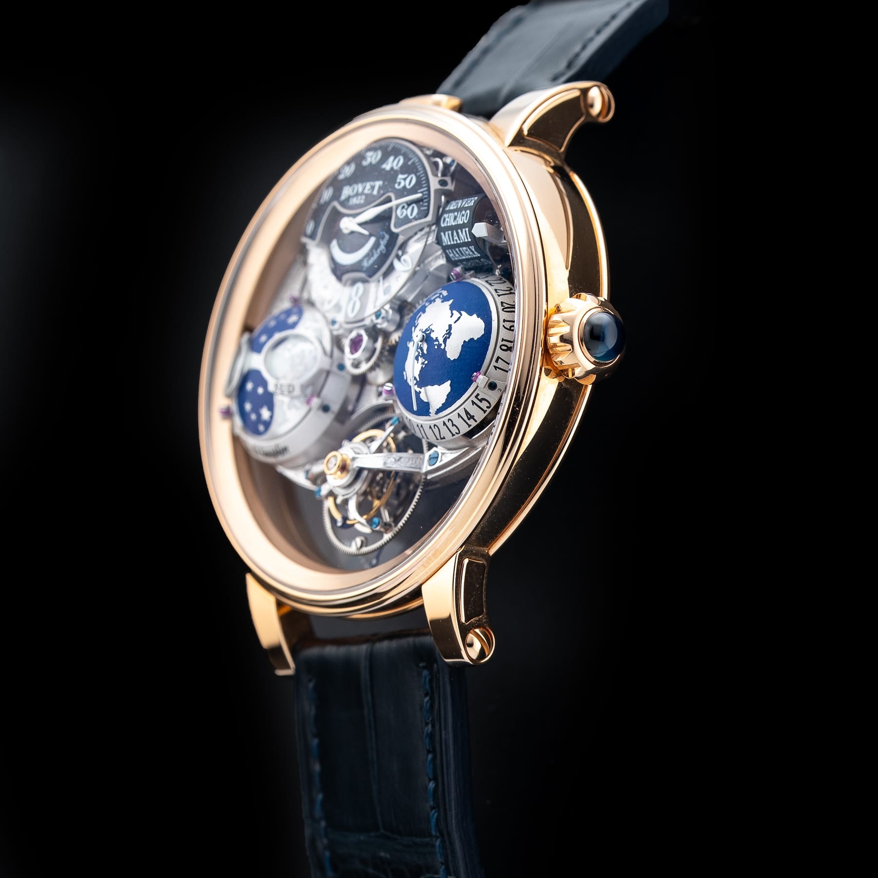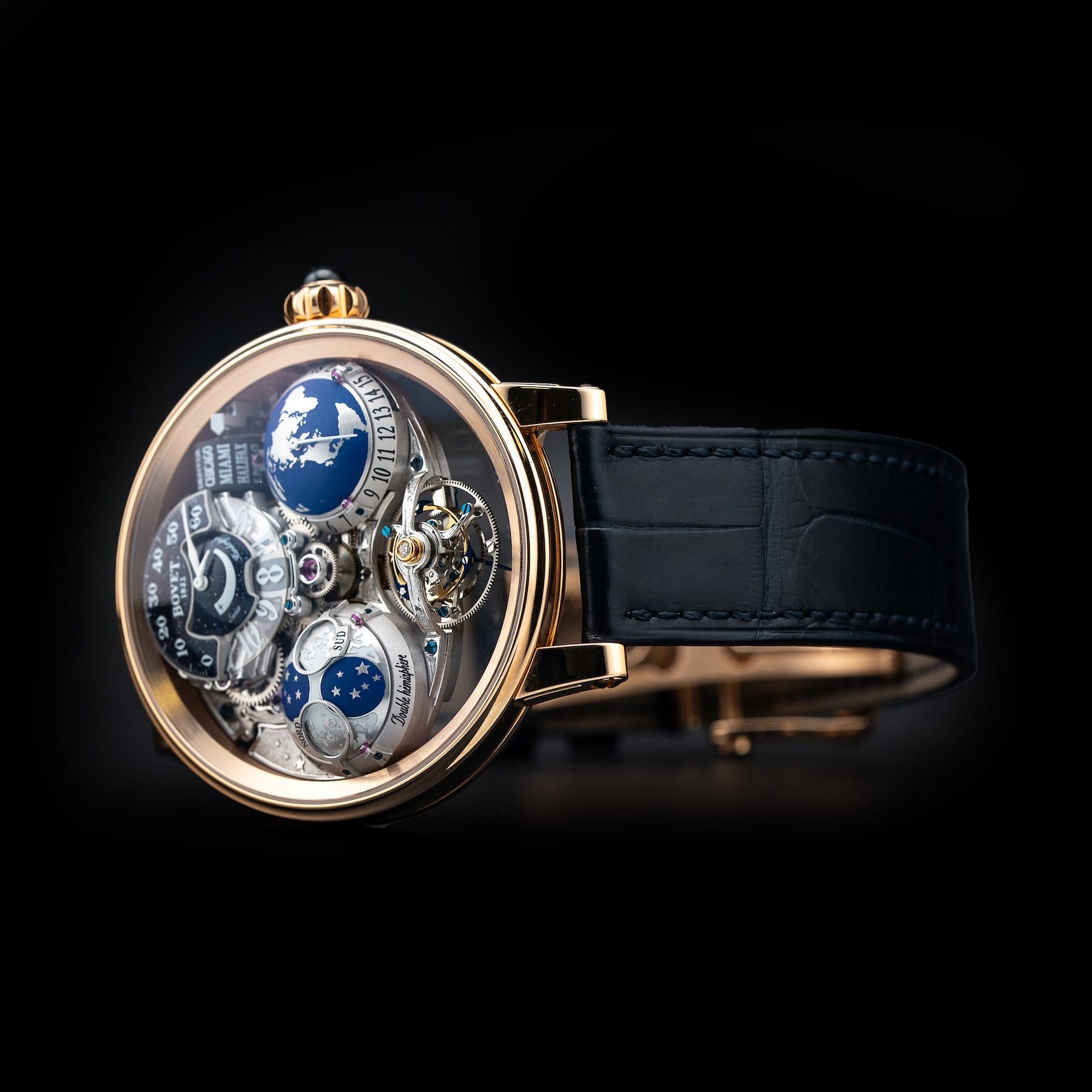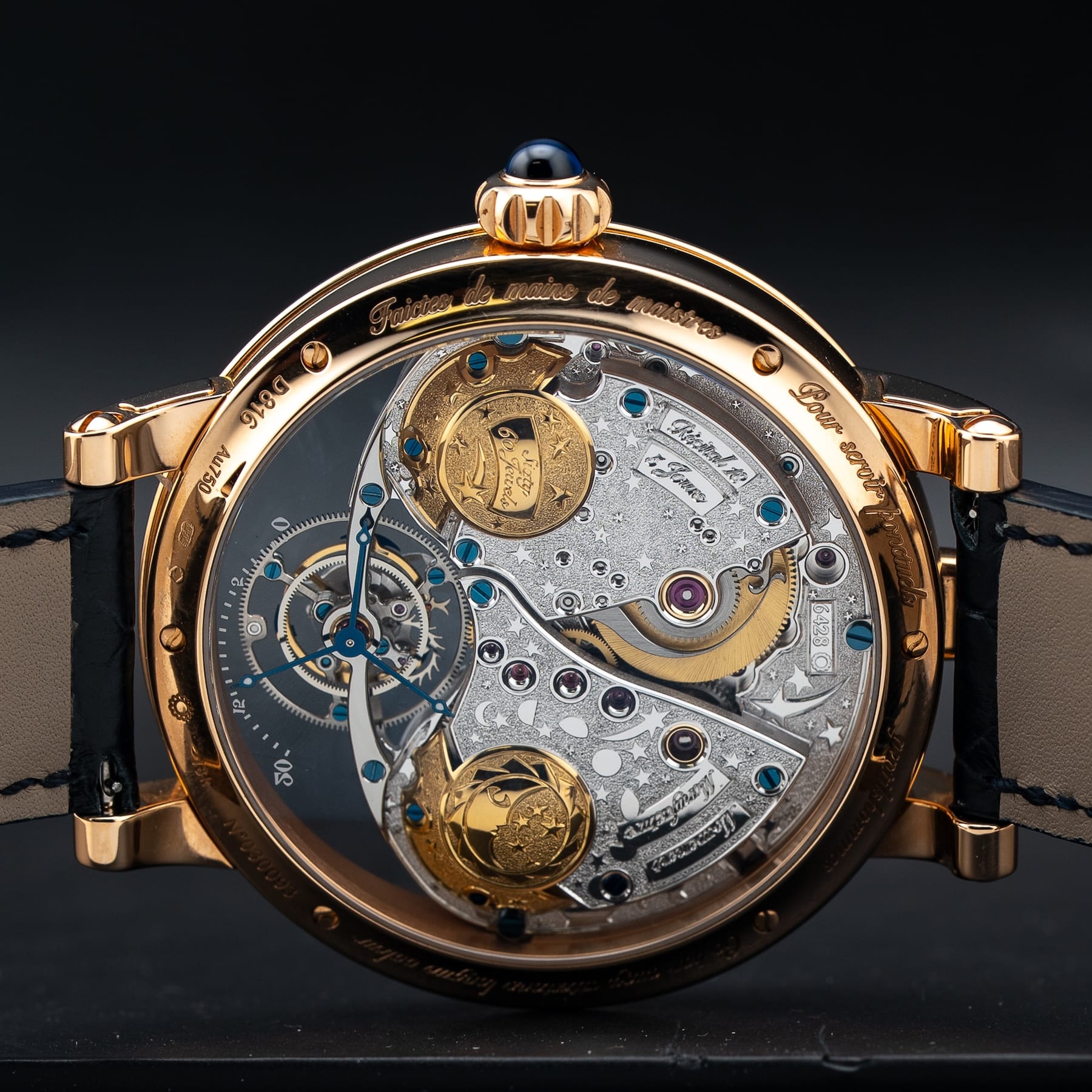 This Bovet Shooting Star Recital features a 46mm 18k red gold case with an exhibition case back on a black leather strap. This watch also sports a skeleton dial with blue hands covered by scratch resistant sapphire crystal.