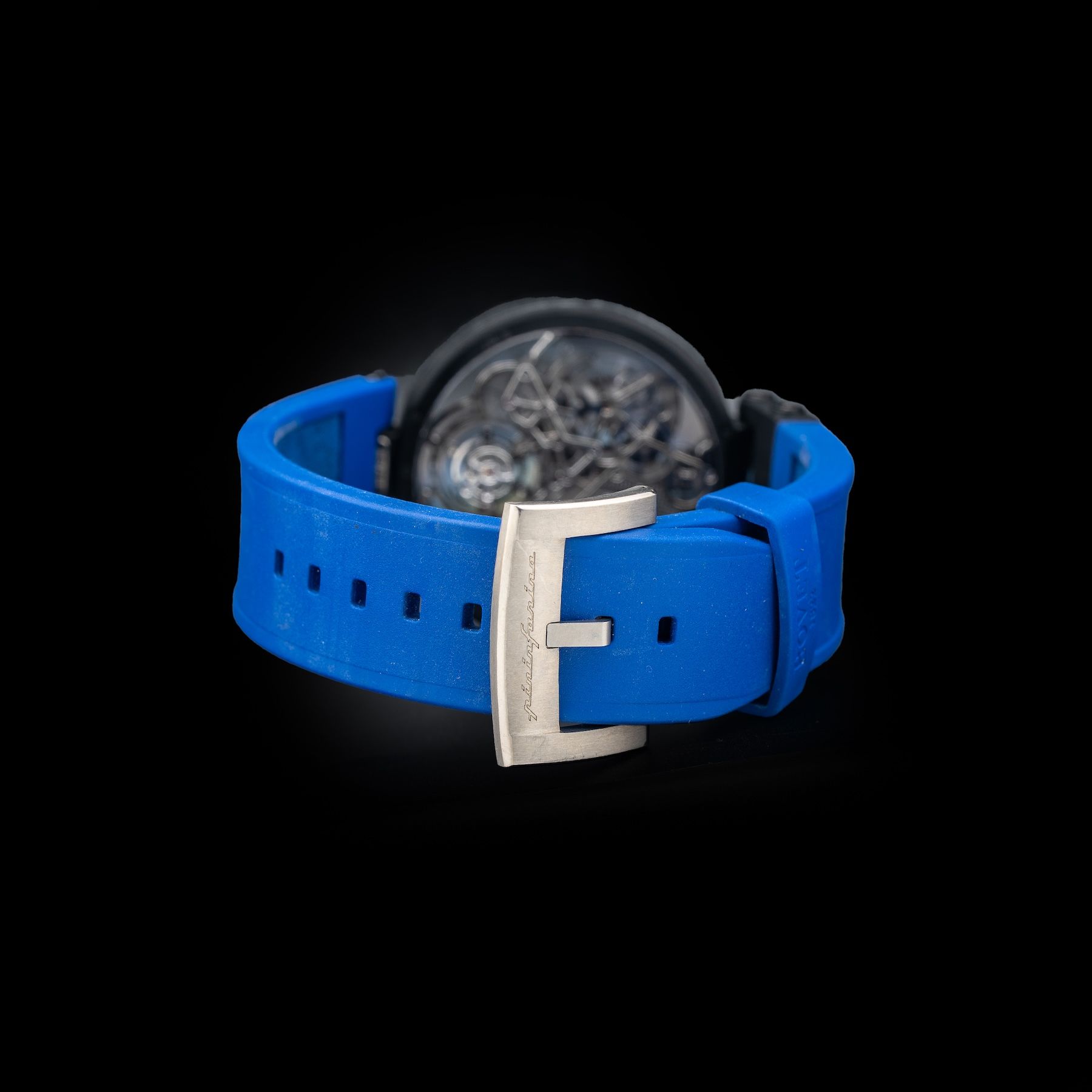 - This timepiece features a 44mm titanium case paired with a high quality rubber strap. It showcases a distinctive blue dial and is powered by a precise manual winding movement. The watch is designed with a water resistance of up to 30m.