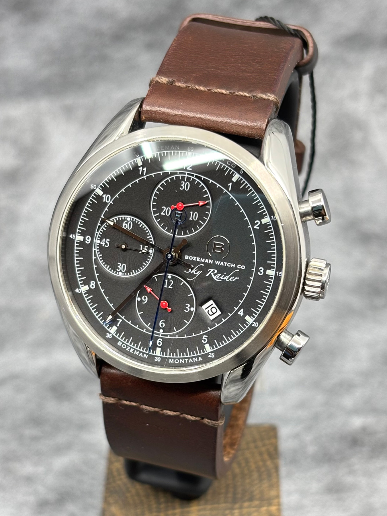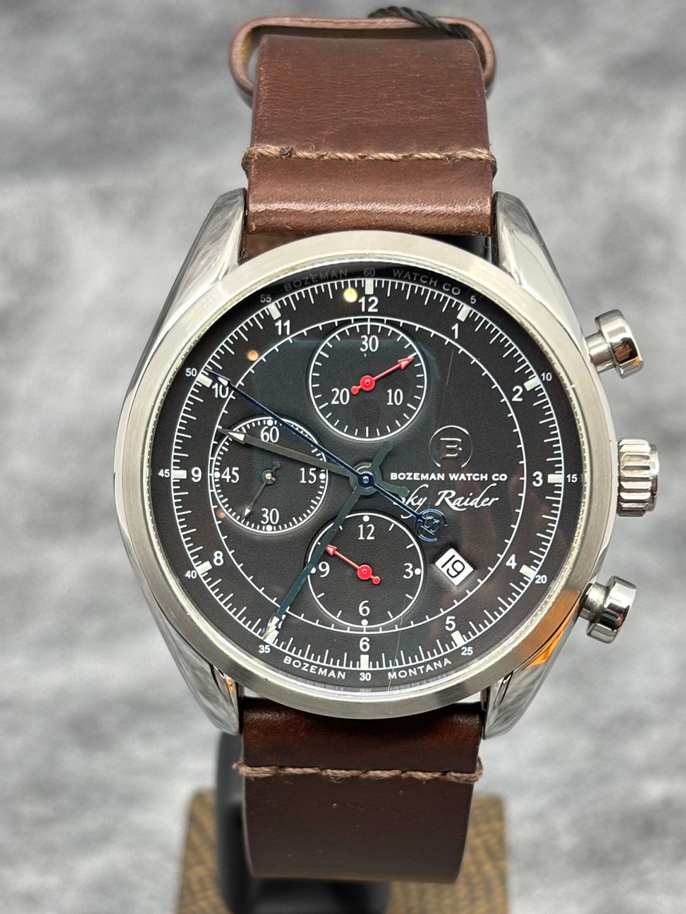 This Bozeman Sky Raider Chronograph is in Excellent condition, it has a generic travel box only. This watch has been fully authenticated and certified by Exquisite Timepieces.