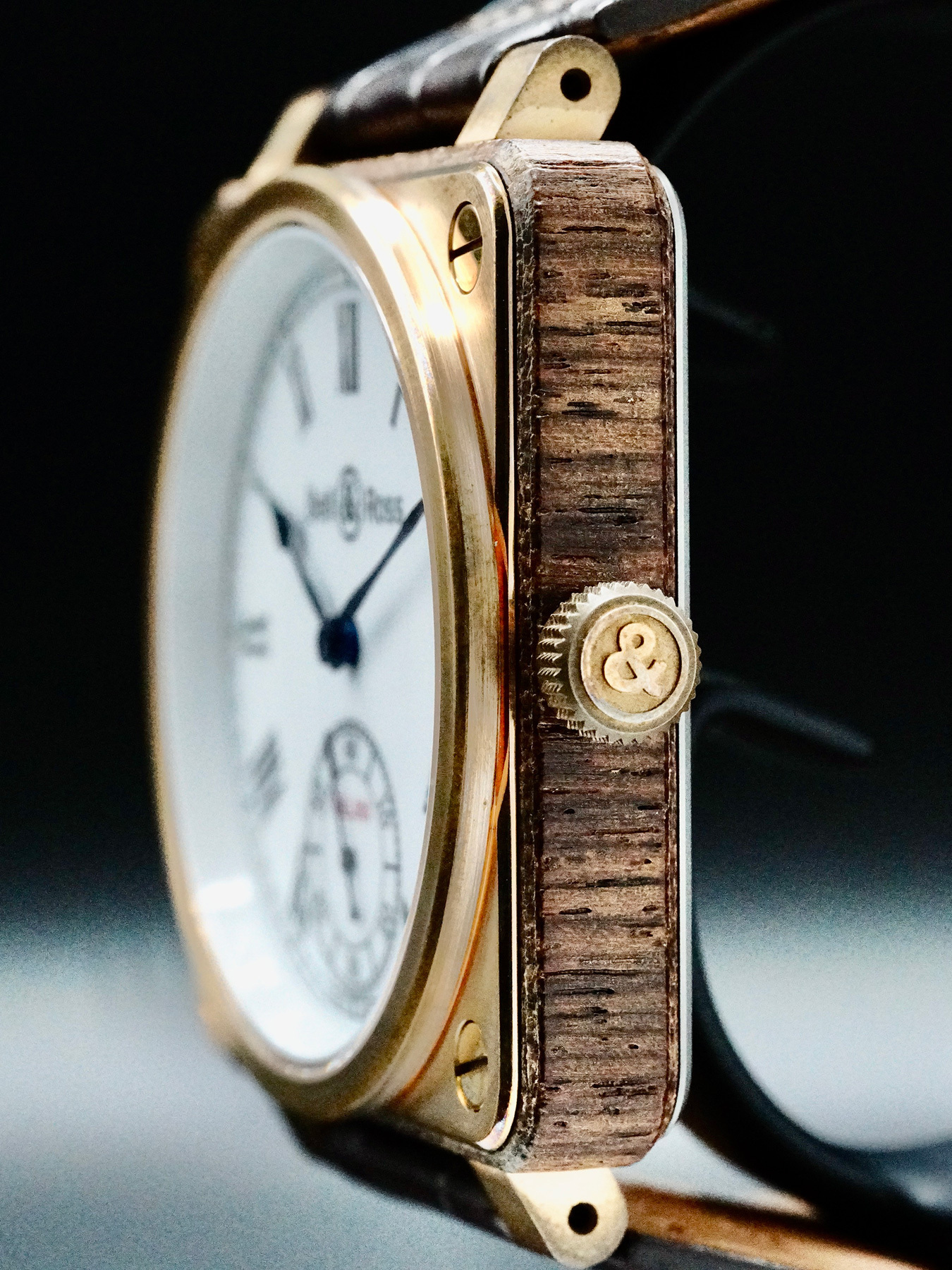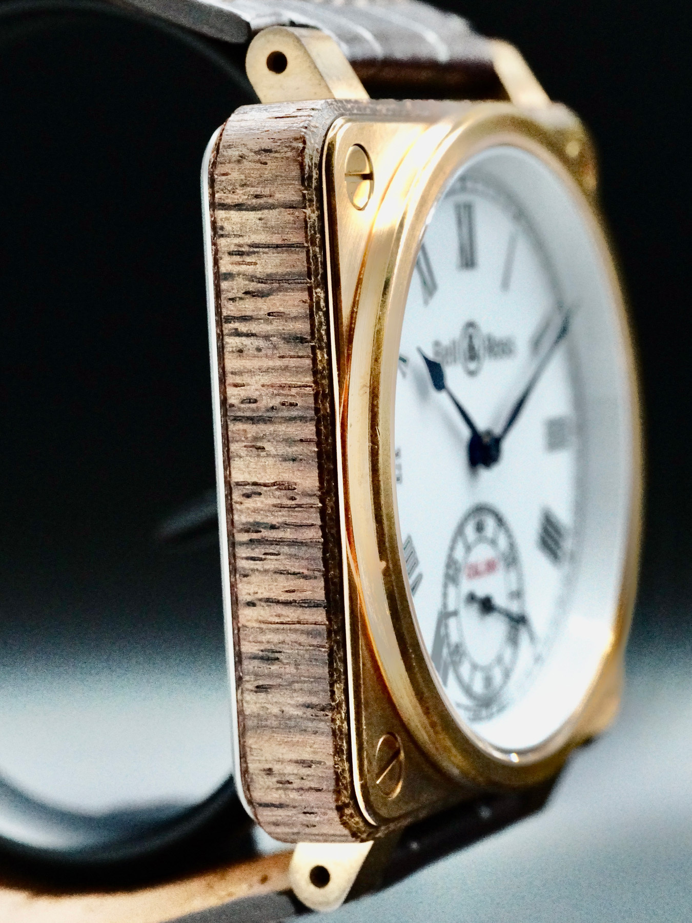 This Bell & Ross BR 01 Instrument De Marine features a bronze-wood-titanium case with a display case back on a brown leather strap. This watch also sports a white dial with blue hands and Roman numeral dial markers covered by sapphire crystal.