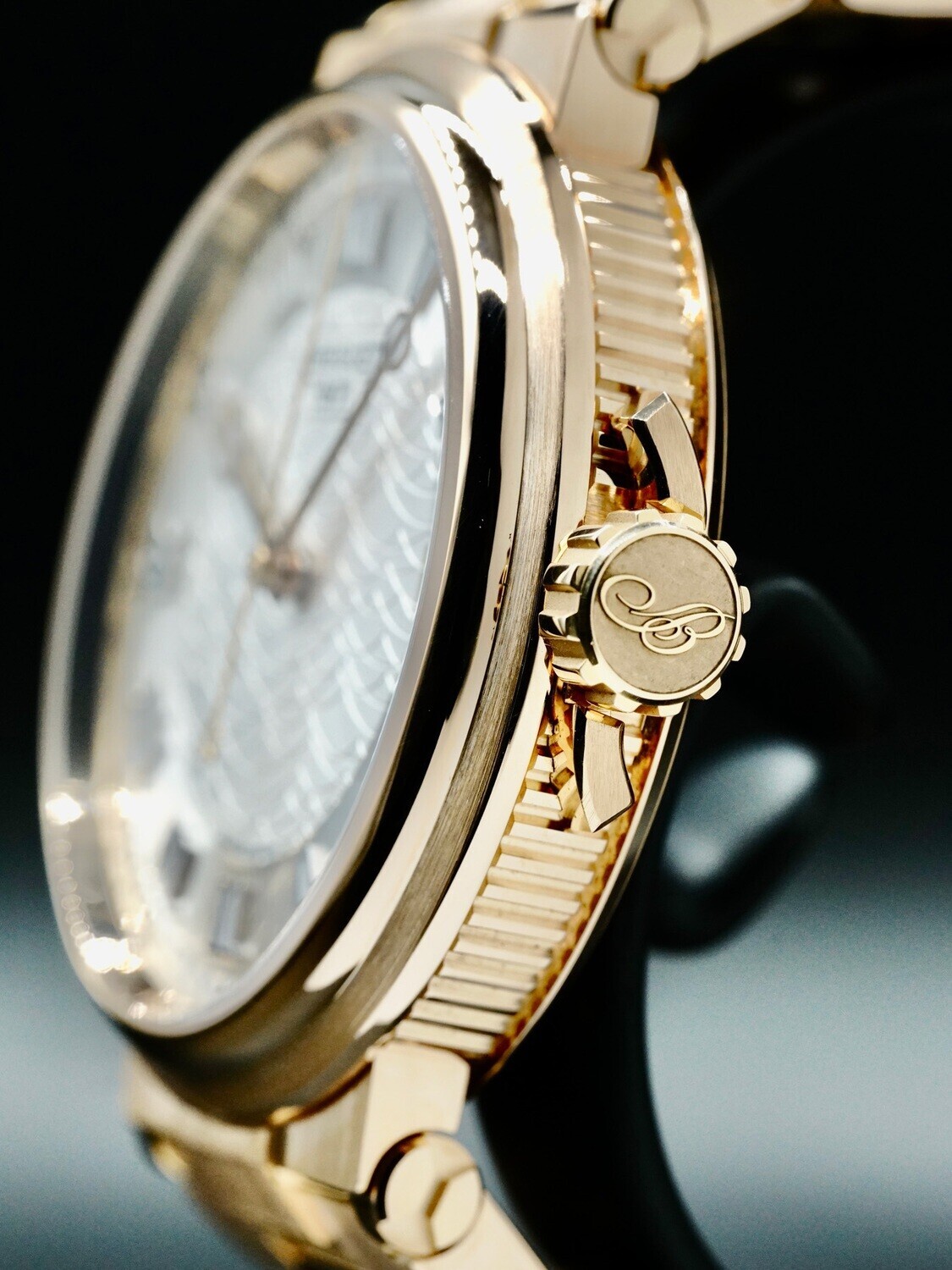 This watch features a 40mm rose gold case on rose gold bracelet. This watch also sports a silver dial. Powered by a Mechanical Automatic Movement. Water resistance up to 100 meters.
