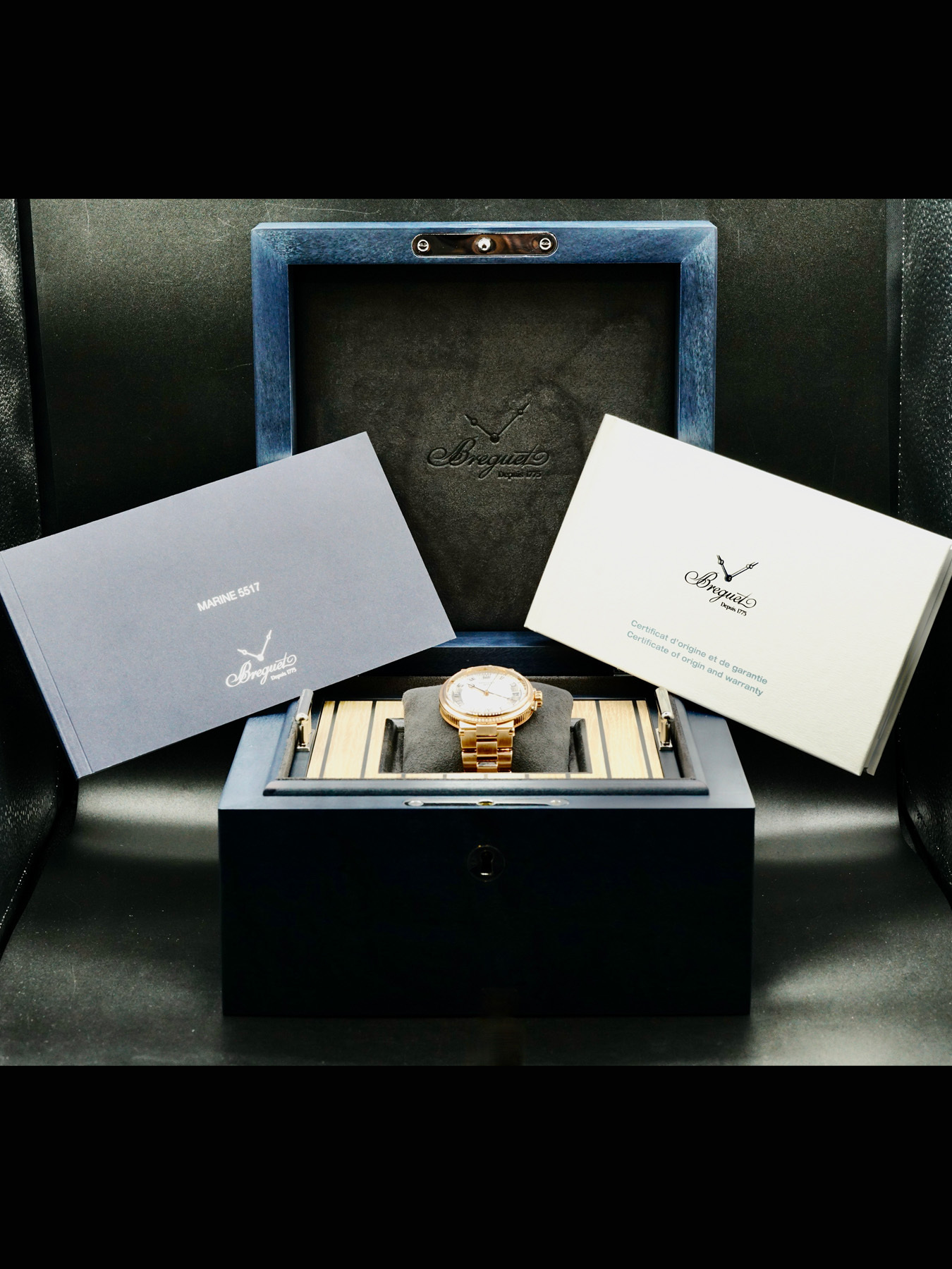 This Breguet Marine 5517BR/12/RZ0 is in GREAT condition. This watch includes its original box, instruction manual, and certificate of origin & warranty not dated. it will fit a 7 1/4 wrist. This watch has been fully authenticated and certified by Exquisite Timepieces.