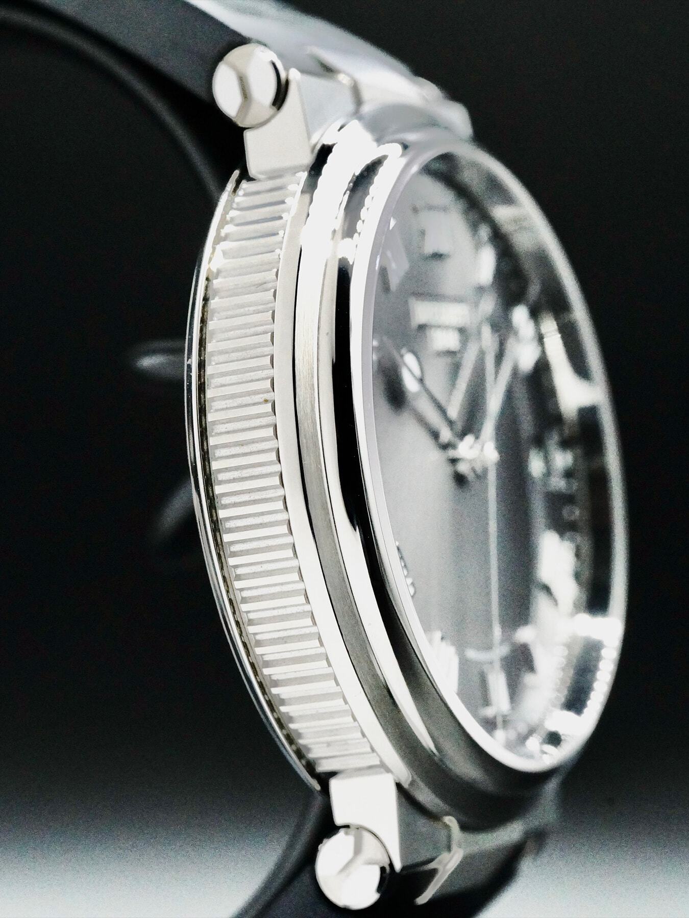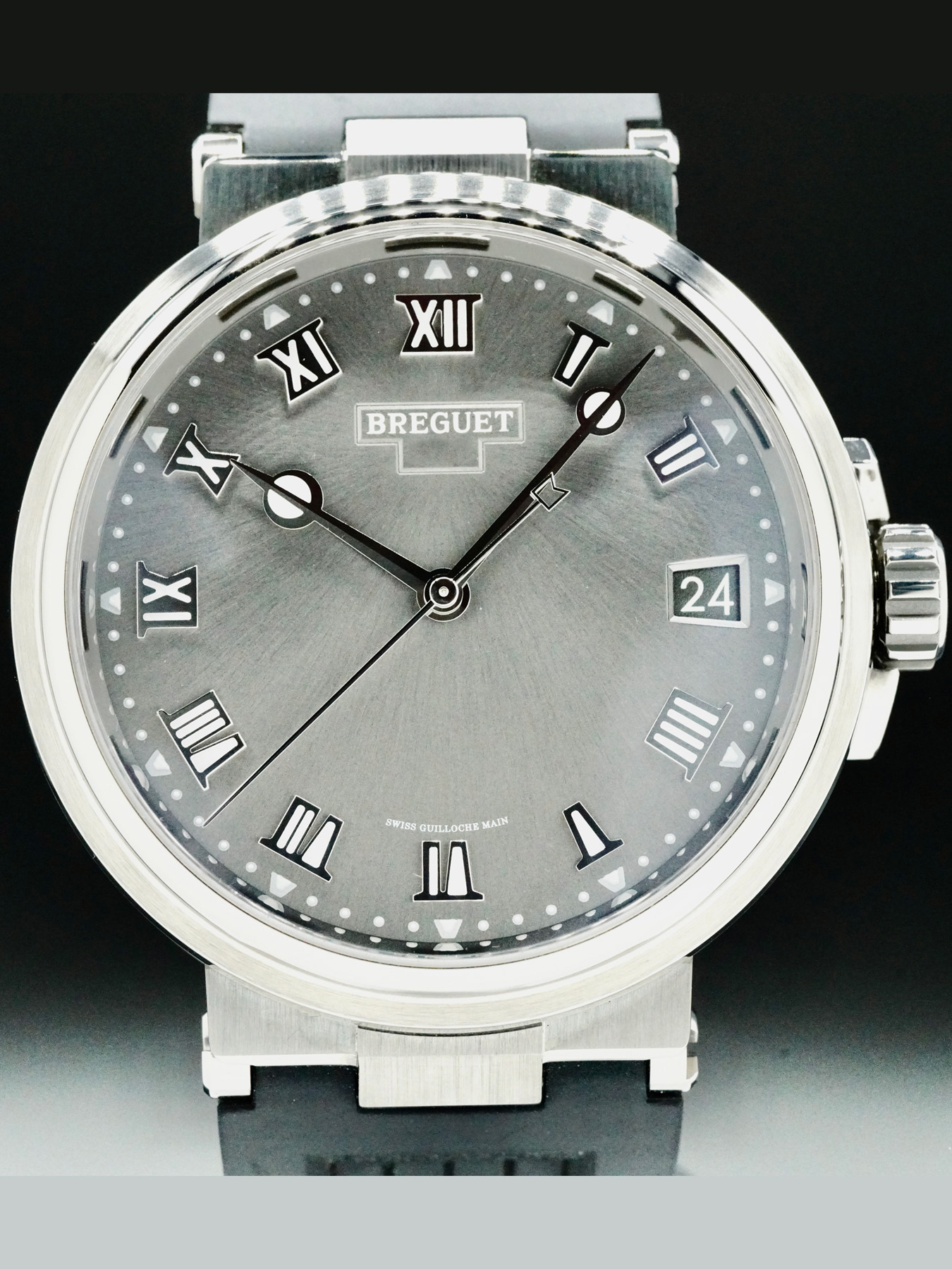 This Breguet Marine features a 40mm titanium case with an exhibition case back on a black rubber strap. This watch also sports a sunburst slate grey dial with silver hands and Roman numeral dial markers covered by scratch resistant sapphire crystal.