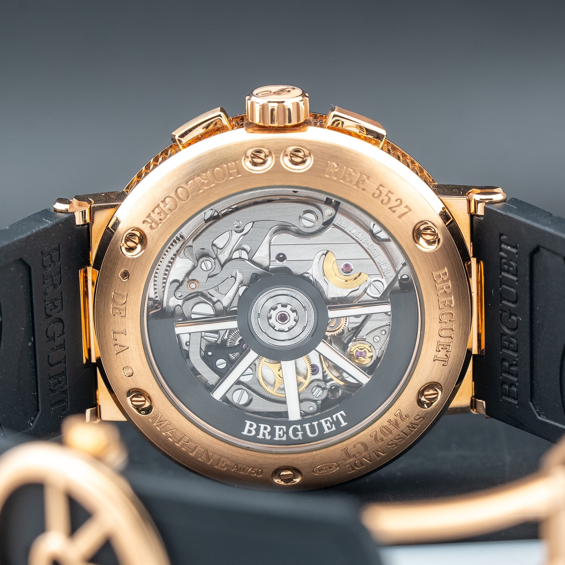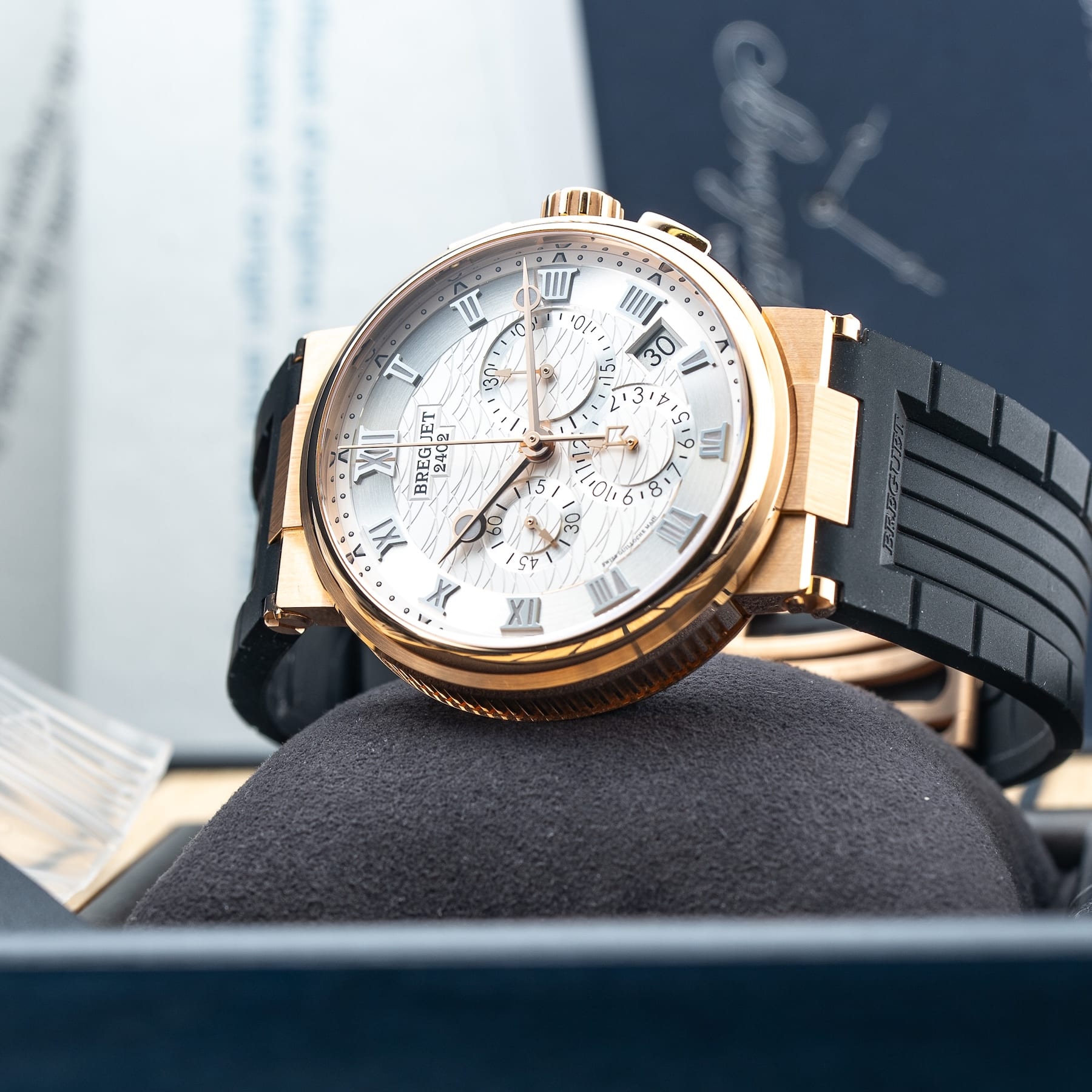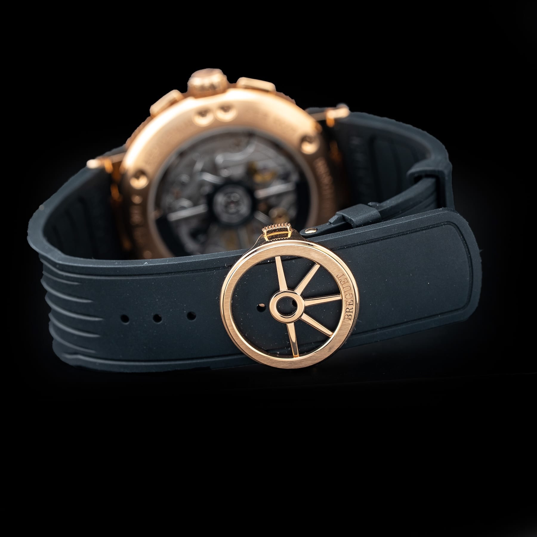 This Breguet Marine Chronograph 5527BR/12/9WV is in GREAT condition. This watch includes its original box, original papers, and warranty dated for 08/07/2024. Extra Strap. This watch has been fully authenticated and certified by Exquisite Timepieces. Please note, the photos shown are of the actual watch you will receive.
