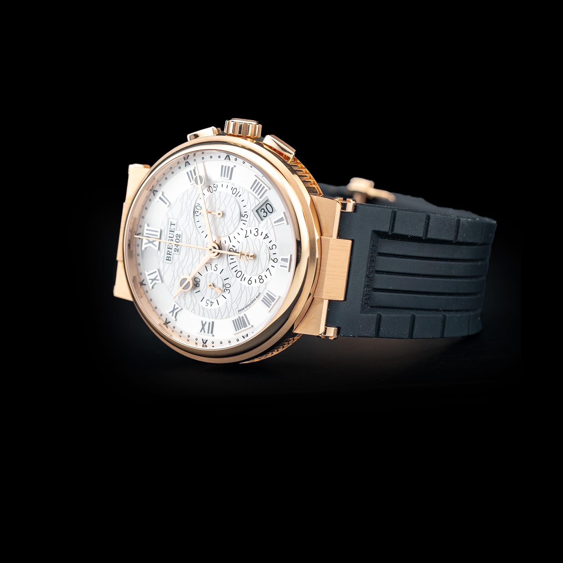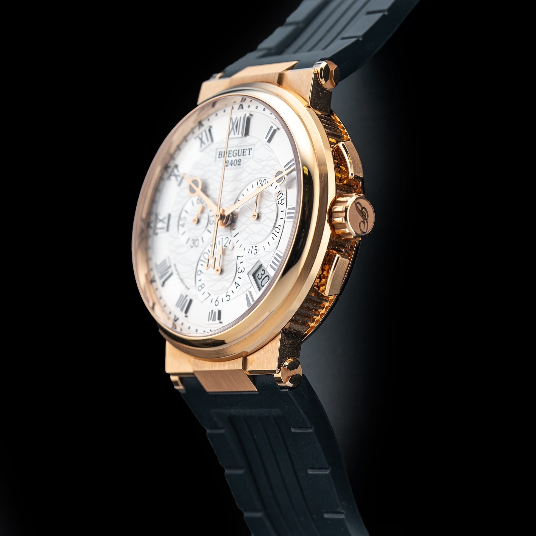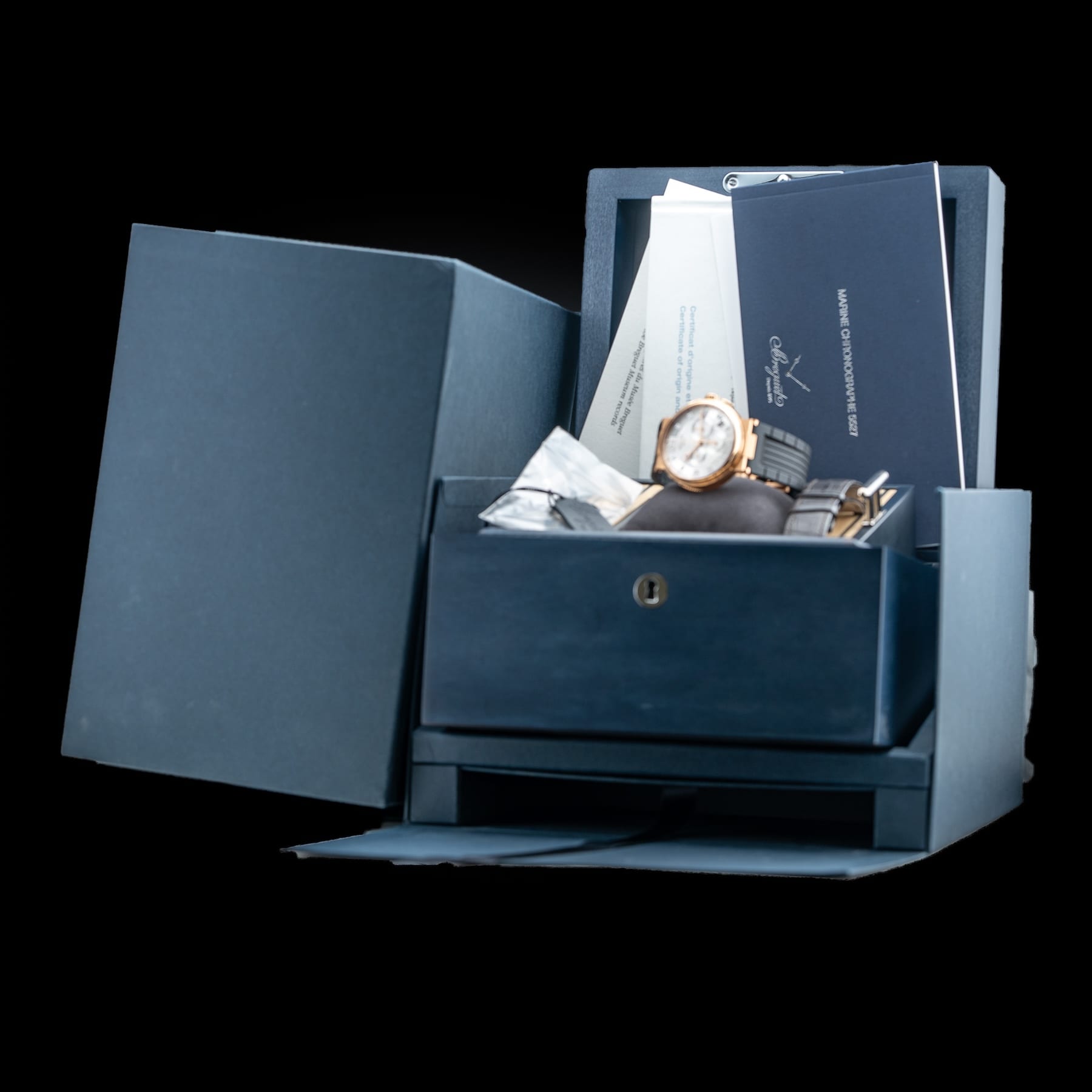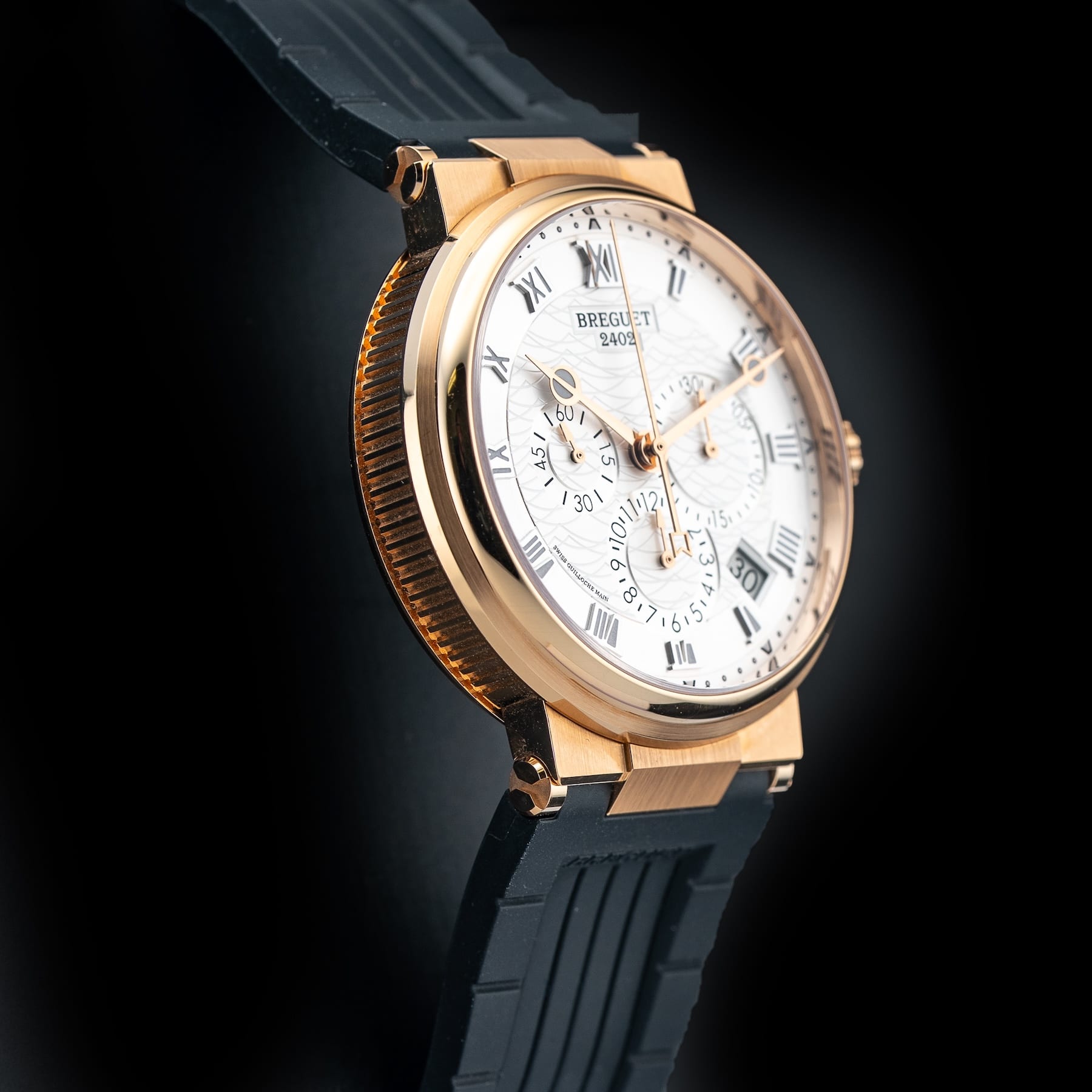 This Breguet Marine Chronograph 5527BR/12/9WV is in GREAT condition. This watch includes its original box, original papers, and warranty dated for 08/07/2024. Extra Strap. This watch has been fully authenticated and certified by Exquisite Timepieces. Please note, the photos shown are of the actual watch you will receive.