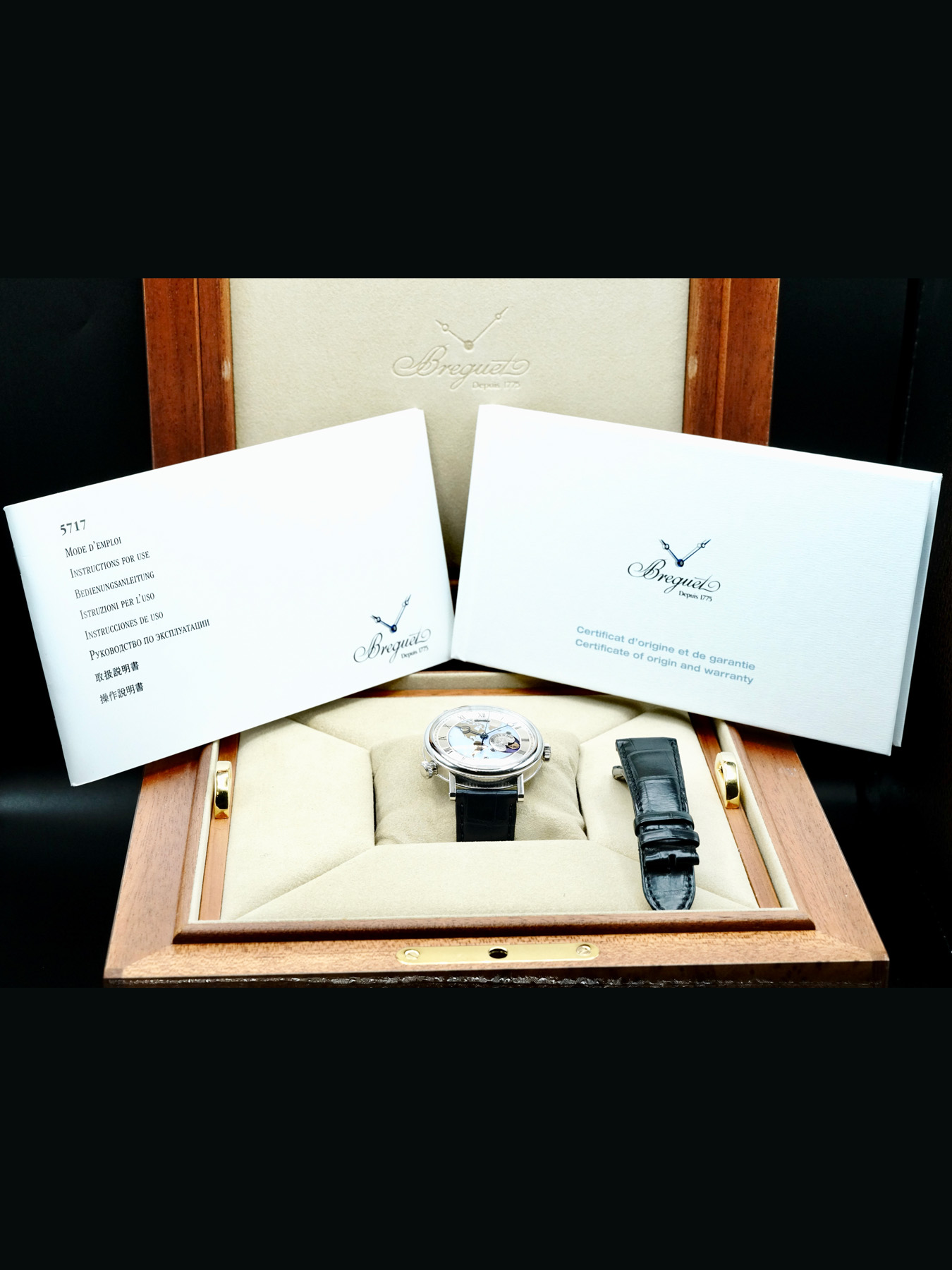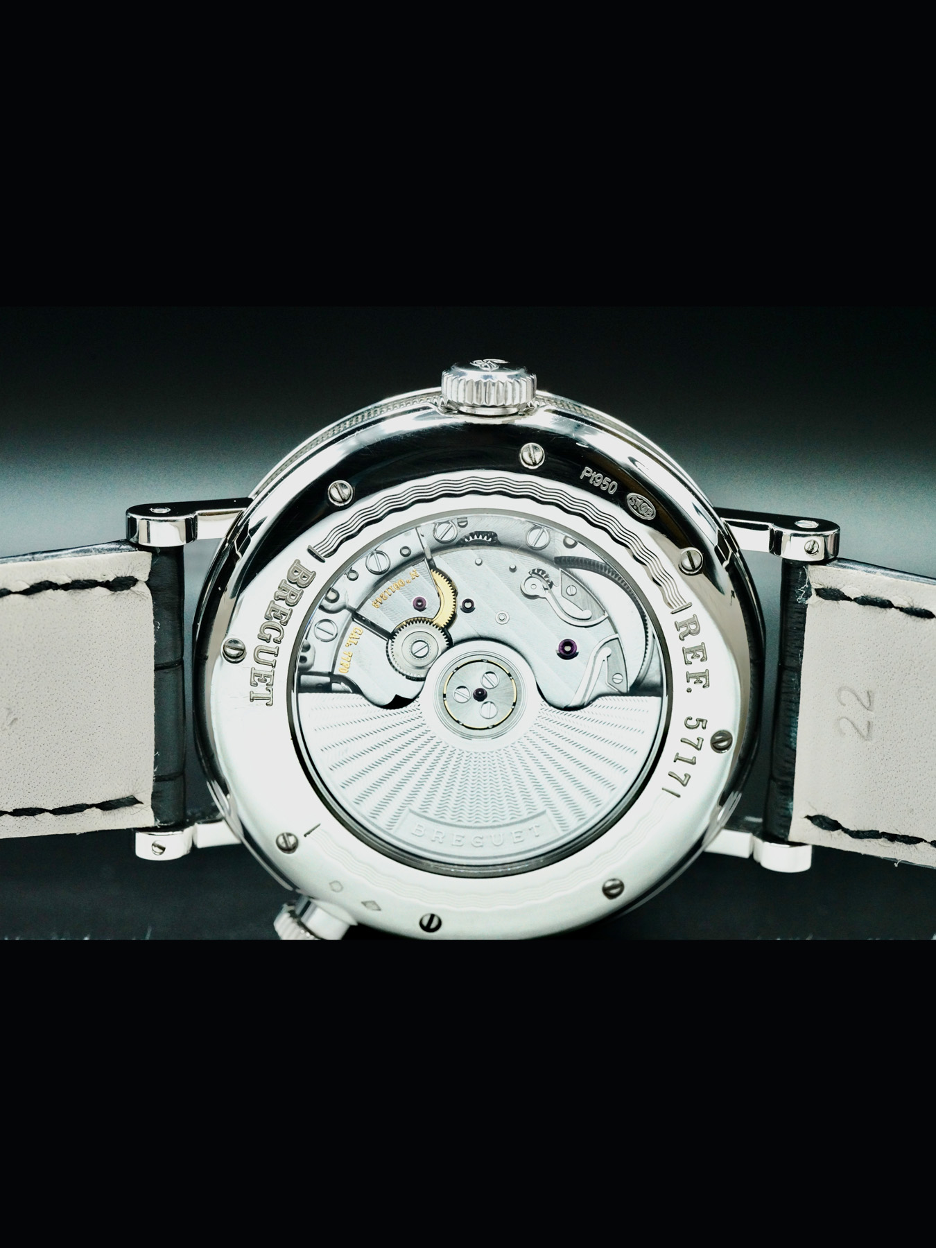 This Breguet Classique 5717PT/US/9ZU is in GREAT condition. This watch includes its original box, papers, and warranty dated for 2023. Extra black leather strap. This watch has been fully authenticated and certified by Exquisite Timepieces.