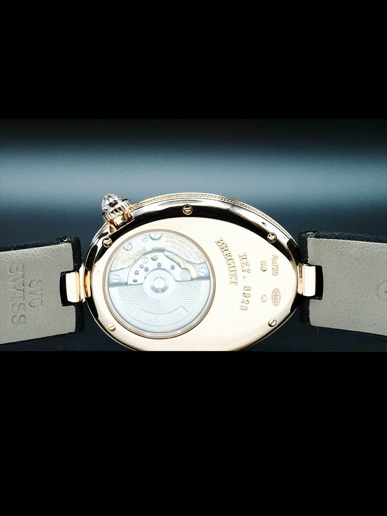 This Breguet Reine de Naples 8928BR/51/844/DD0D is in EXCELLENT condition. This watch includes its original box, instruction manual, and warranty dated for 2016. Extra black leather strap. This watch has been fully authenticated and certified by Exquisite Timepieces.