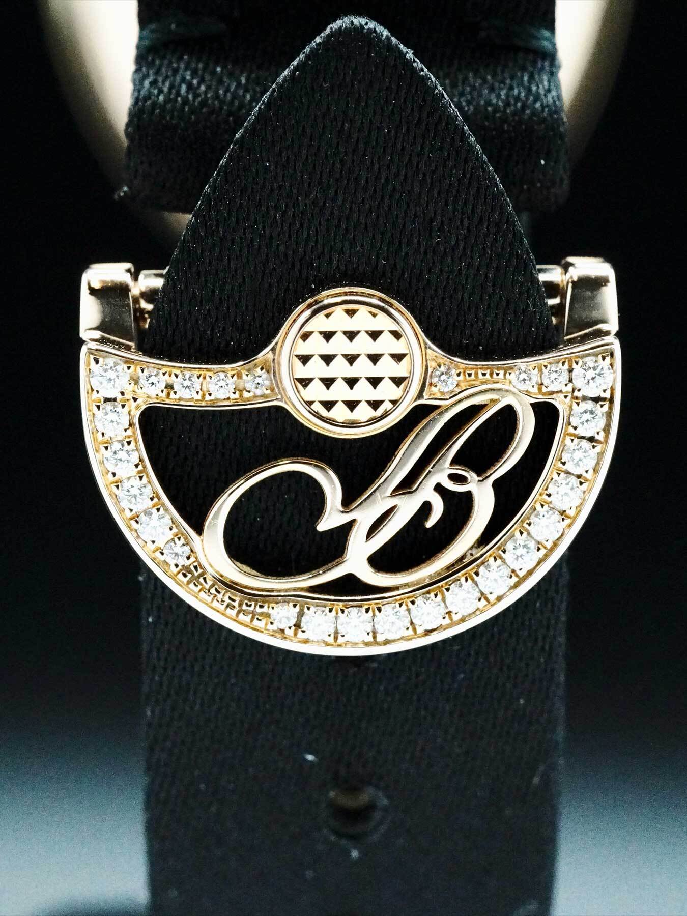 This Breguet Reine de Naples features a 33mm 18k rose gold case with a diamond-set bezel on a black satin strap. This watch also sports a white mother of pearl dial with blue hands and Roman numeral dial markers covered by scratch resistant sapphire crystal.