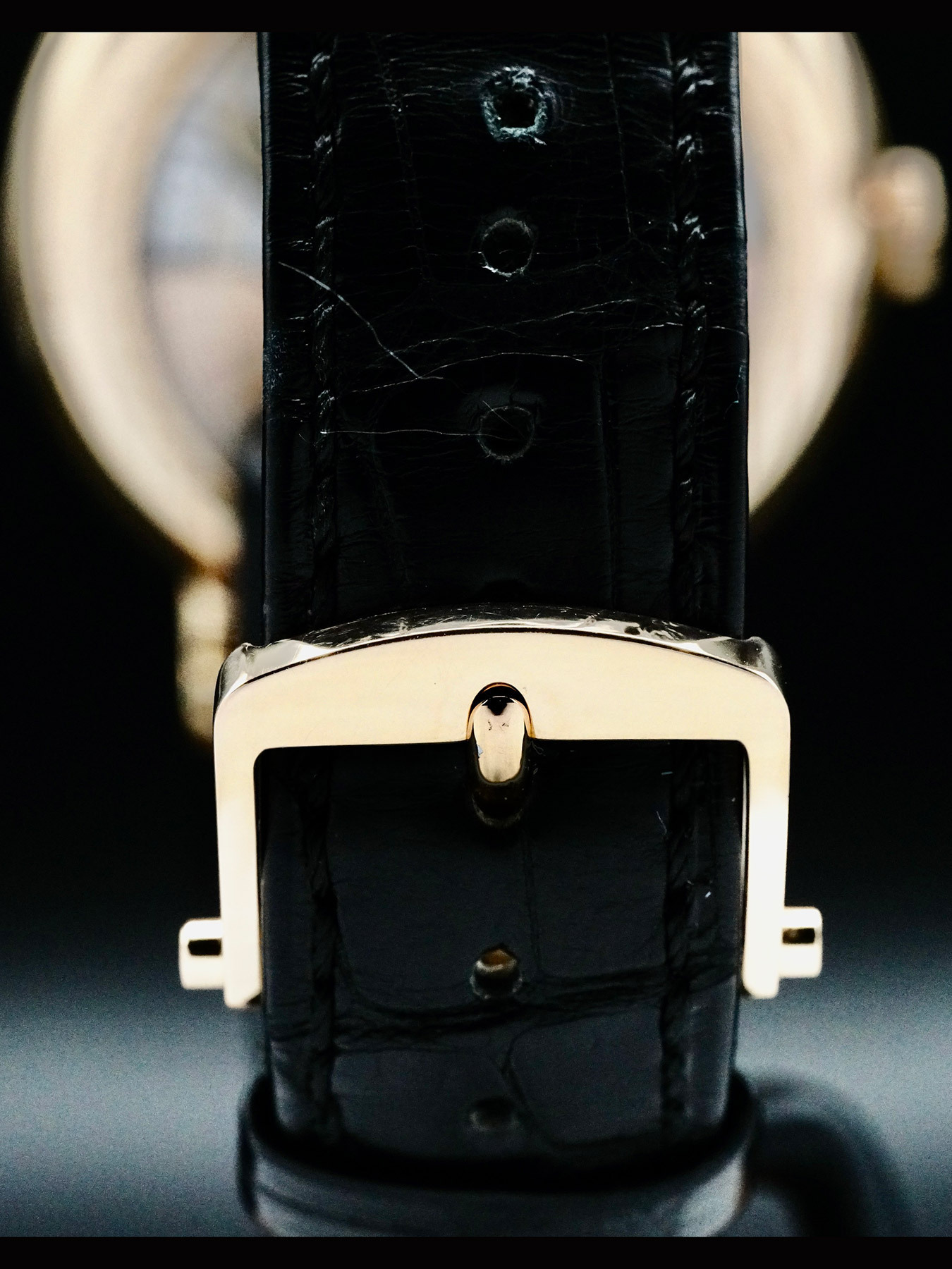 This Breguet Classique features a 38mm 18k rose gold case with a display case back on a brown leather strap. This watch also sports a silver dial with blued "Breguet" style hands and Roman numeral dial markers covered by scratch resistant sapphire crystal.