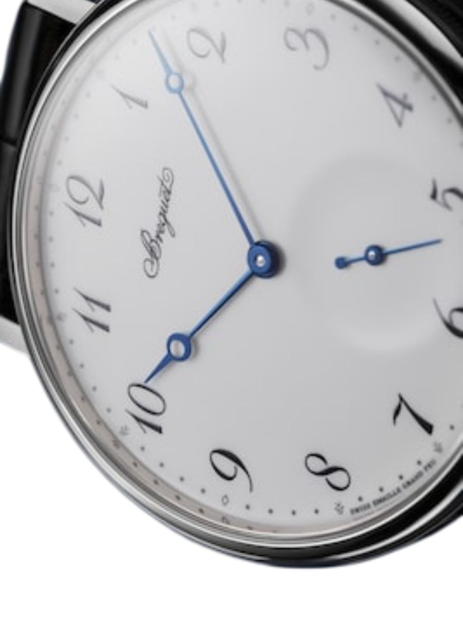 Dial in “Grand Feu” enamel. Signed Breguet. Hours chapter with Arabic Breguet numerals. Small seconds offset at 5 o’clock. Breguet open-tipped hands in blued steel.