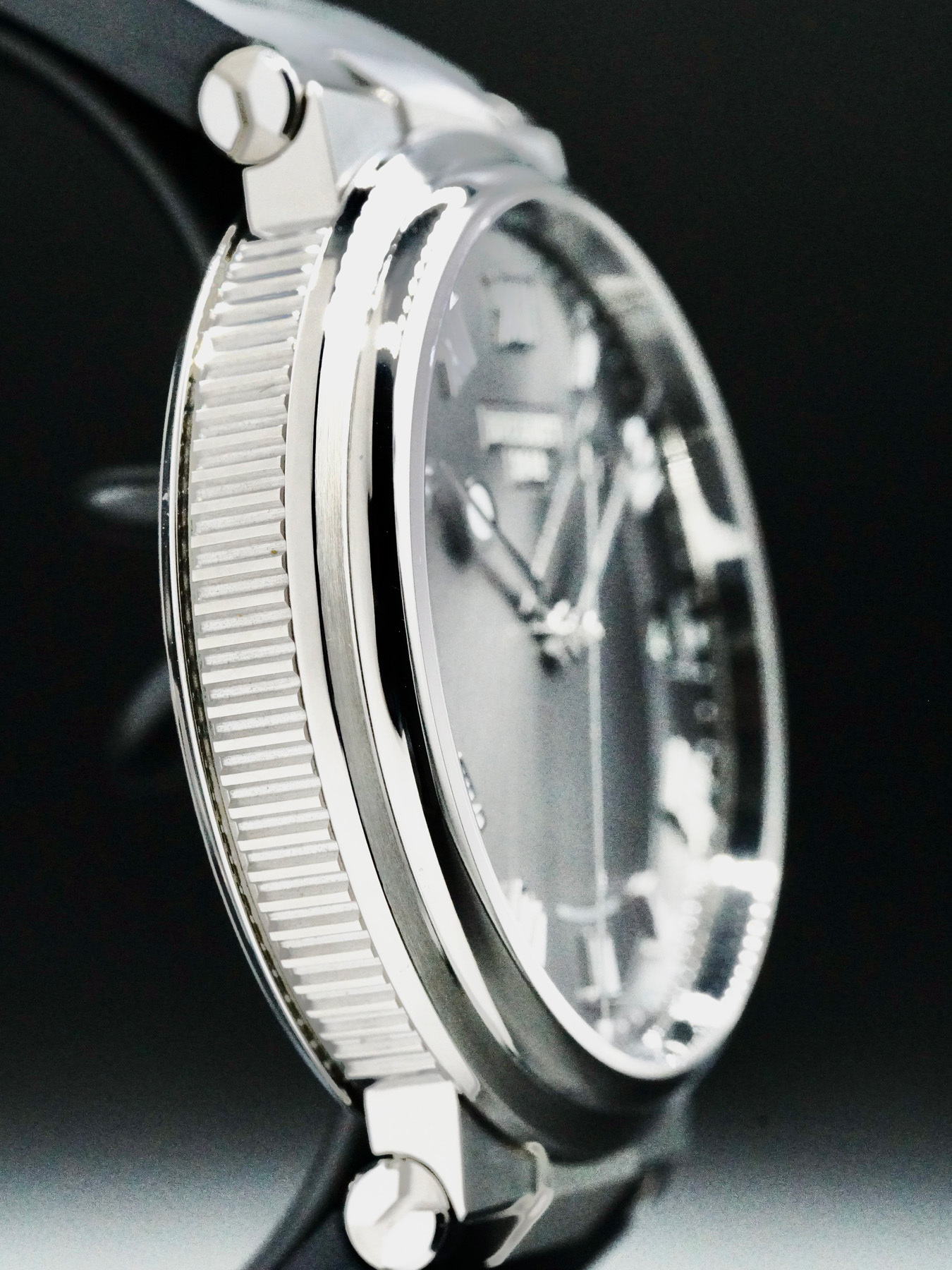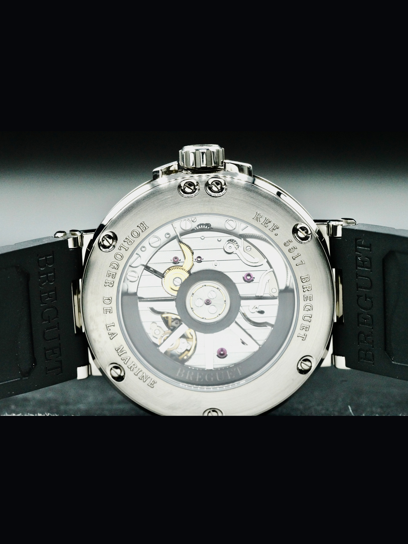 This Breguet Marine features a 40mm titanium case with a display case back on a black rubber strap. This watch also sports a sunburst slate grey dial with silver hands and Roman numeral dial markers covered by anti-reflective sapphire crystal.