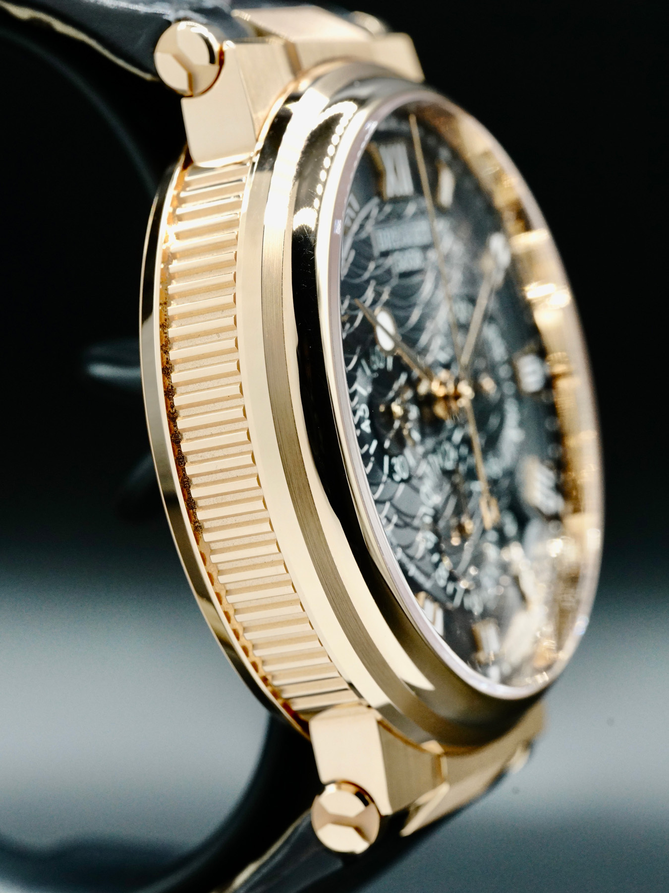 This watch features a 42.3mm rose gold case on alligator leather strap. This watch also sports a slate dial.