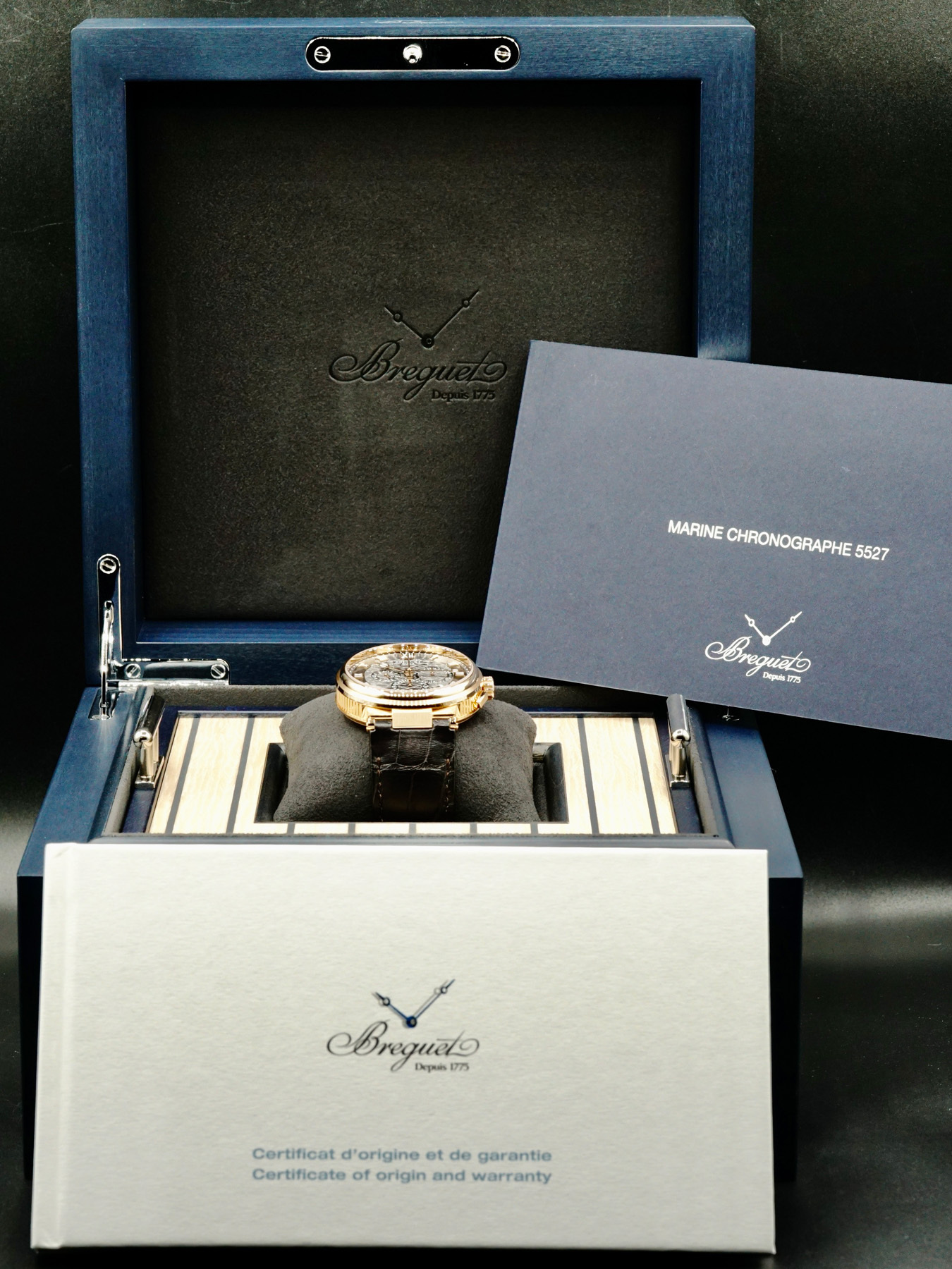 This Breguet Marine 5527BR/G3/9WV is in EXCELLENT condition. It has all boxes and papers.Certificate of origin & warranty dated for November 2022