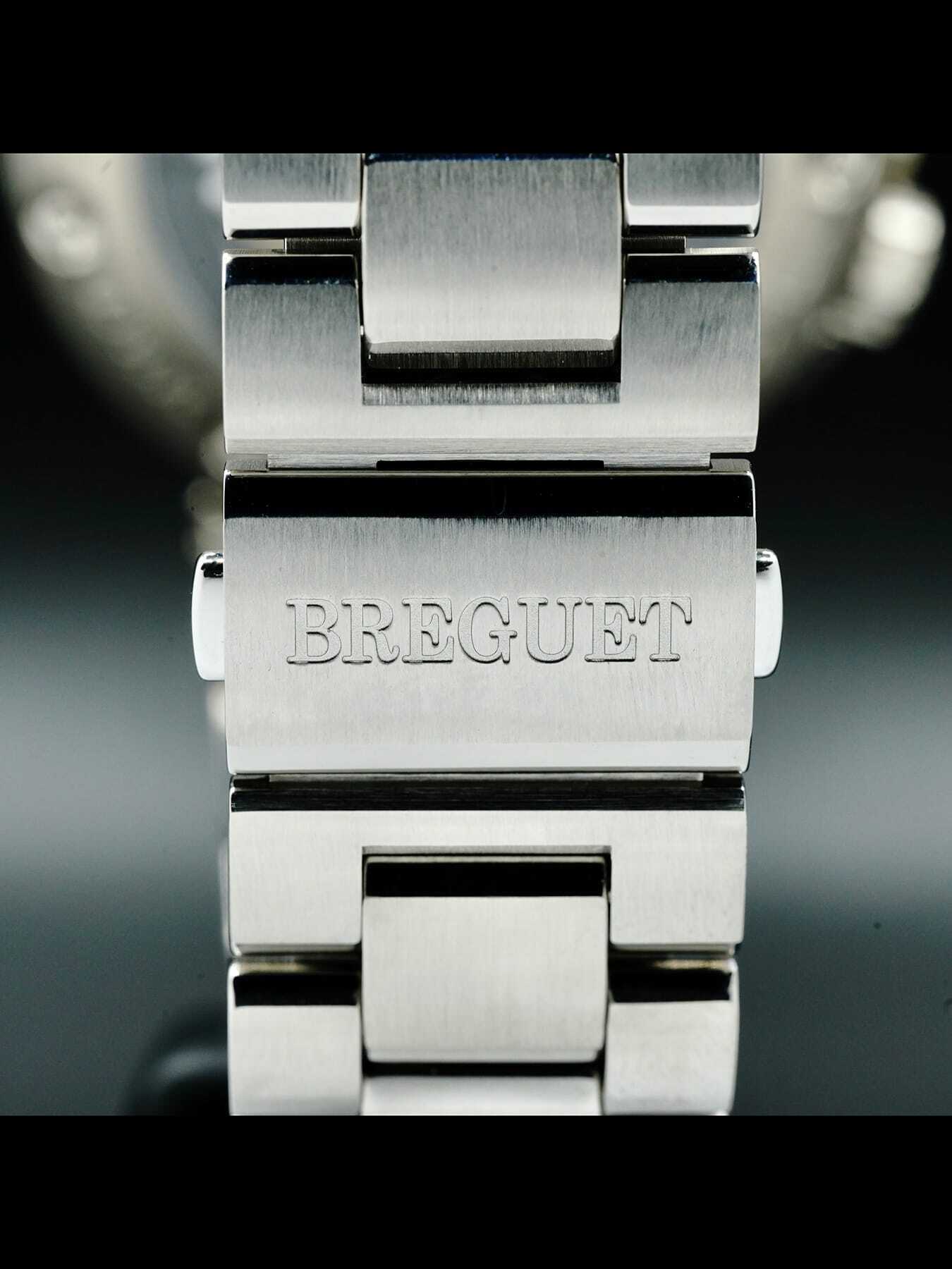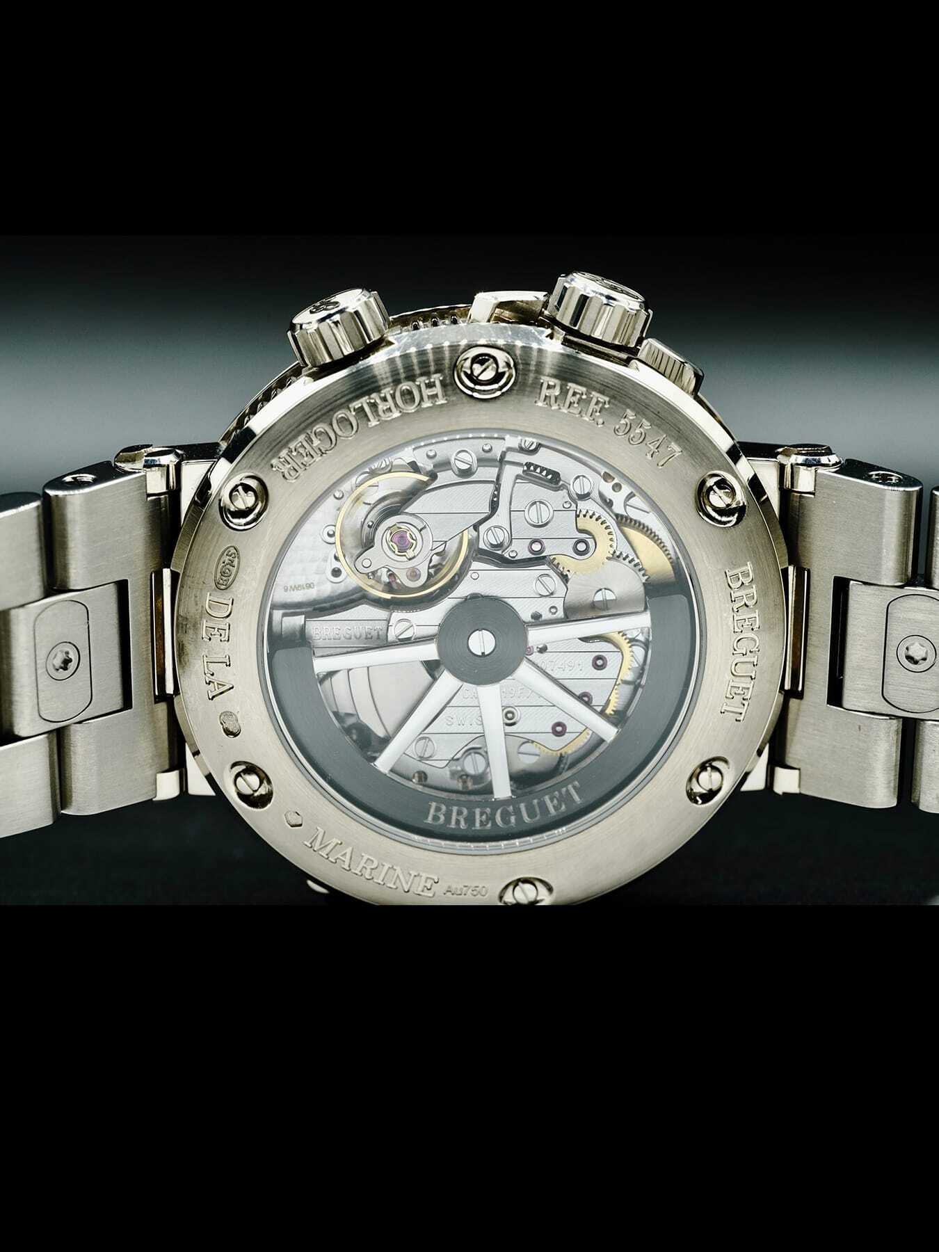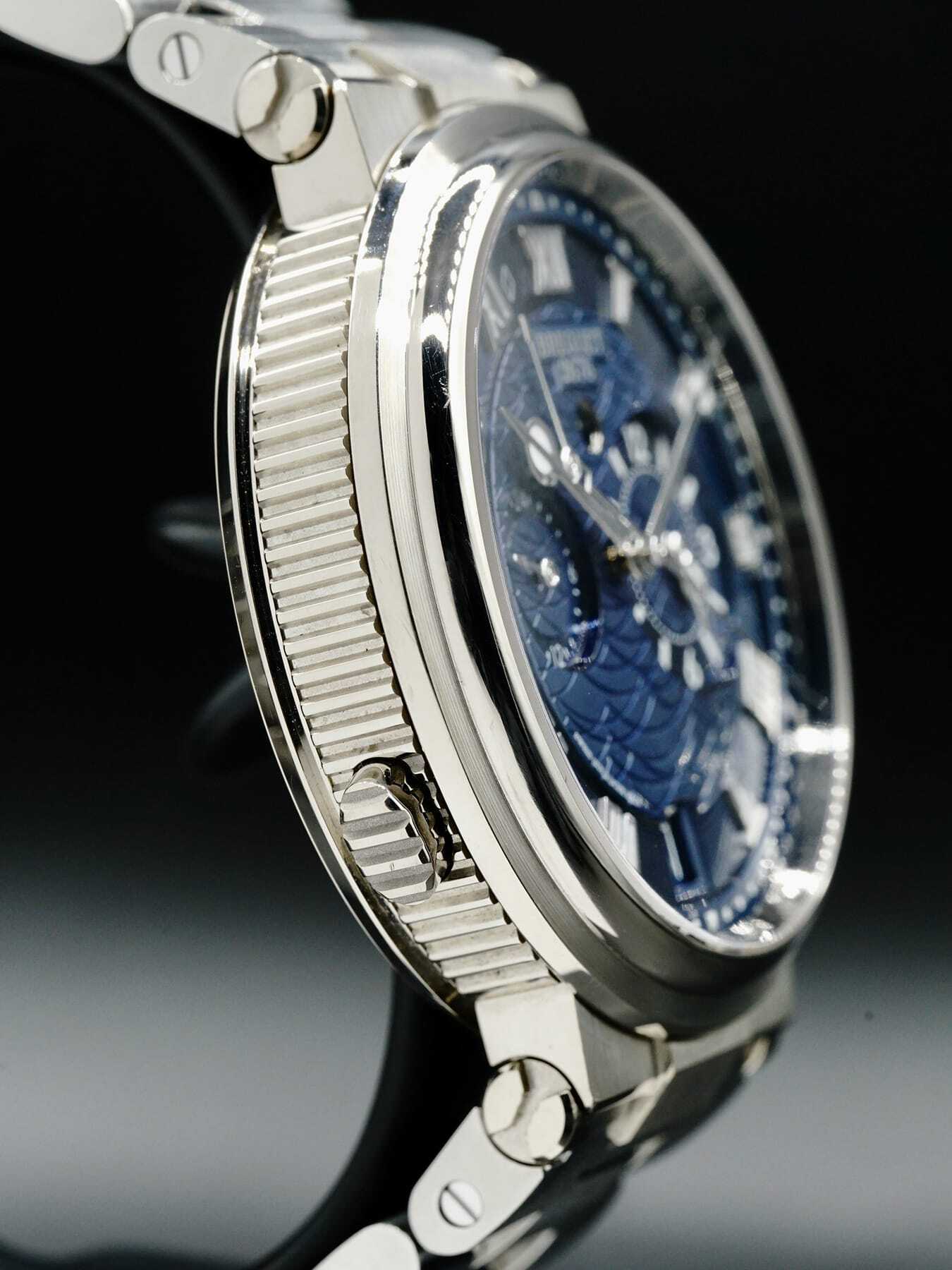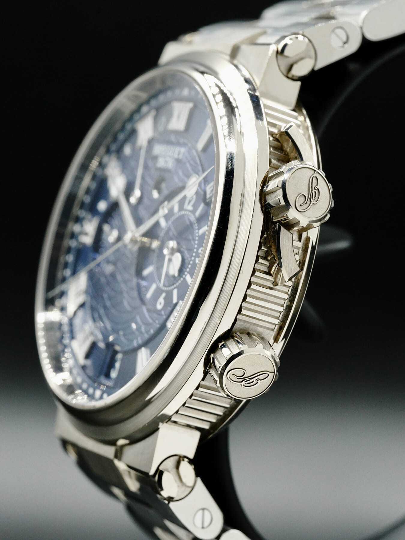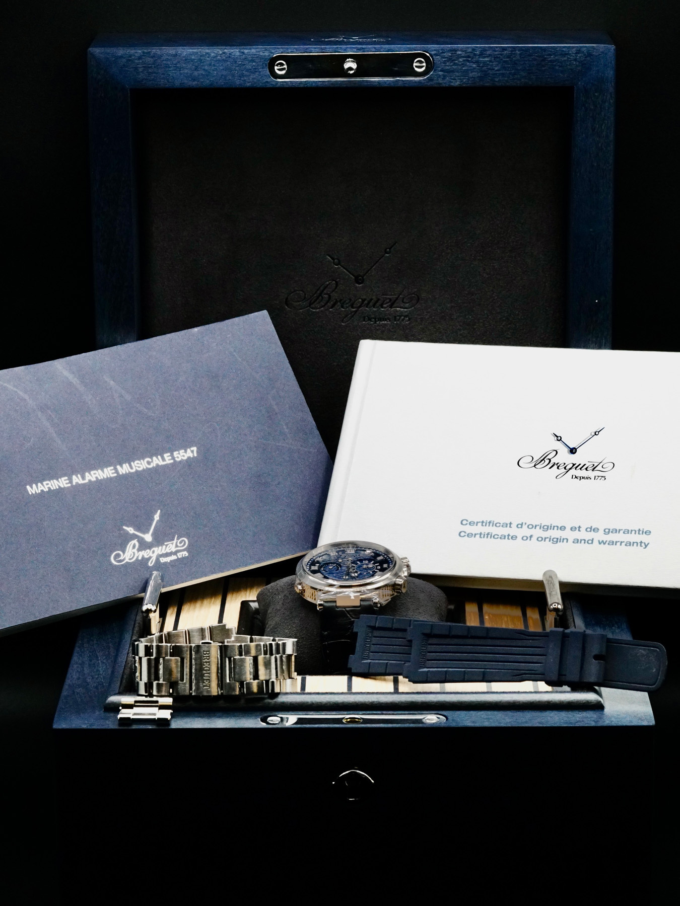 This Breguet Marine Alarme Musicale 5547BB/Y2/9ZU is in GREAT condition. it has boxes and papers. Certificate of Origin & Warranty dated for April 2020. Extra blue rubber strap, blue leather strap, and titanium bracelet links. Note: The watch is white gold. It came on a rubber strap. The client then bought an extra titanium bracelet to go on the watch.