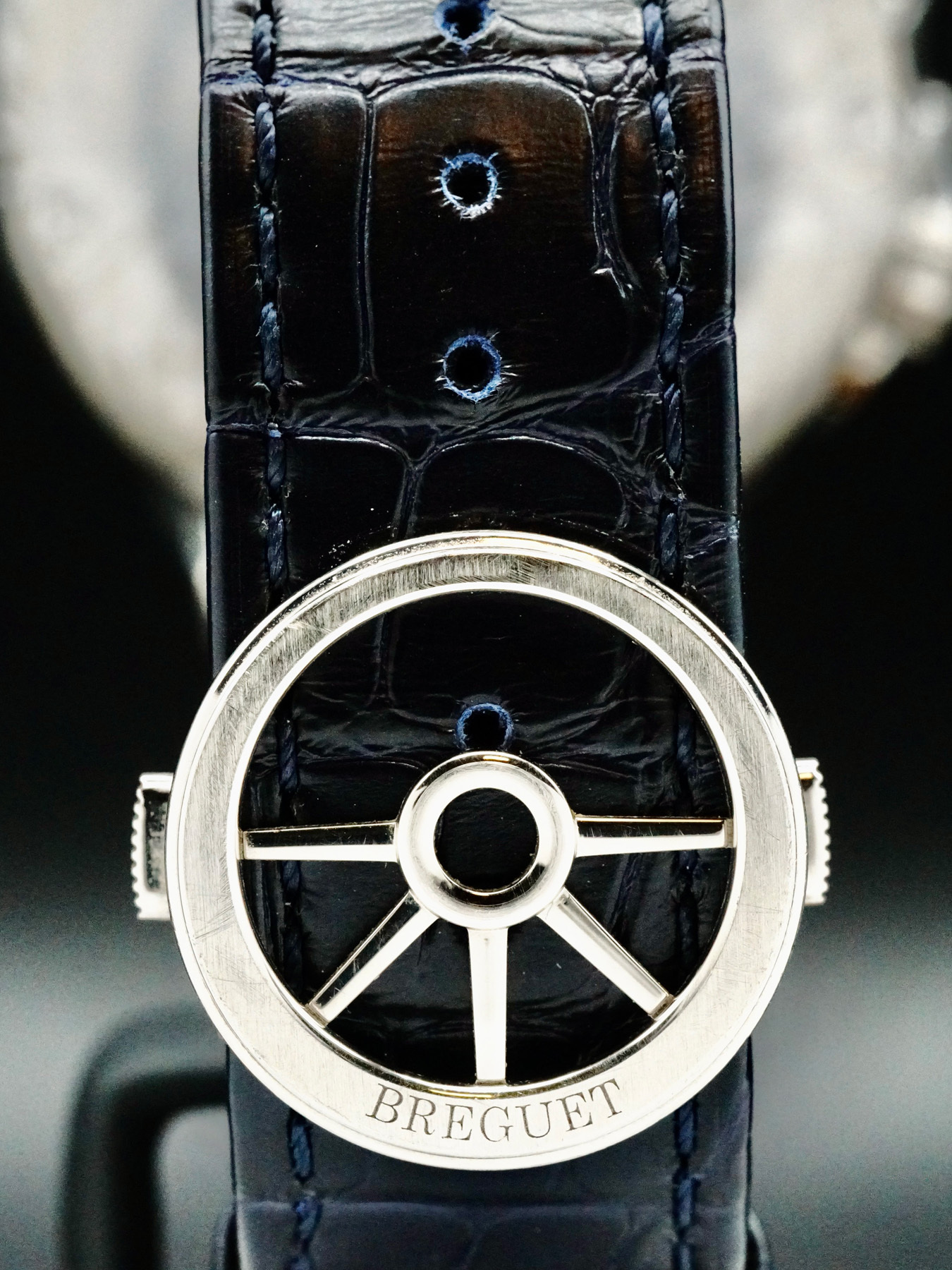 This Breguet Marine Alarme Musicale 5547BB/Y2/9ZU features a 40mm 18k white gold case with exhibition caseback on alligator leather strap. This watch also sports a blue dial with Breguet hands and roman numerlas.