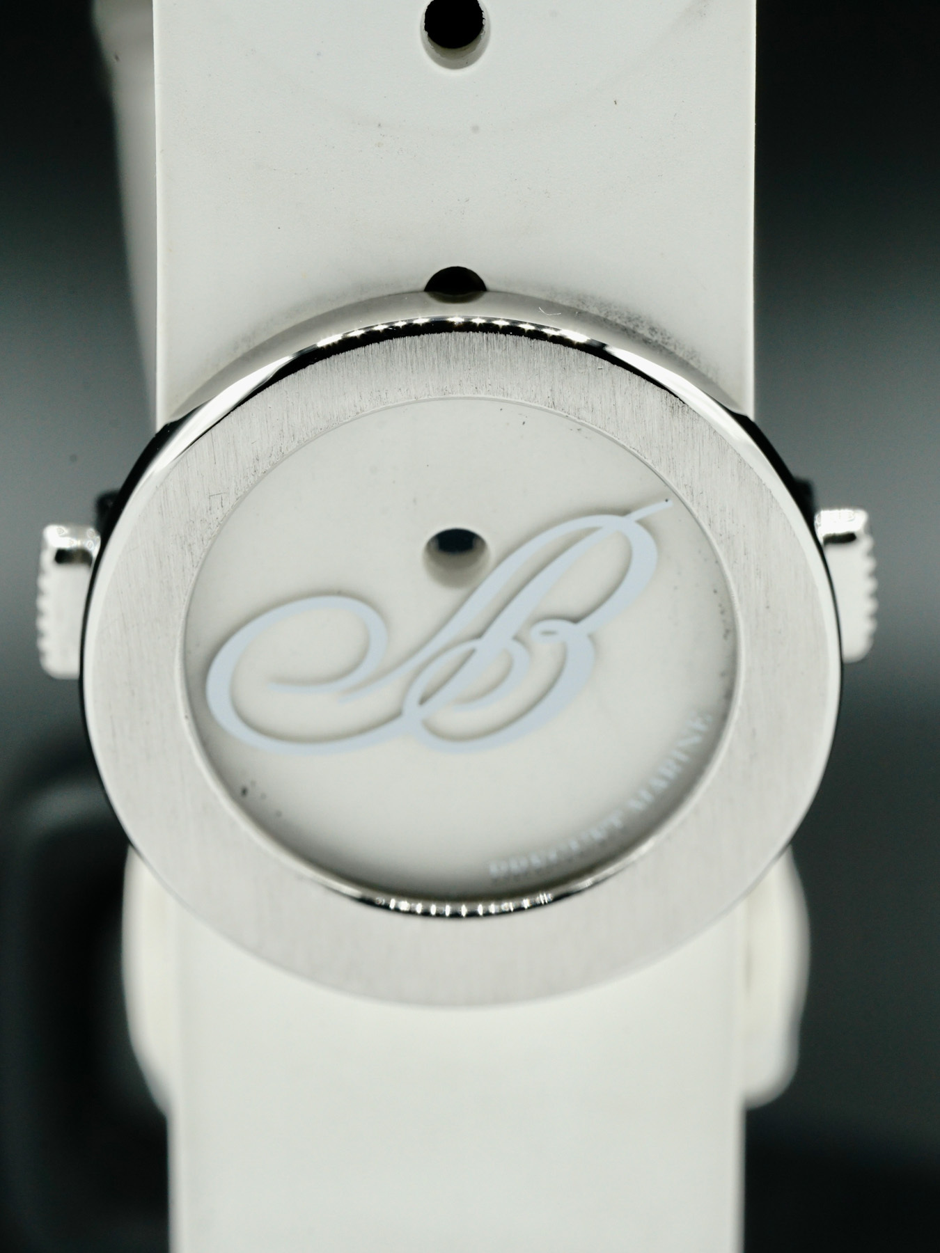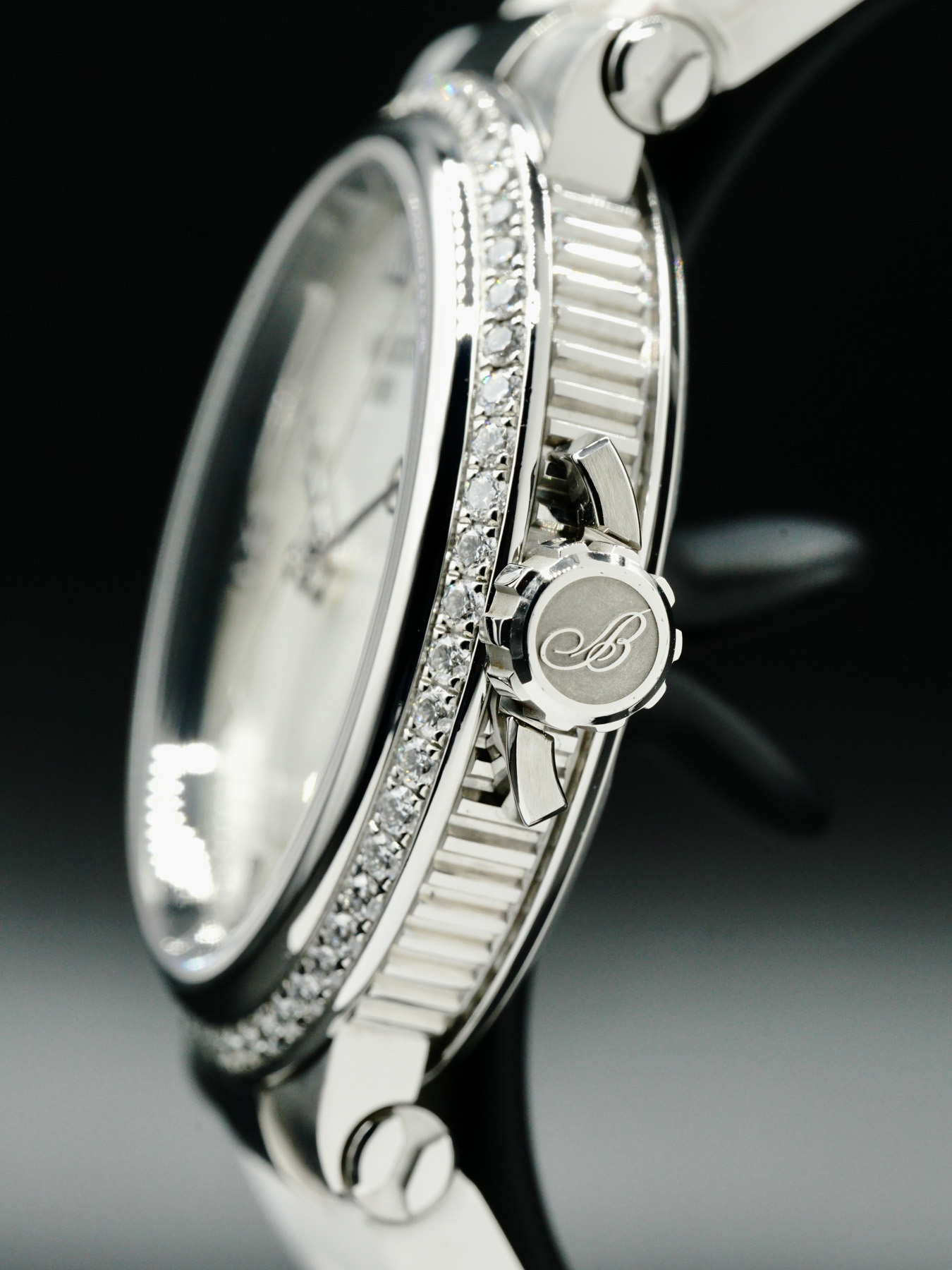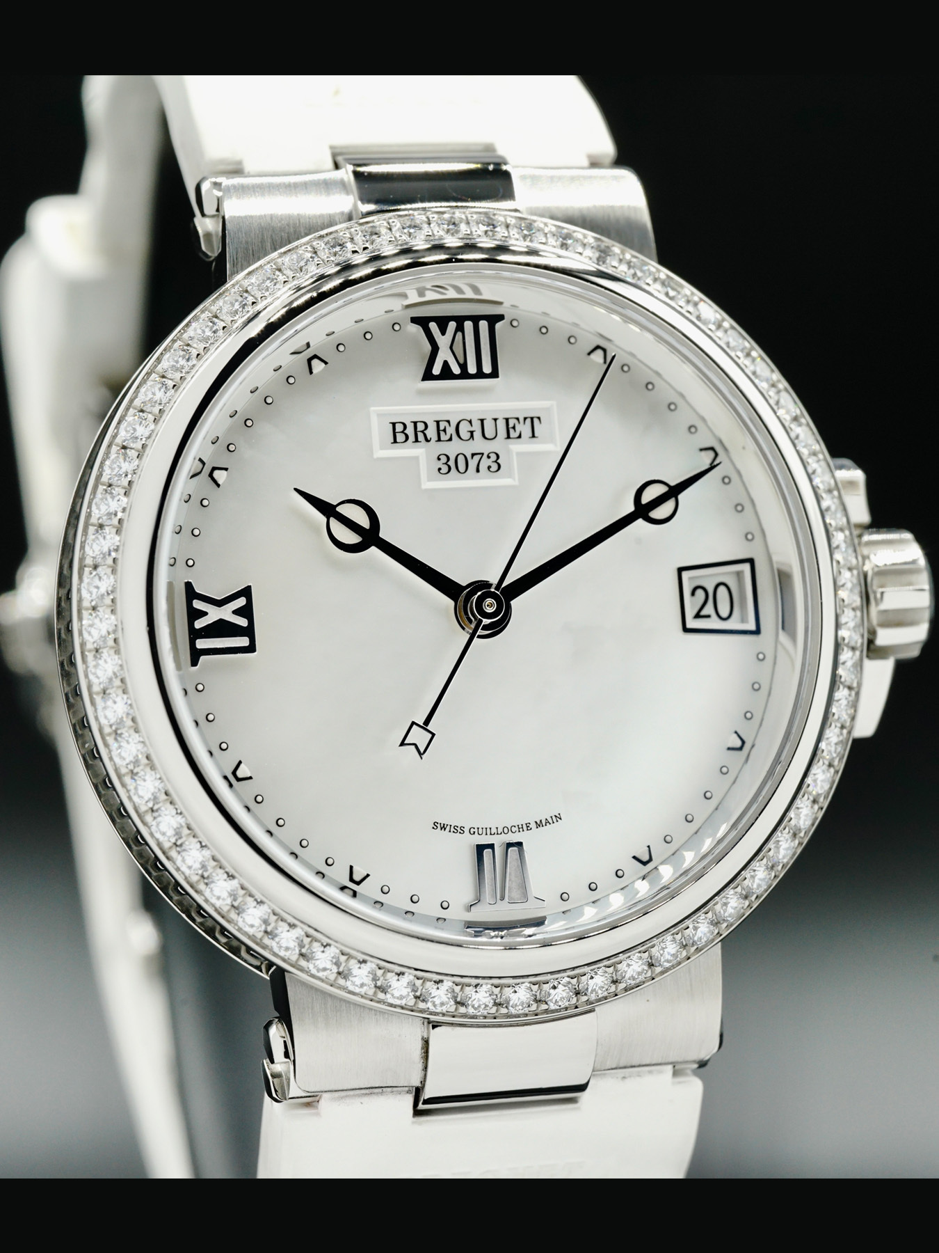 This Breguet Marine features a 33.8mm stainless steel case with bezel set with 60 diamonds, approximately 0.846ct, on a white rubber strap. This watch also showcases a white mother-of-pearl dial with polished hands and Roman numeral dial markers covered by scratch resistant sapphire crystal.