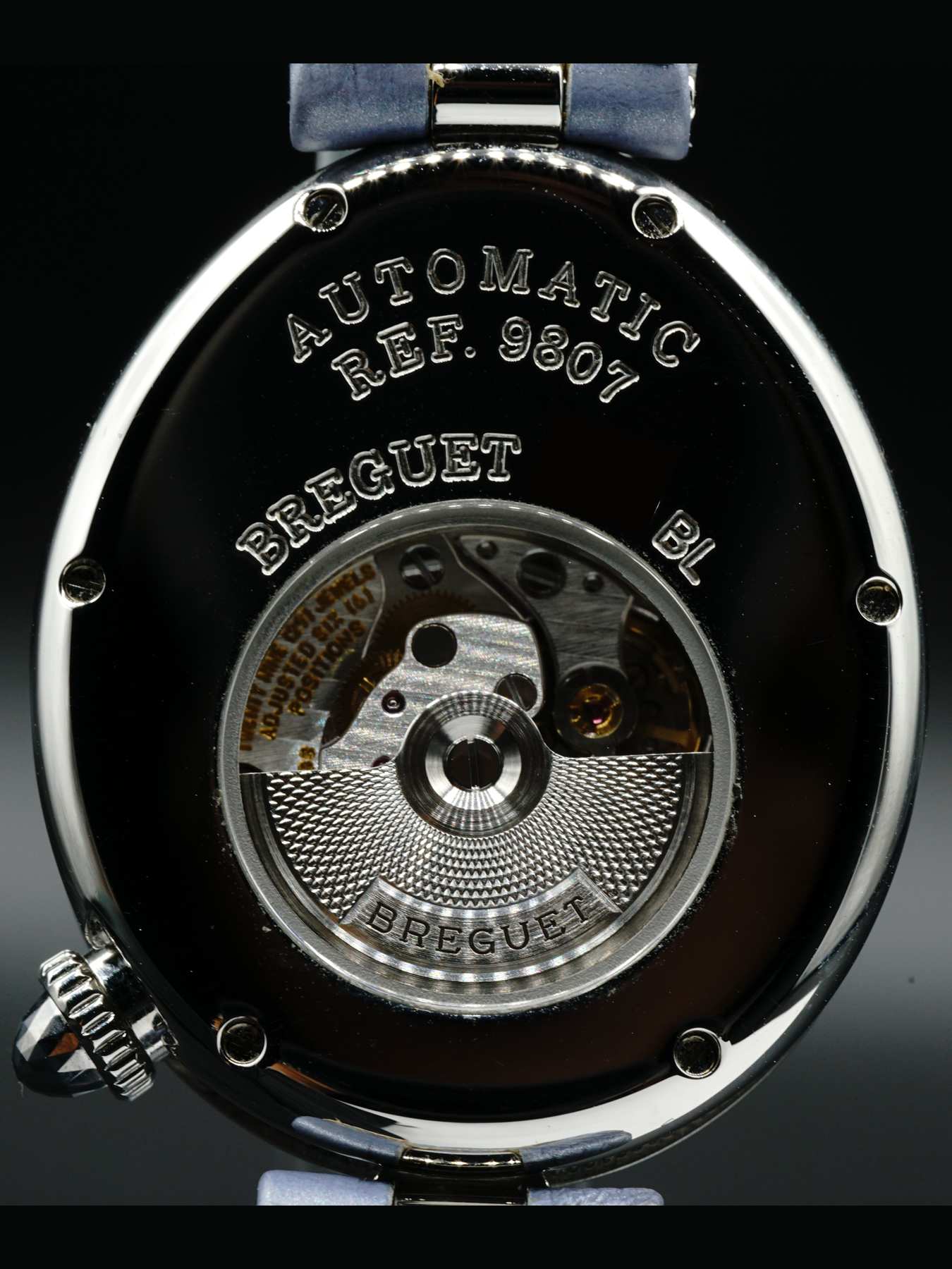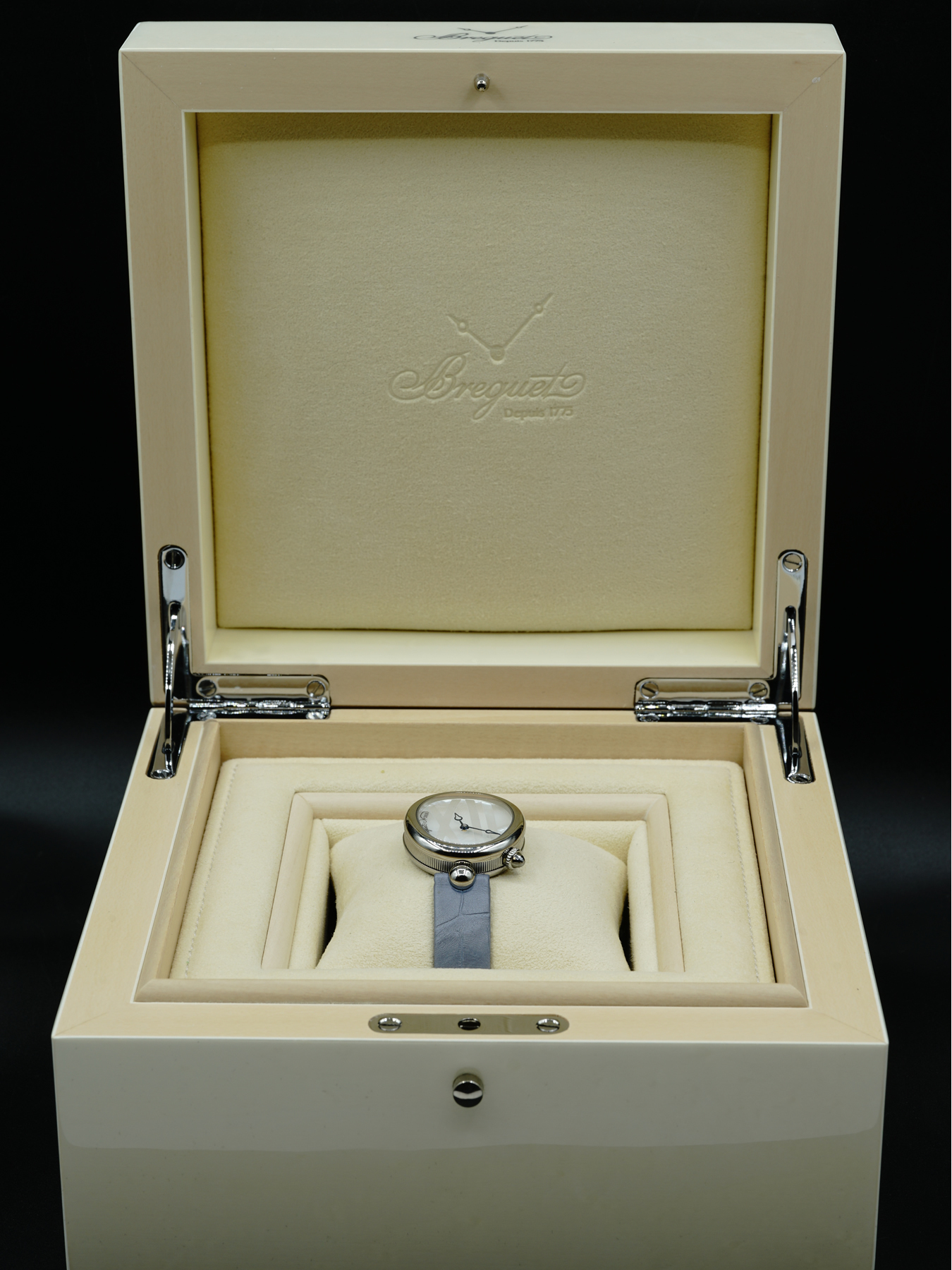 This Breguet Reine De Naples 9807ST/5W/9 is in EXCELLENT condition. This watch includes its original box, papers, and certificate of origin and warranty.