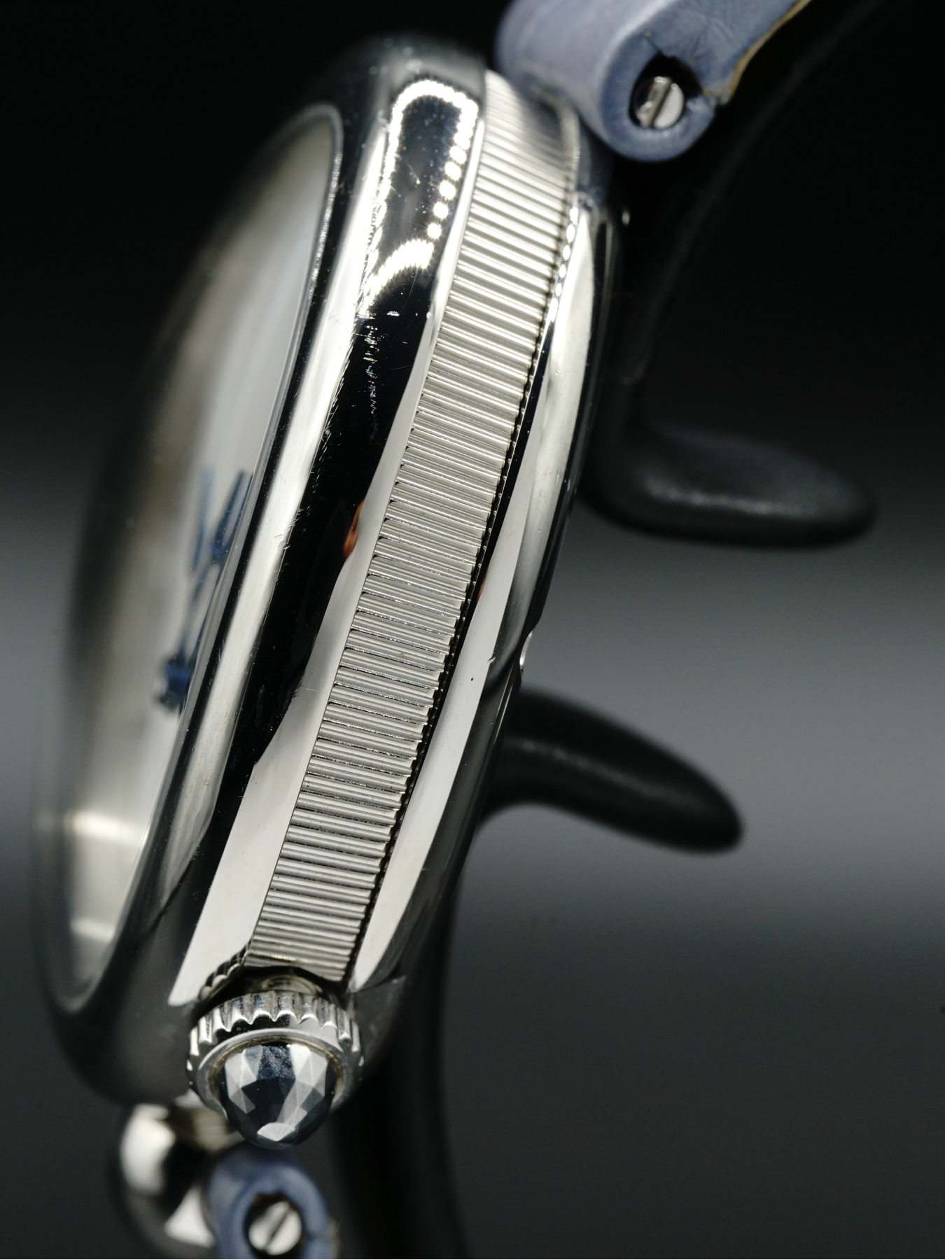 Case in steel, cambered ovoid with a delicately fluted caseband. Sapphire-crystal caseback. Dimensions 32.7 x 27.3mm. Water resistant to 3 bar (30m). Dial in grained natural white mother-of-pearl. Off-centre chapter ring at 6 o'clock with Roman numerals in white natural mother-of-pearl marquetry. Self-winding movement. Cal. 586/1. 40 hours power reserve. In-line Swiss lever escapement. Breguet balance on a silicon spring. Balance frequency 3Hz.