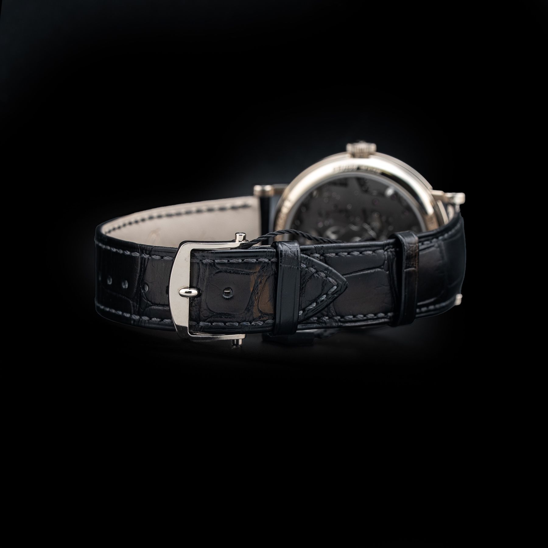 This watch features a 40mm 18-carat white gold case on leather strap. This watch also sports a silver dial. Powered by a self-winding movement. Water resistance up to 30 meters.