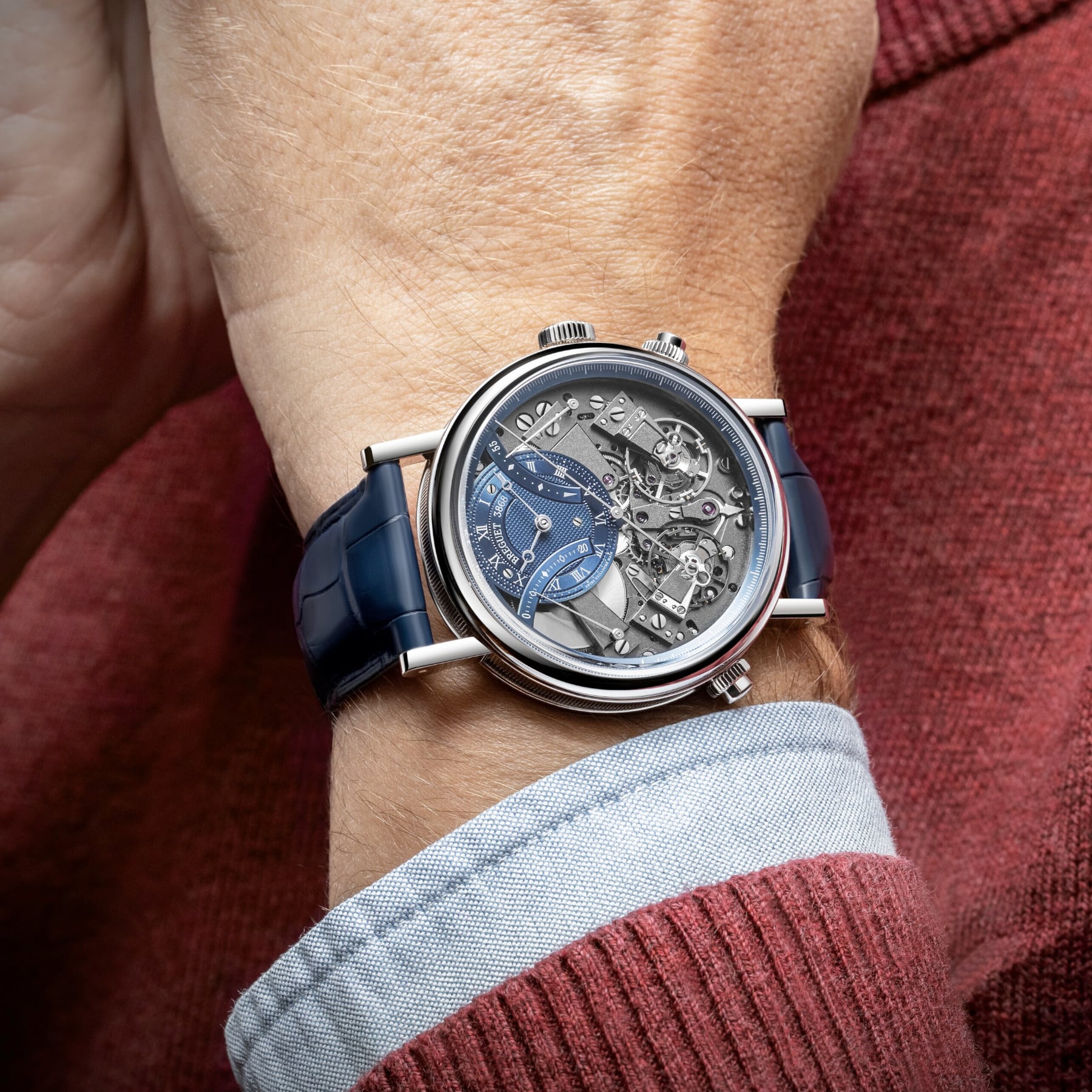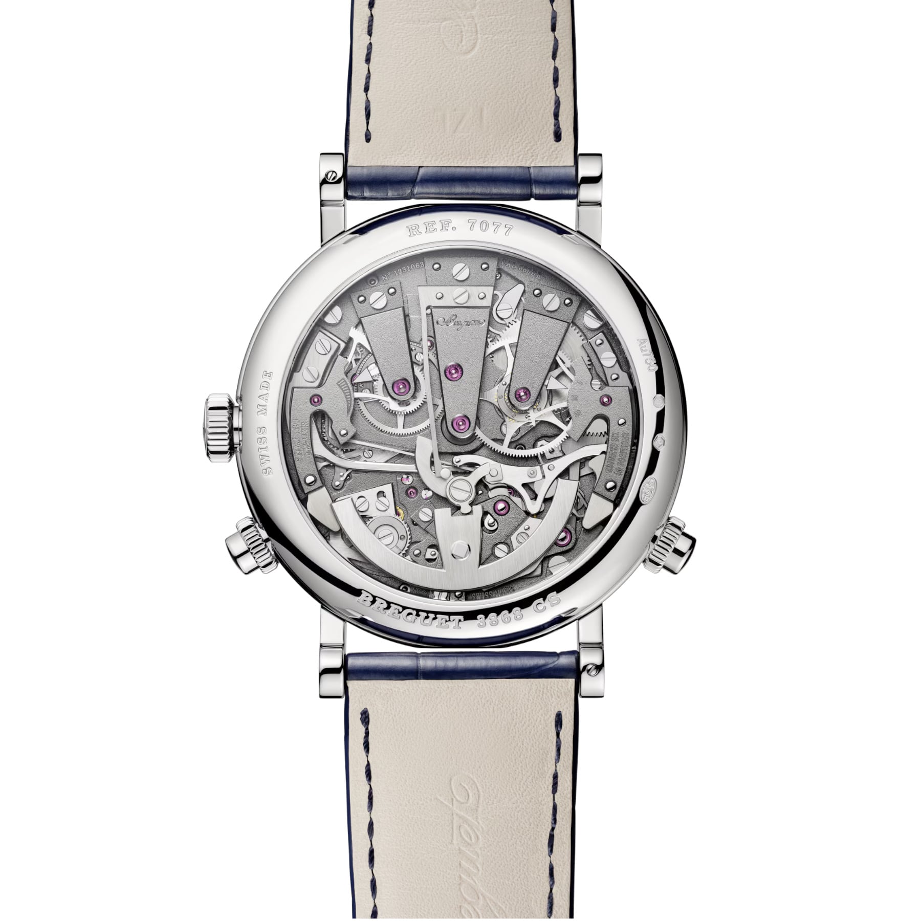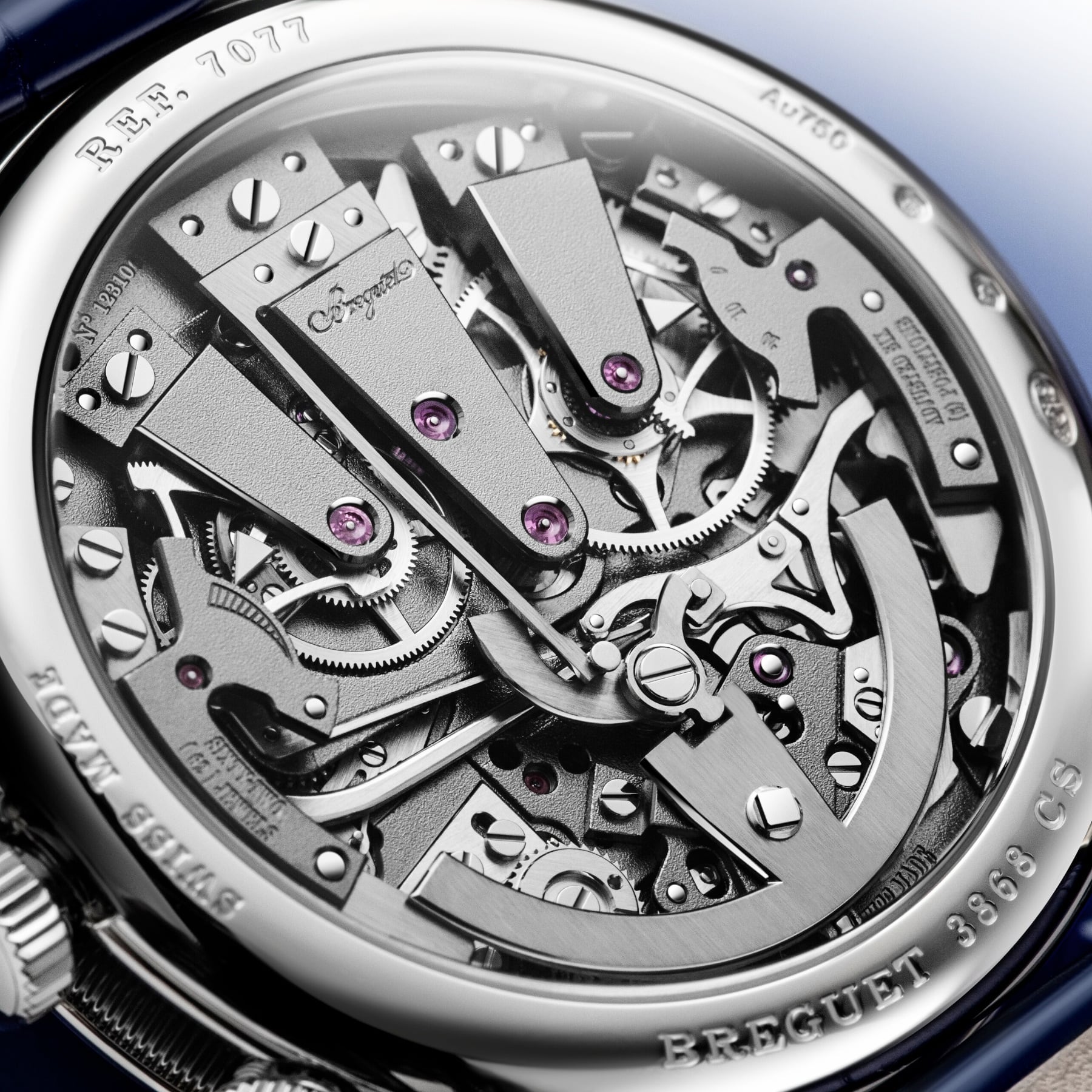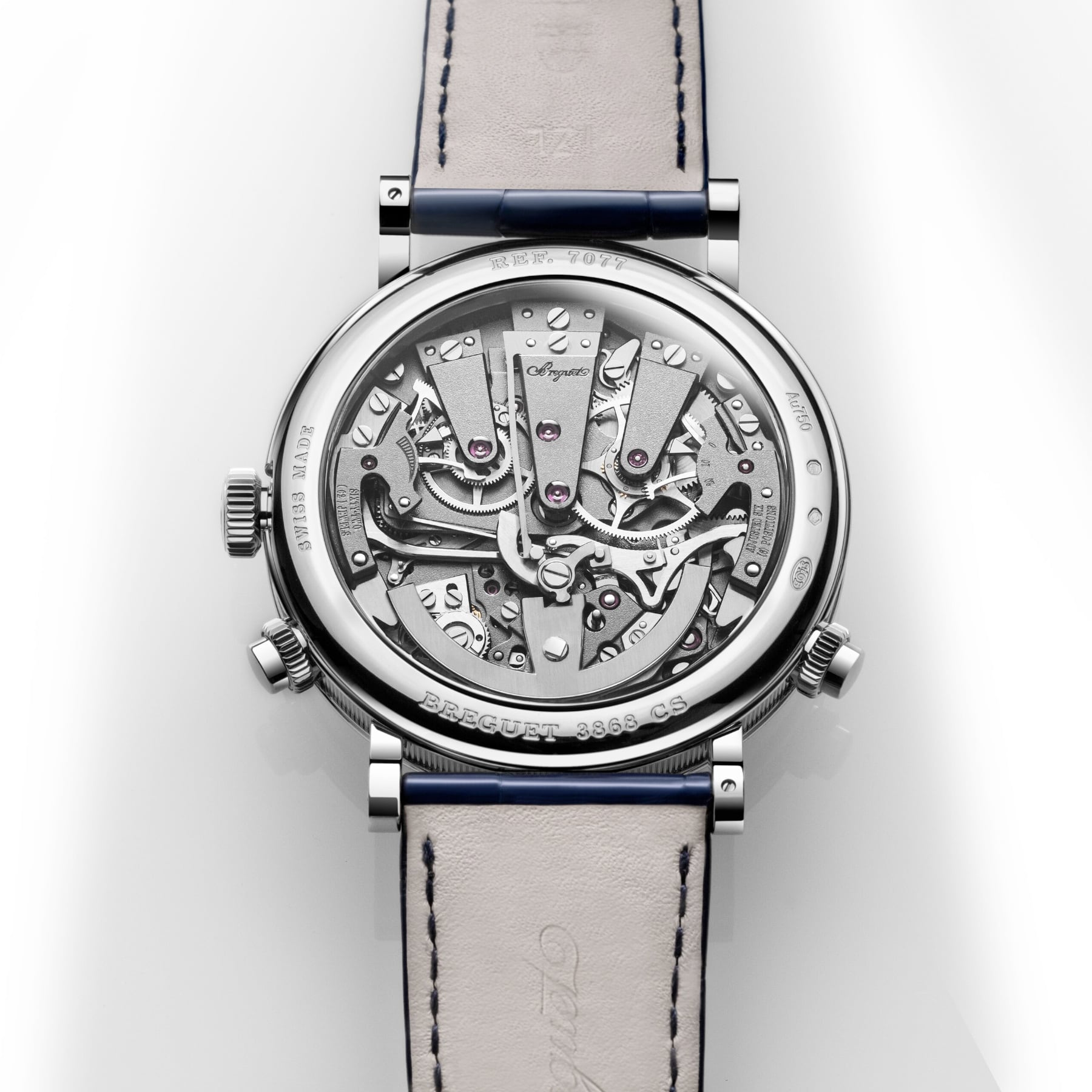The measurement of short intervals allows for an immediate glimpse of the function requested, but achieving this is a mechanical challenge, as engaging the chronograph can disrupt the proper functioning of the main gear train. The creation of two distinct gear trains solves this problem and provides greater precision to the different displays. In terms of aesthetics, the Tradition 7077 does not deviate from the rule and features an exceptional level of symmetry. The indicator to start the chronograph is located at 6 o’clock. At 2 o’clock and at 10 o’clock, in perfect opposition, retrograde hands indicate, respectively, the watch’s power reserve and the chronograph’s minutes counter, whereas at 4 o’clock and 8 o’clock the two balance-wheels face one another. The one devoted to the watch function operates at a frequency of 3 Hz, whilst the one dedicated to the chronograph operates at 5 Hz, for greater precision.