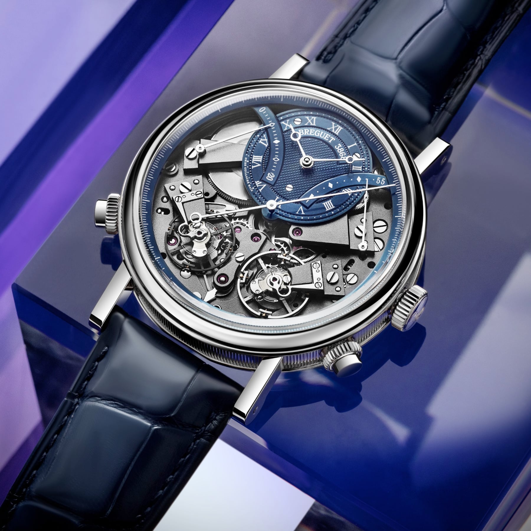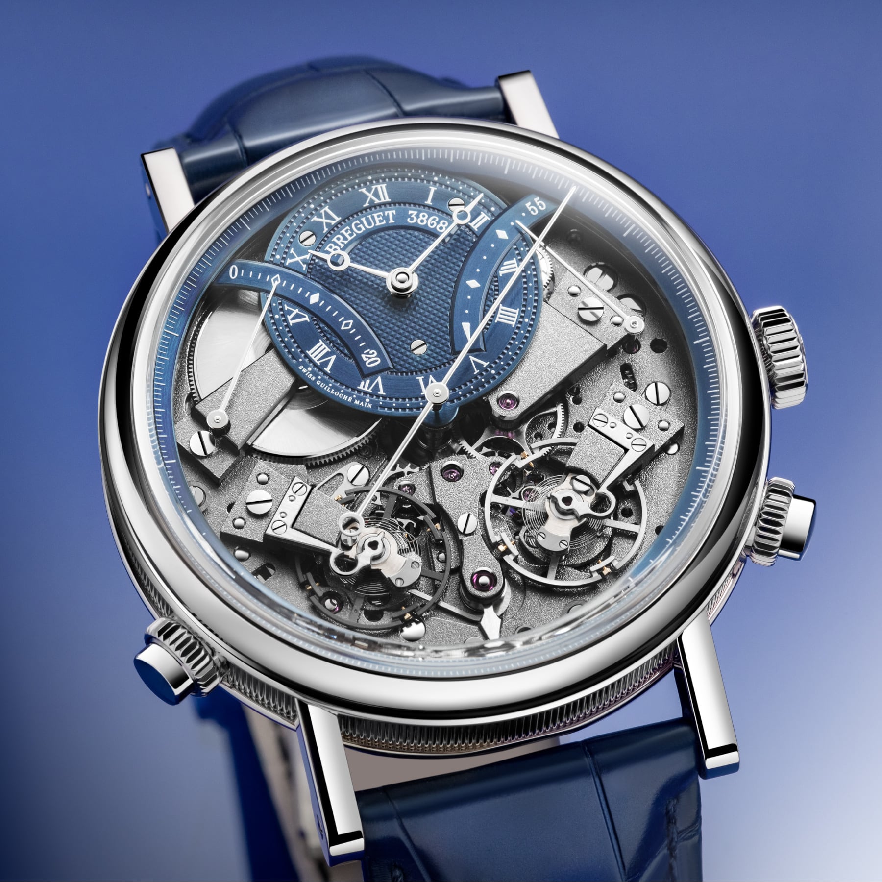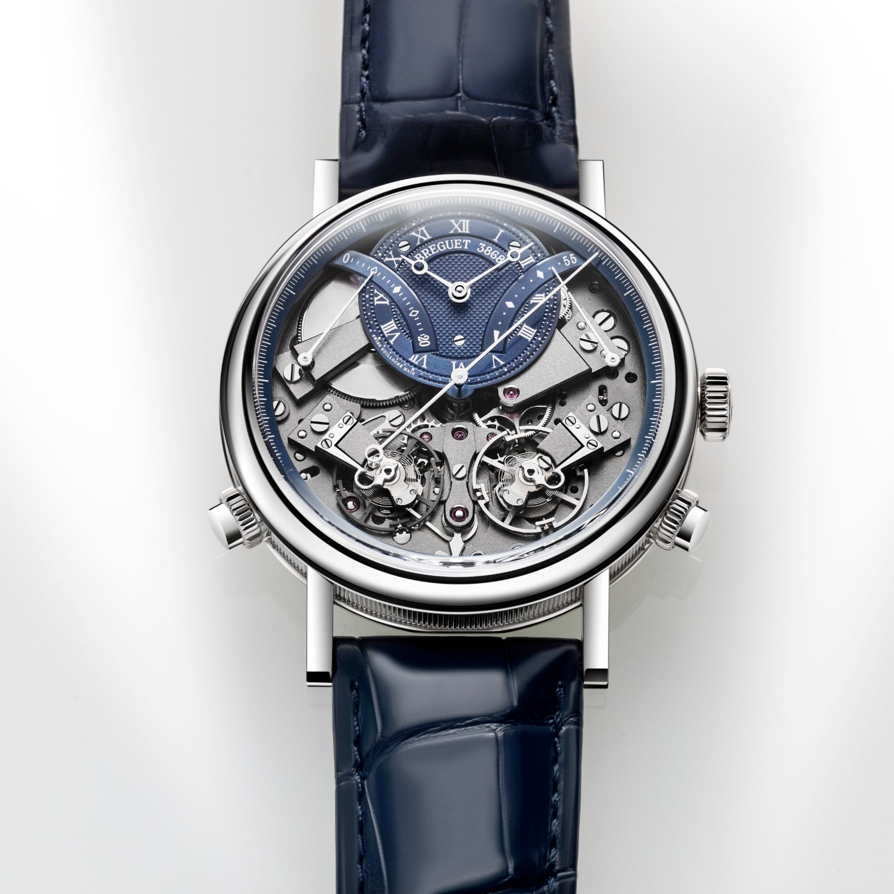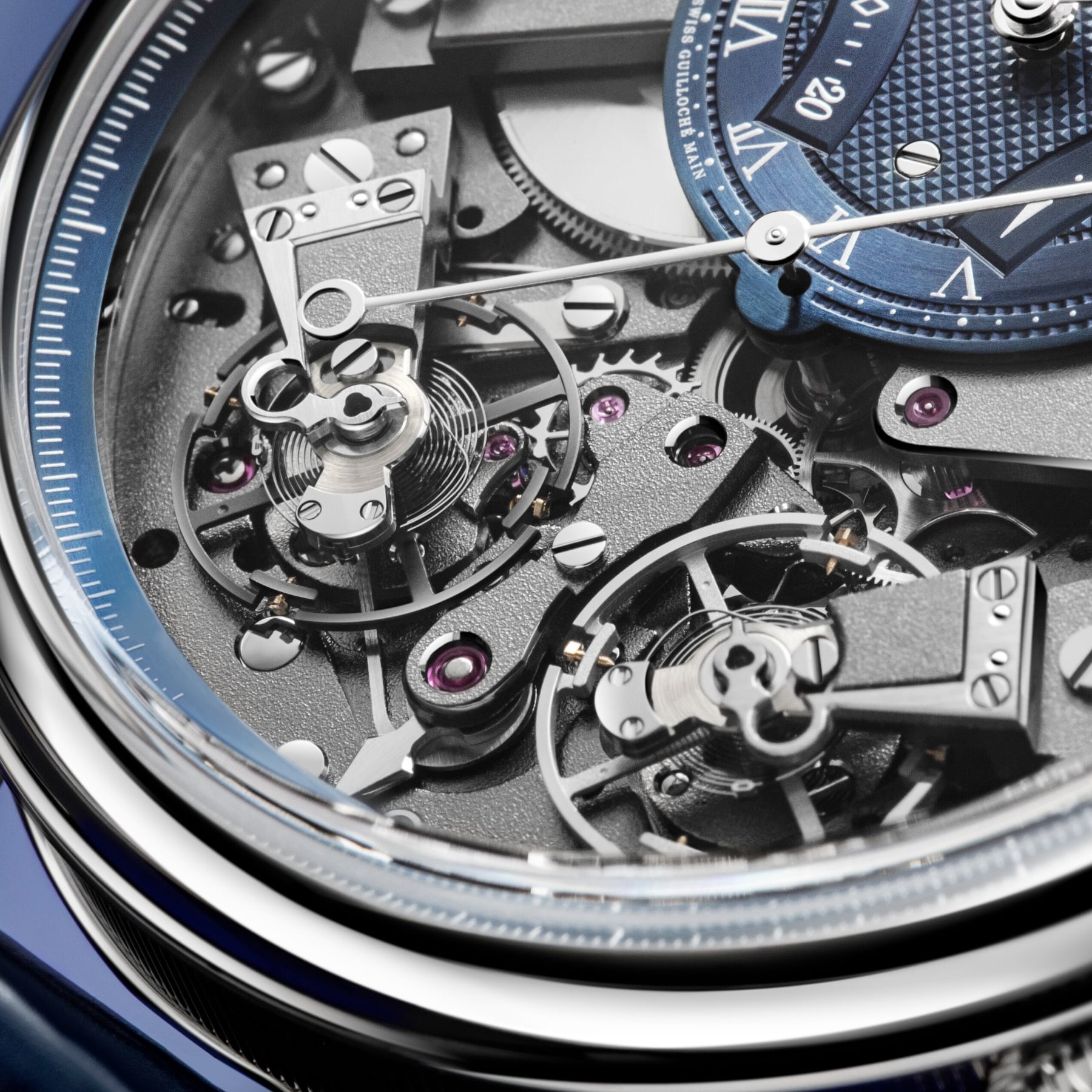 The measurement of short intervals allows for an immediate glimpse of the function requested, but achieving this is a mechanical challenge, as engaging the chronograph can disrupt the proper functioning of the main gear train. The creation of two distinct gear trains solves this problem and provides greater precision to the different displays. In terms of aesthetics, the Tradition 7077 does not deviate from the rule and features an exceptional level of symmetry. The indicator to start the chronograph is located at 6 o’clock. At 2 o’clock and at 10 o’clock, in perfect opposition, retrograde hands indicate, respectively, the watch’s power reserve and the chronograph’s minutes counter, whereas at 4 o’clock and 8 o’clock the two balance-wheels face one another. The one devoted to the watch function operates at a frequency of 3 Hz, whilst the one dedicated to the chronograph operates at 5 Hz, for greater precision.