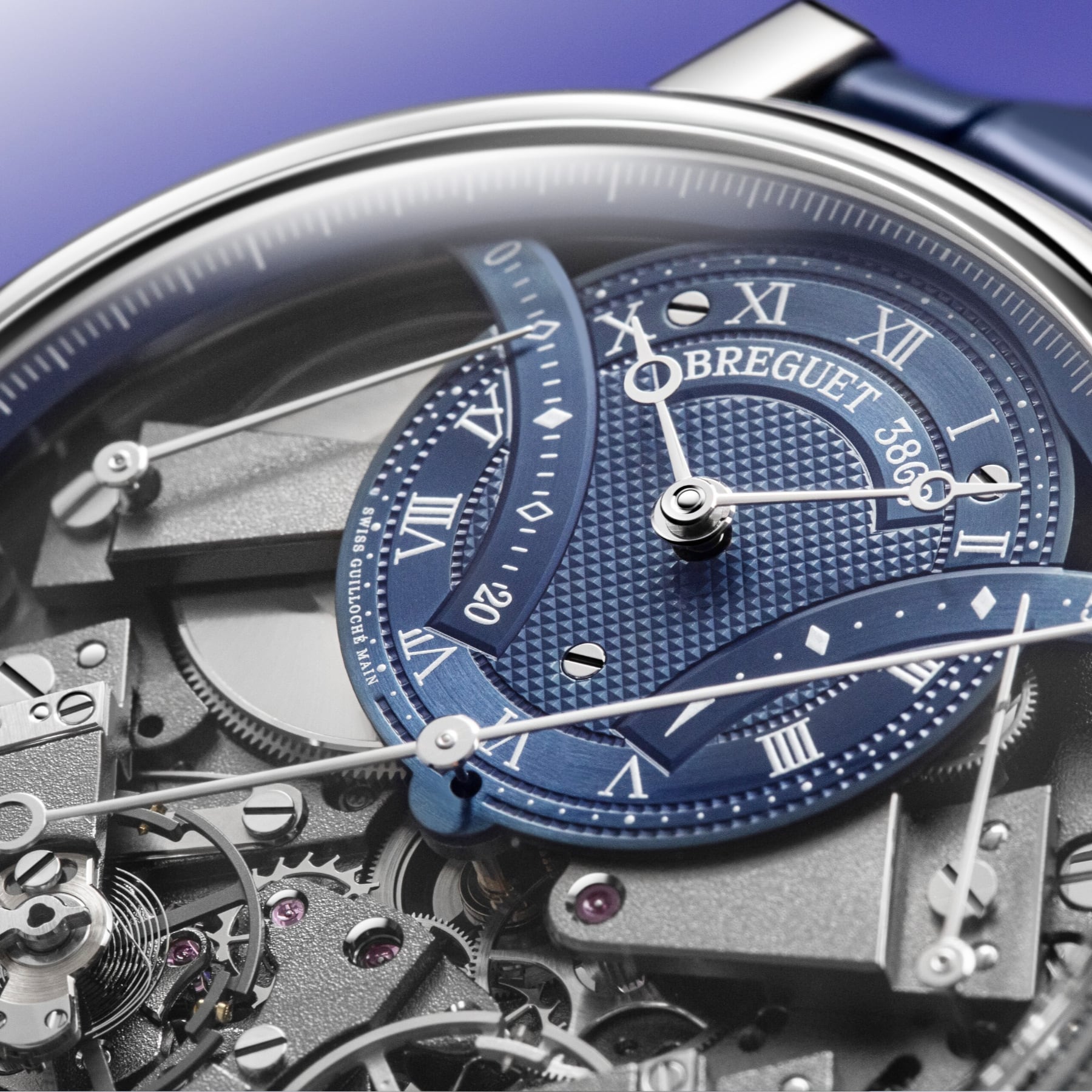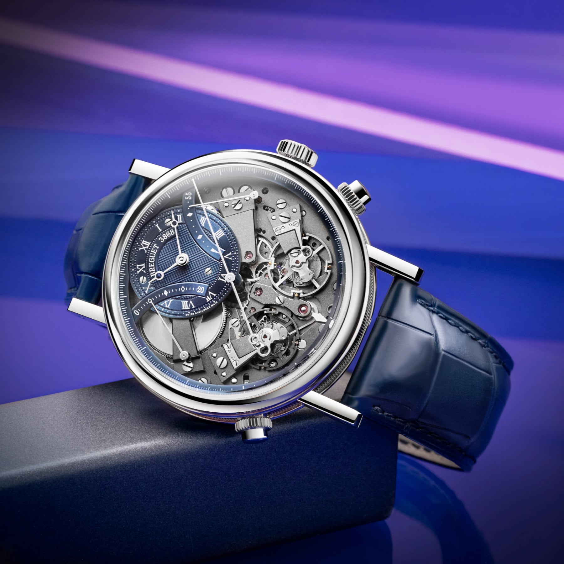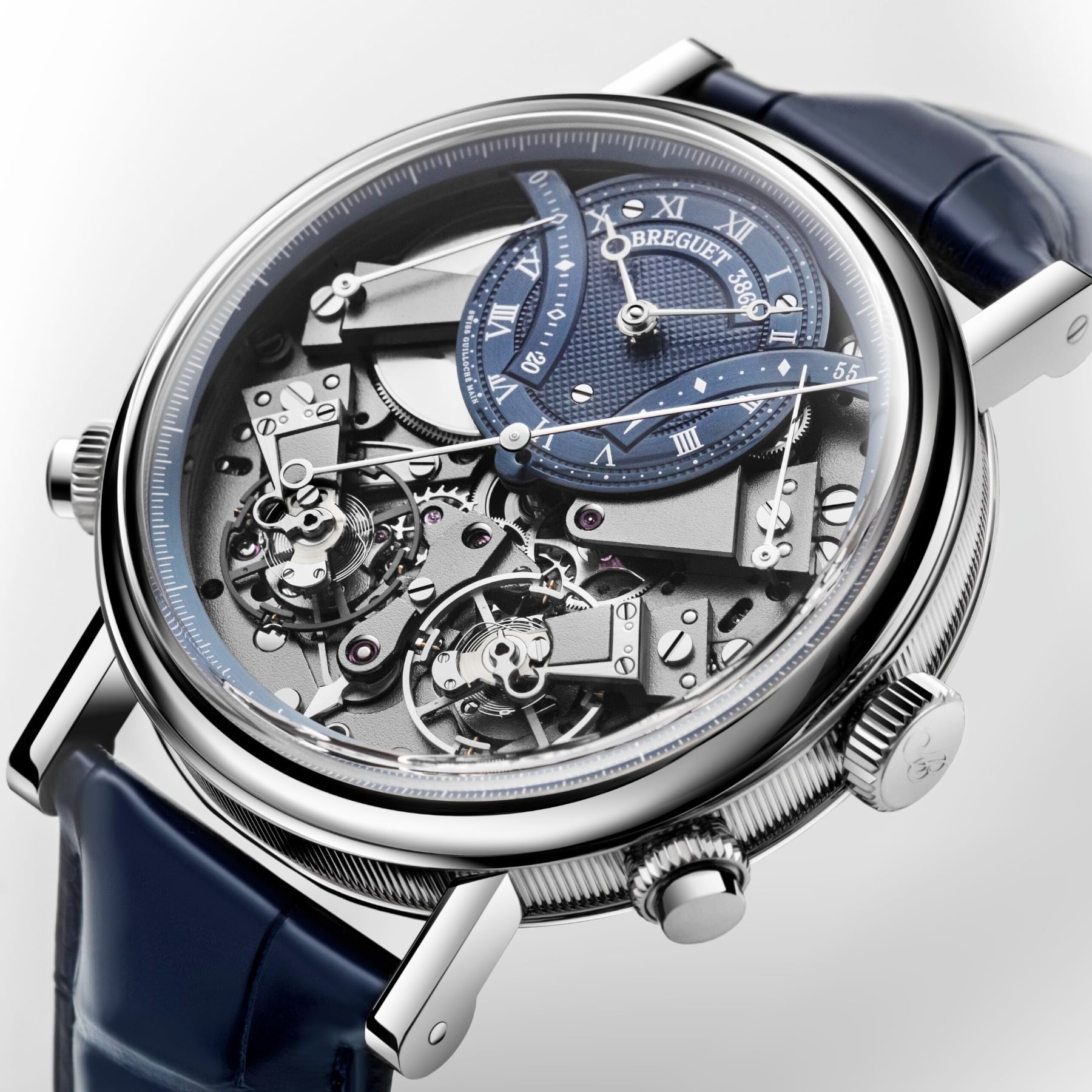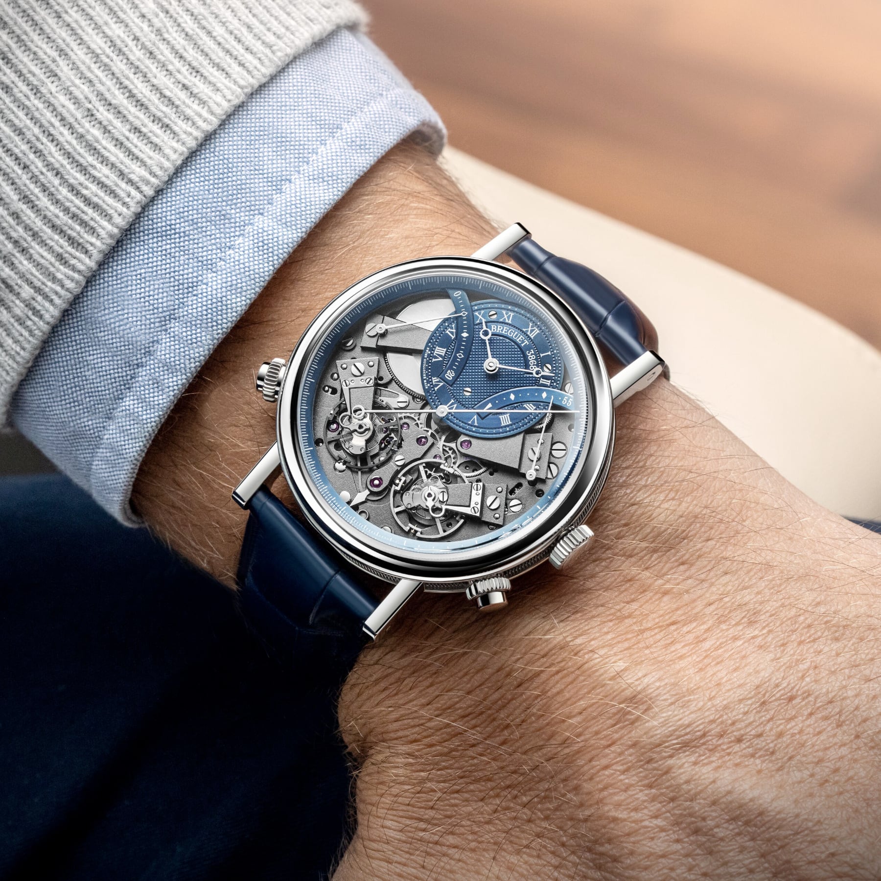 The measurement of short intervals allows for an immediate glimpse of the function requested, but achieving this is a mechanical challenge, as engaging the chronograph can disrupt the proper functioning of the main gear train. The creation of two distinct gear trains solves this problem and provides greater precision to the different displays. In terms of aesthetics, the Tradition 7077 does not deviate from the rule and features an exceptional level of symmetry. The indicator to start the chronograph is located at 6 o’clock. At 2 o’clock and at 10 o’clock, in perfect opposition, retrograde hands indicate, respectively, the watch’s power reserve and the chronograph’s minutes counter, whereas at 4 o’clock and 8 o’clock the two balance-wheels face one another. The one devoted to the watch function operates at a frequency of 3 Hz, whilst the one dedicated to the chronograph operates at 5 Hz, for greater precision.