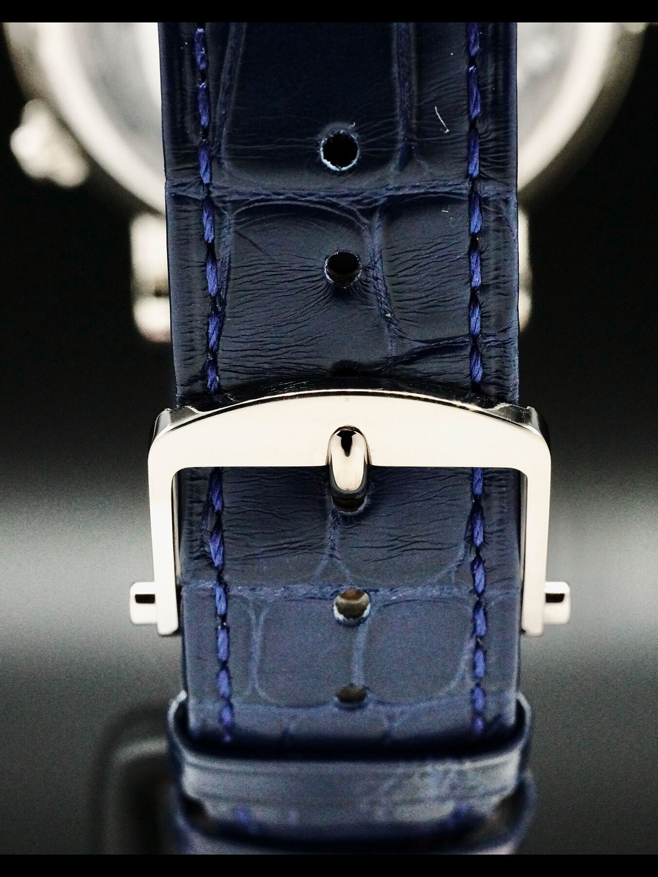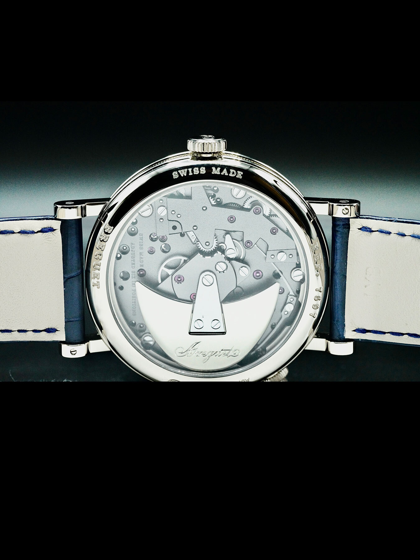This Breguet Tradition Quantième Rétrograde features a 40mm 18k white gold case with a display case back on a blue leather strap. This watch also sports a gold, blue dial with Breguet hands and Roman numeral dial markers covered by scratch resistant sapphire crystal.