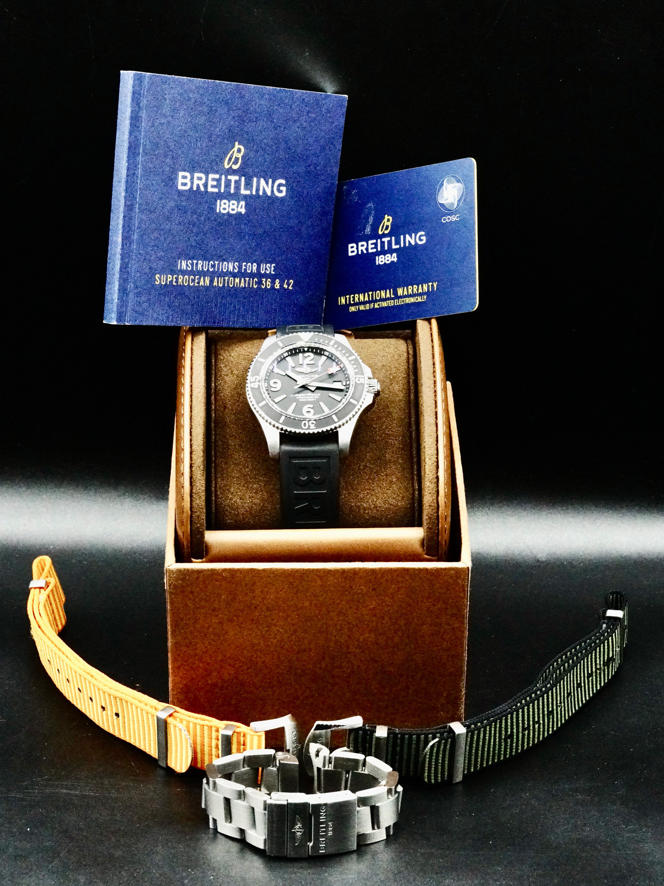 This Breitling A10370161C1A1 Superocean 42 is in EXCELLENT condition. This watch includes its original box, instruction booklet, warranty card dated 2022. Extra straps, bracelet.