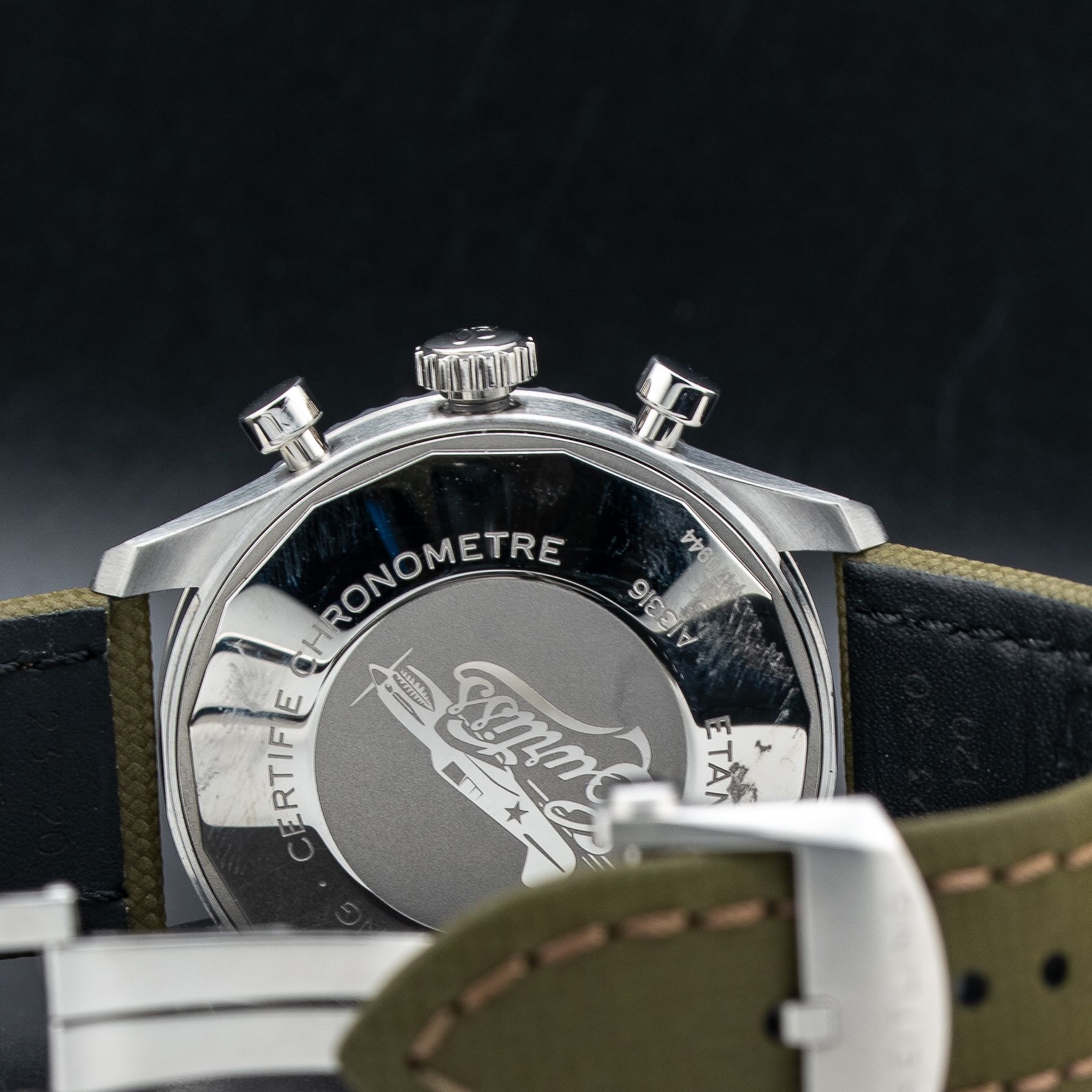 This Breitling A133161A1L1X2 Aviator 8 Chronograph 43 Curtiss Warhawk is in GREAT condition. This watch includes its Original Box. This watch has been fully authenticated and certified by Exquisite Timepieces.Please note, the photos shown are of the actual watch you will receive.