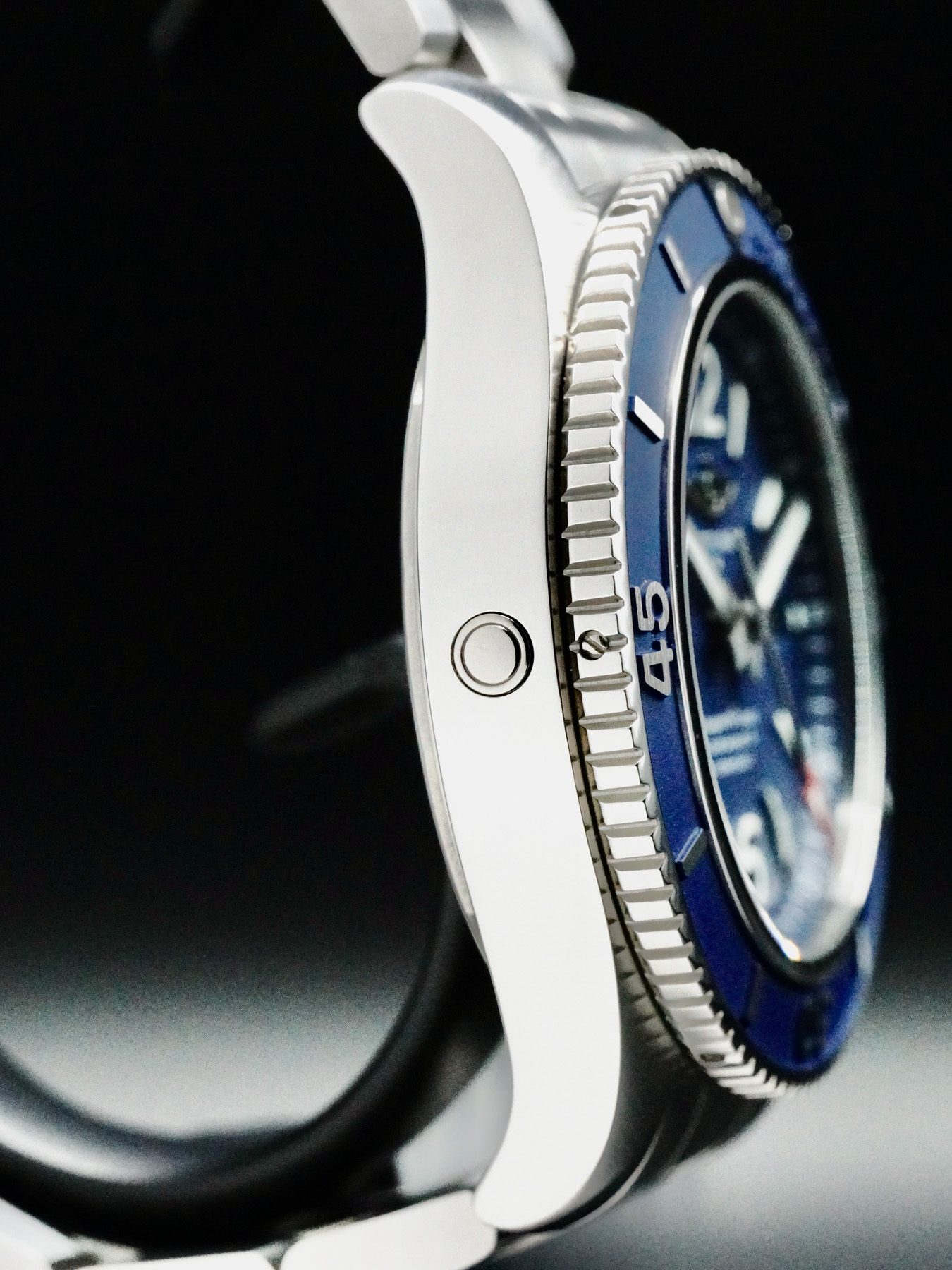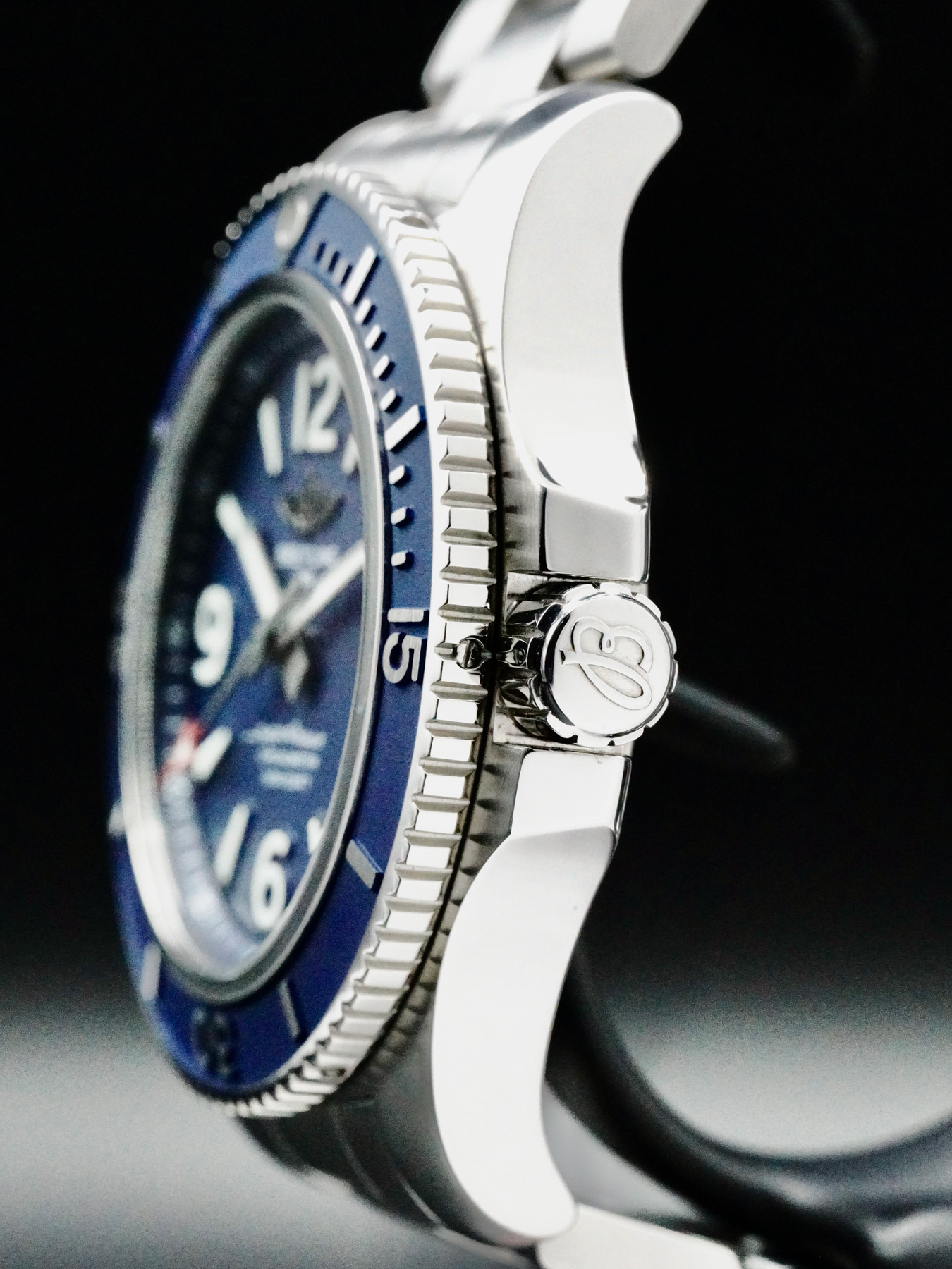 This watch features a 44 mm stainless steel case on a stainless steel bracelet. This watch also sports a blue dial. Powered by a Breitling 17 self-winding movement. Water resistance up to 1000 meters.