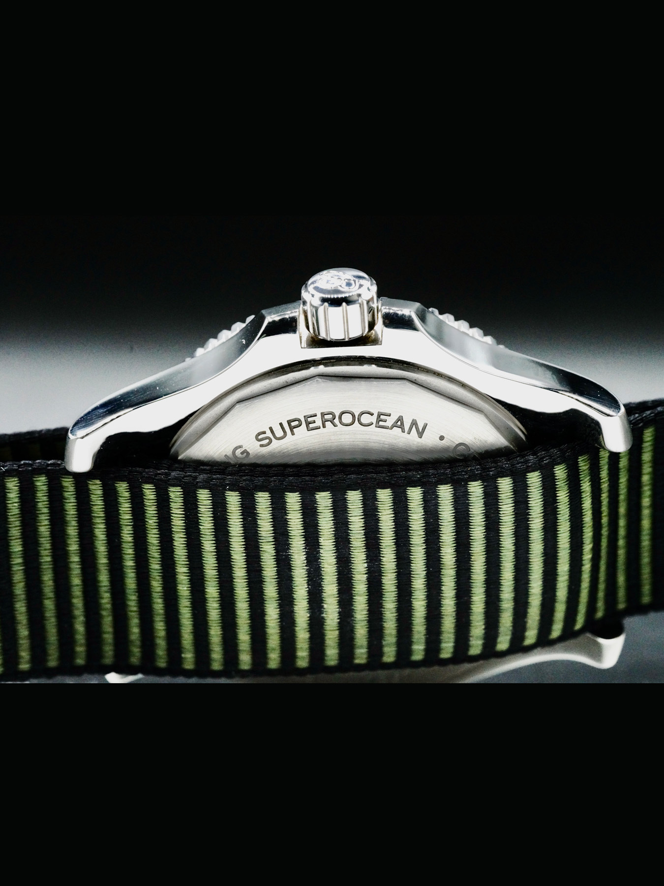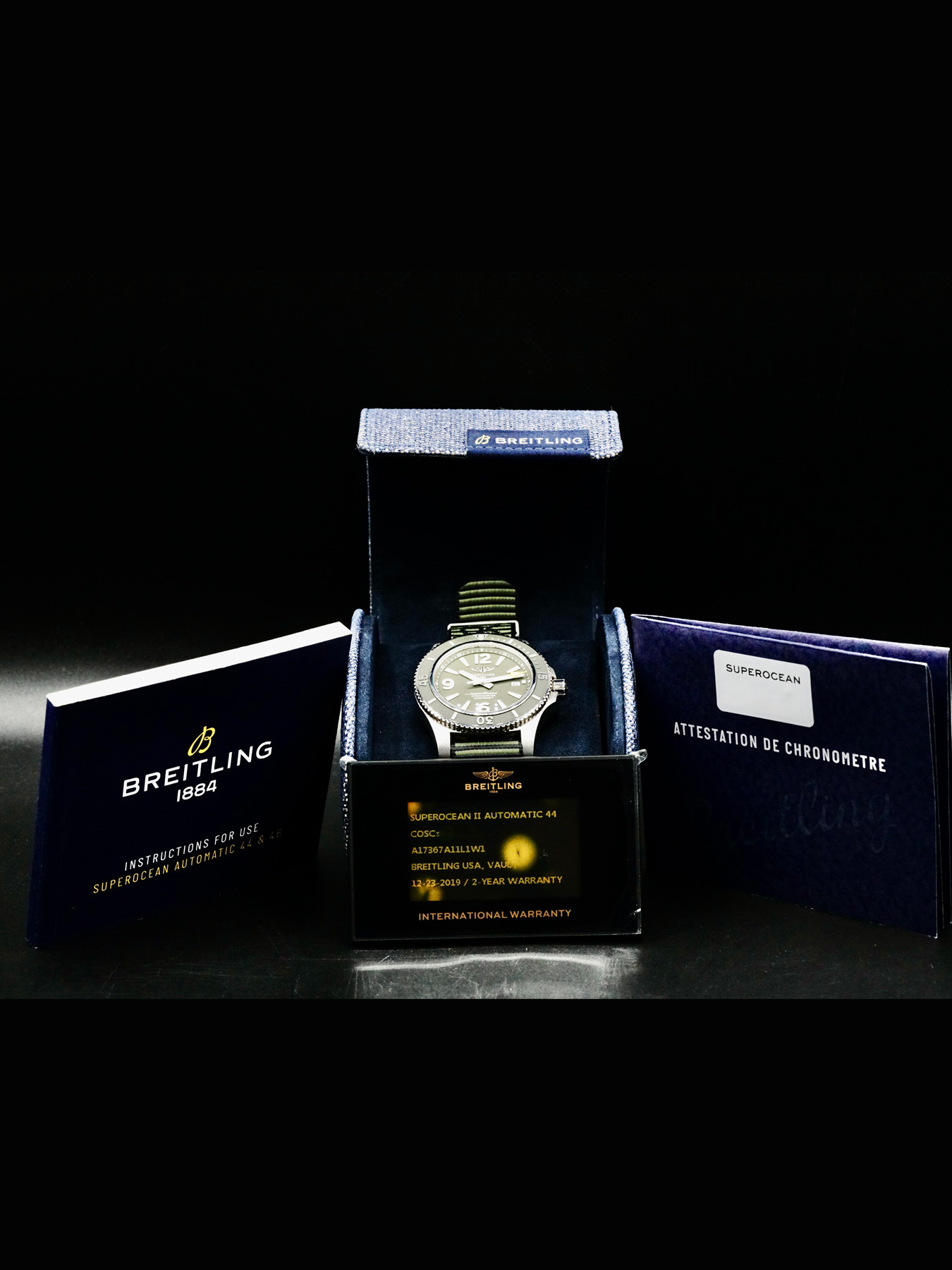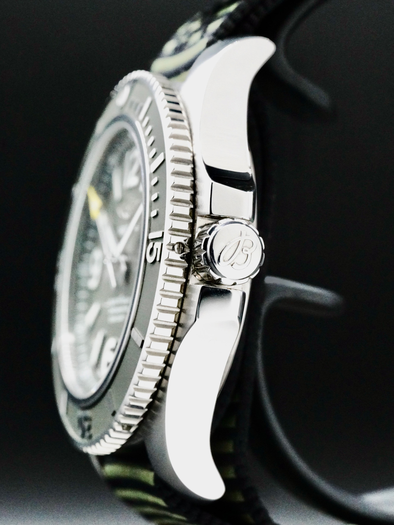 This Breitling Superocean Outerknown features a 44mm stainless steel case with a solid case back on a green nylon strap. This watch also sports a green dial with luminous hands and index dial markers covered by scratch resistant sapphire crystal.