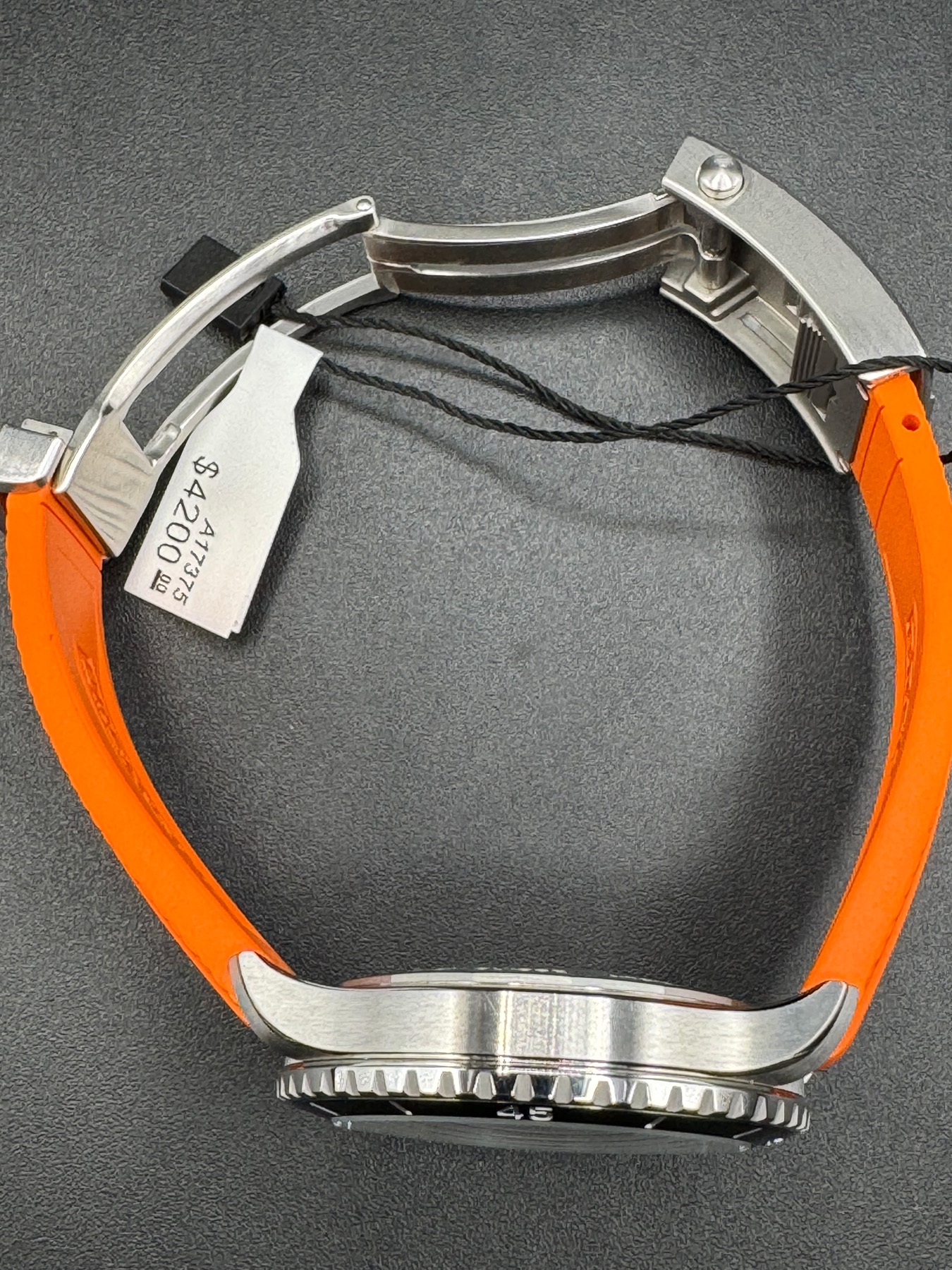This Breitling Superocean Rainbow features a 42mm stainless steel case with a solid case back on an orange rubber strap. This watch also sports a black dial with rainbow hands and indices covered by scratch resistant sapphire crystal.