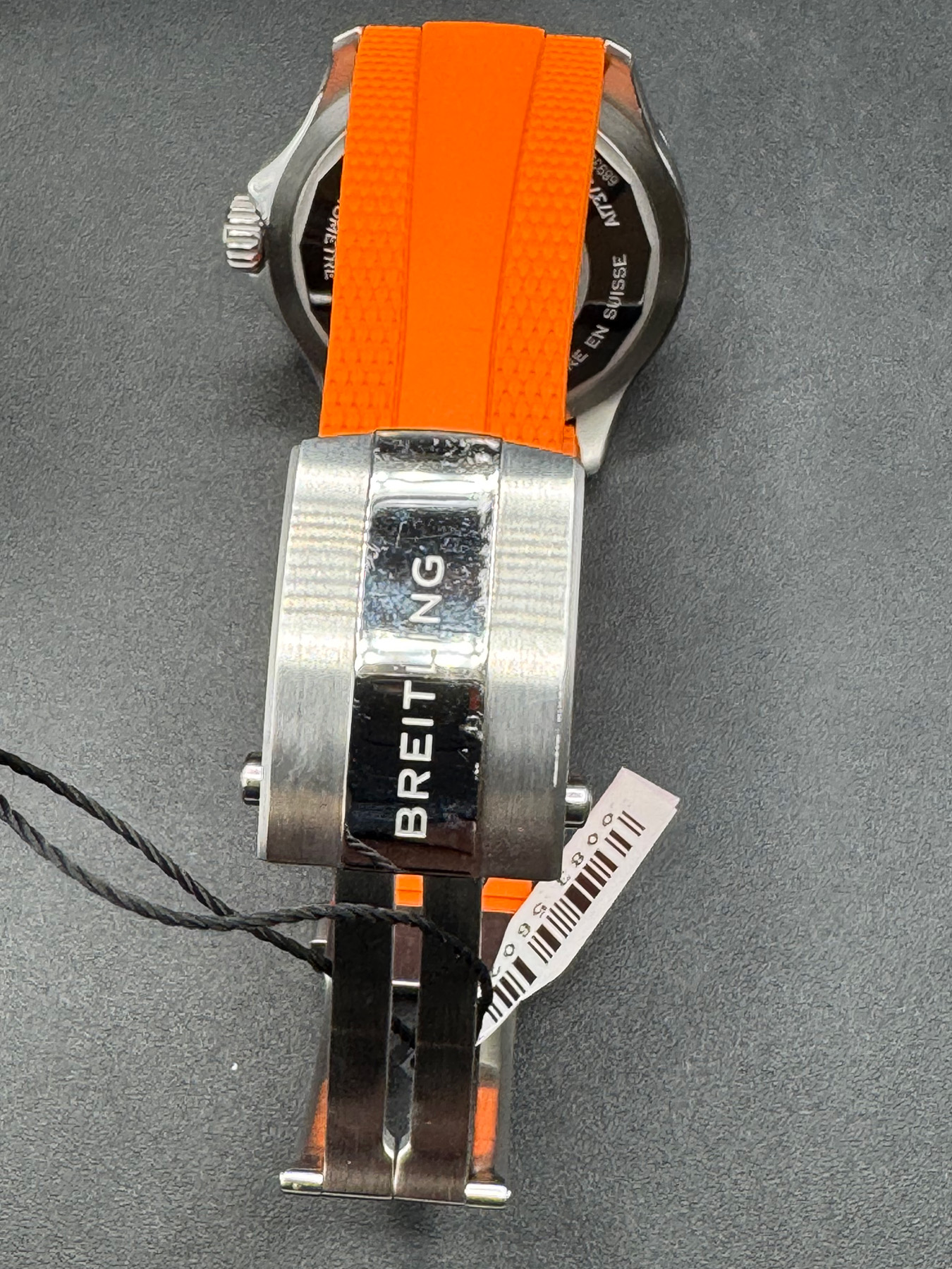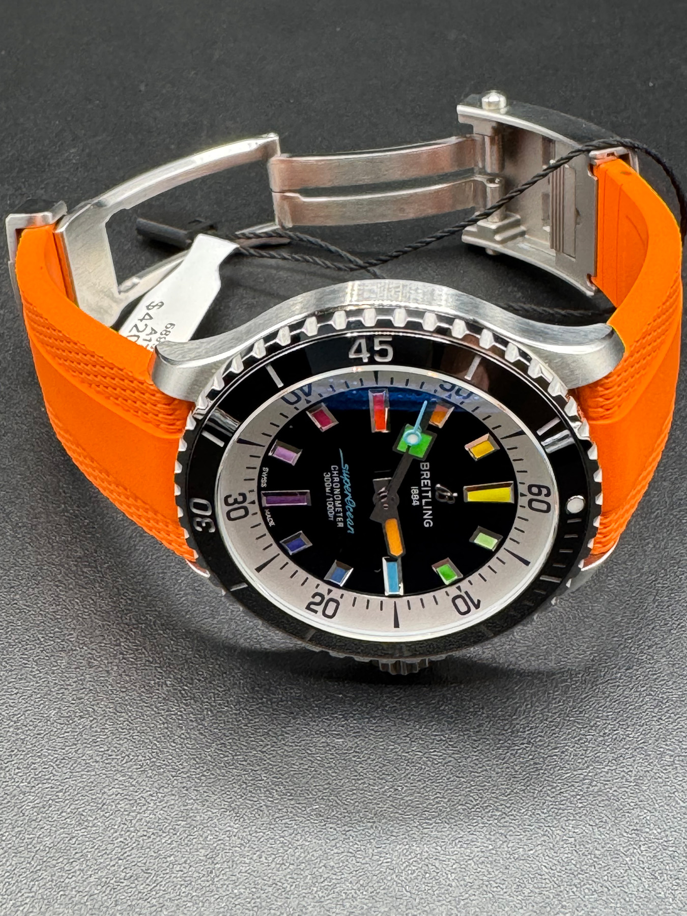 This Breitling Superocean Rainbow A17375 is in EXCELLENT condition. This watch includes its original box, papers, and warranty valid until 01/09/2026. This watch has been fully authenticated and certified by Exquisite Timepieces.