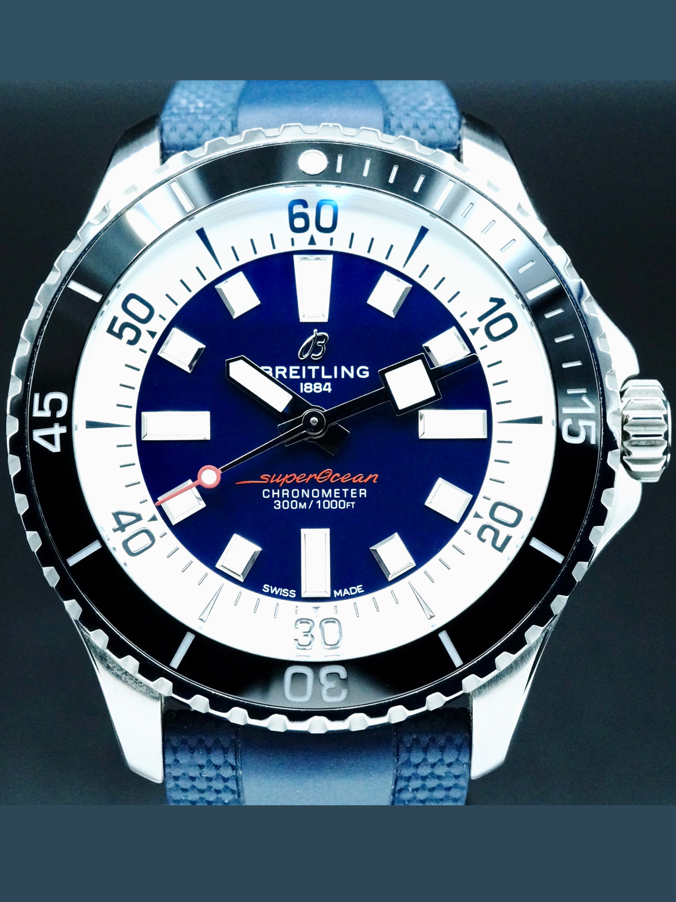This Breitling Superocean features a 44mm stainless steel case with a solid case back on a blue rubber strap. This watch also sports a blue dial with luminous hands and Arabic numeral/index dial markers covered by sapphire crystal.