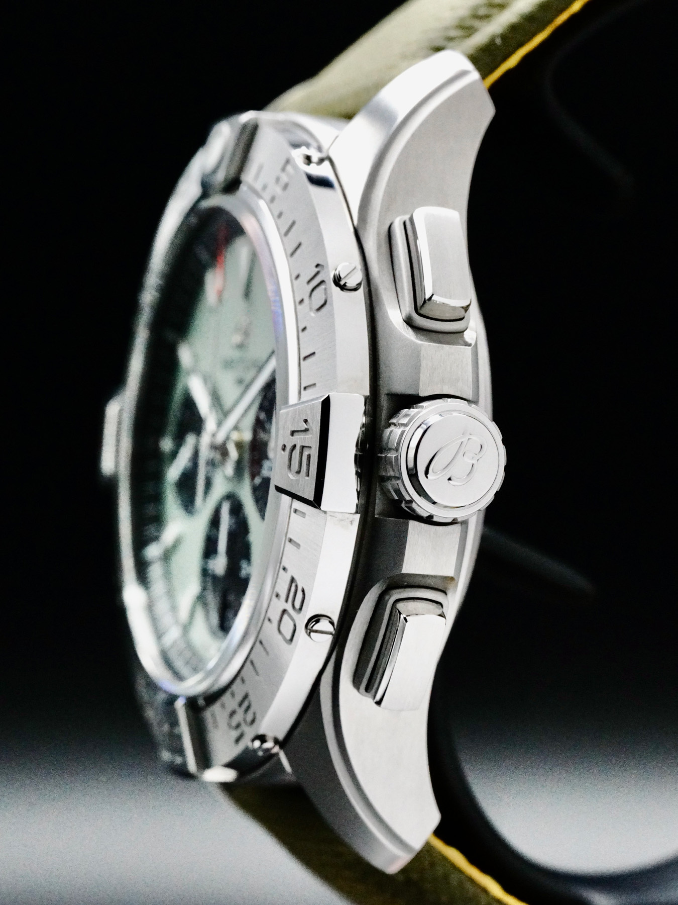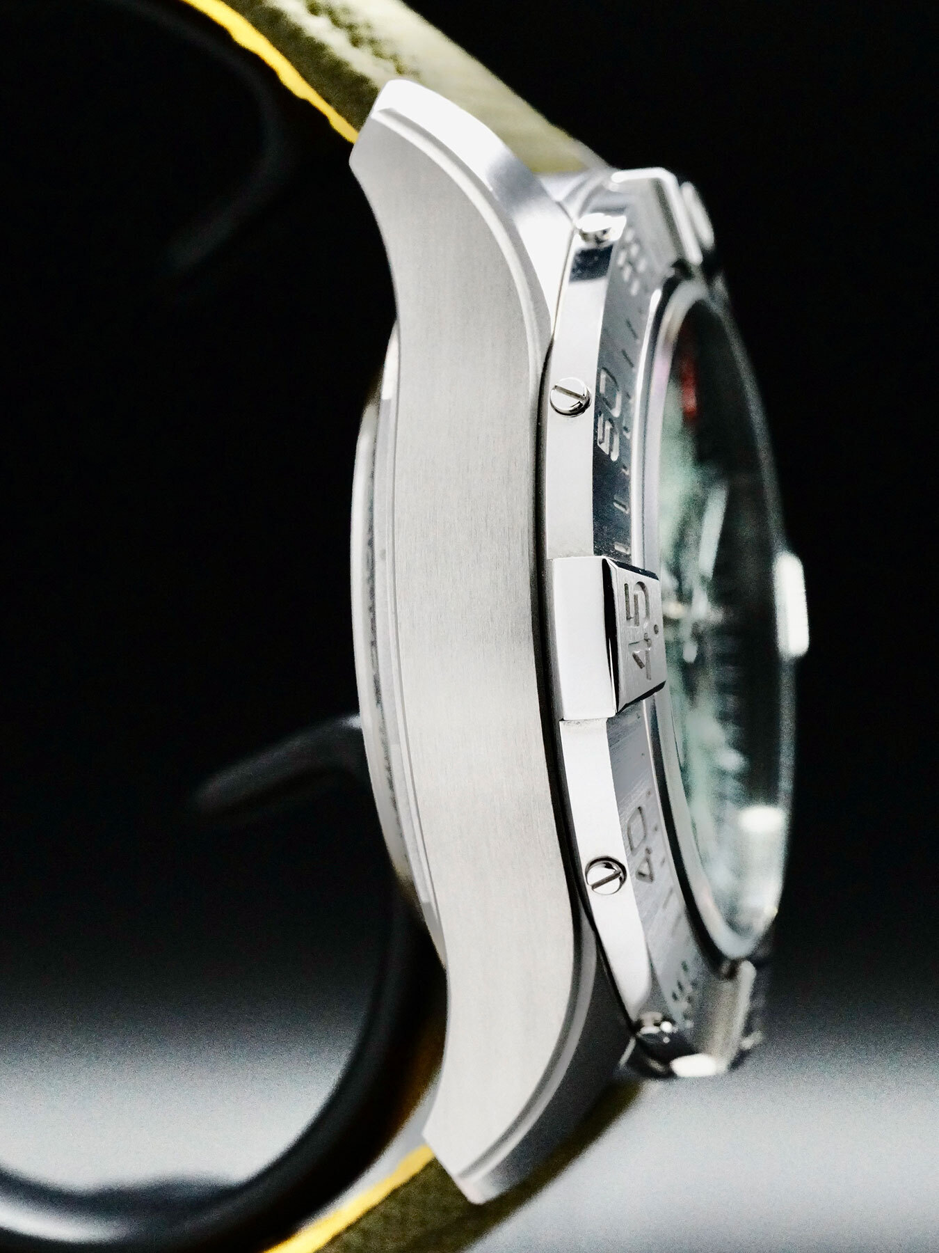 This watch features a 44 mm stainless steel case on calfskin leather strap. This watch also sports a green dial. Powered by a self-winding mechanical movement. Water resistance up to 300 meters.