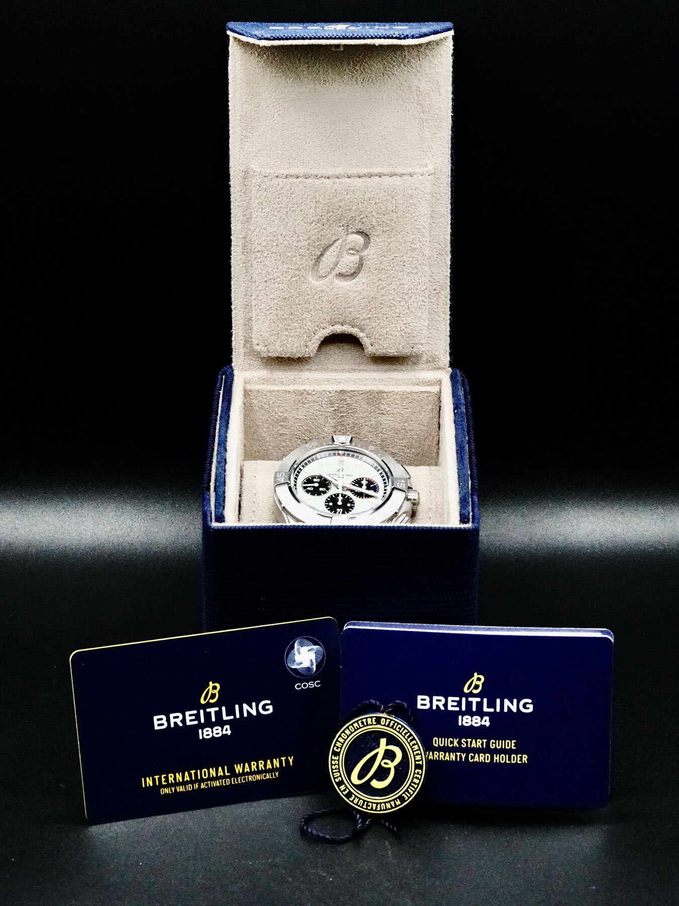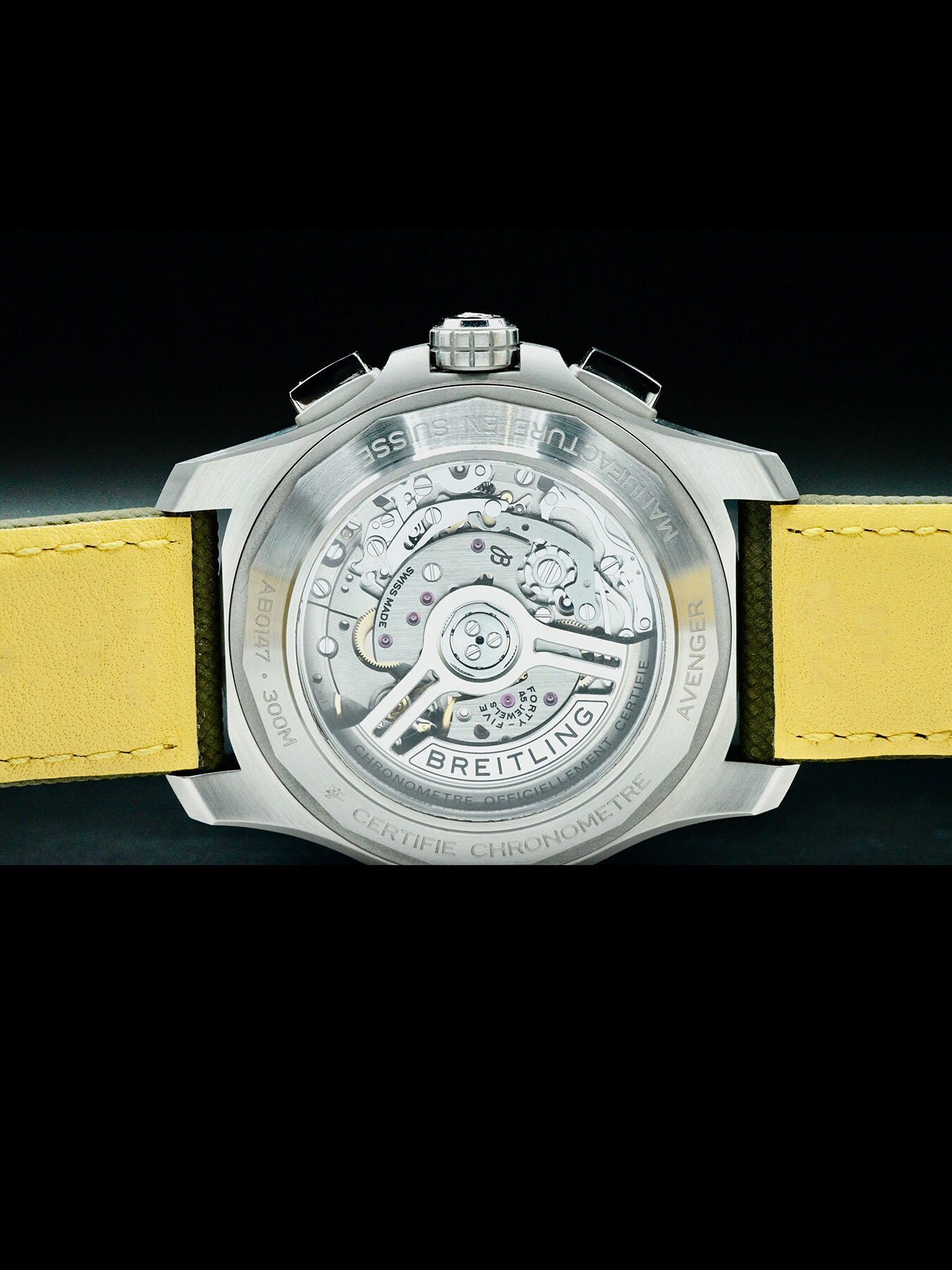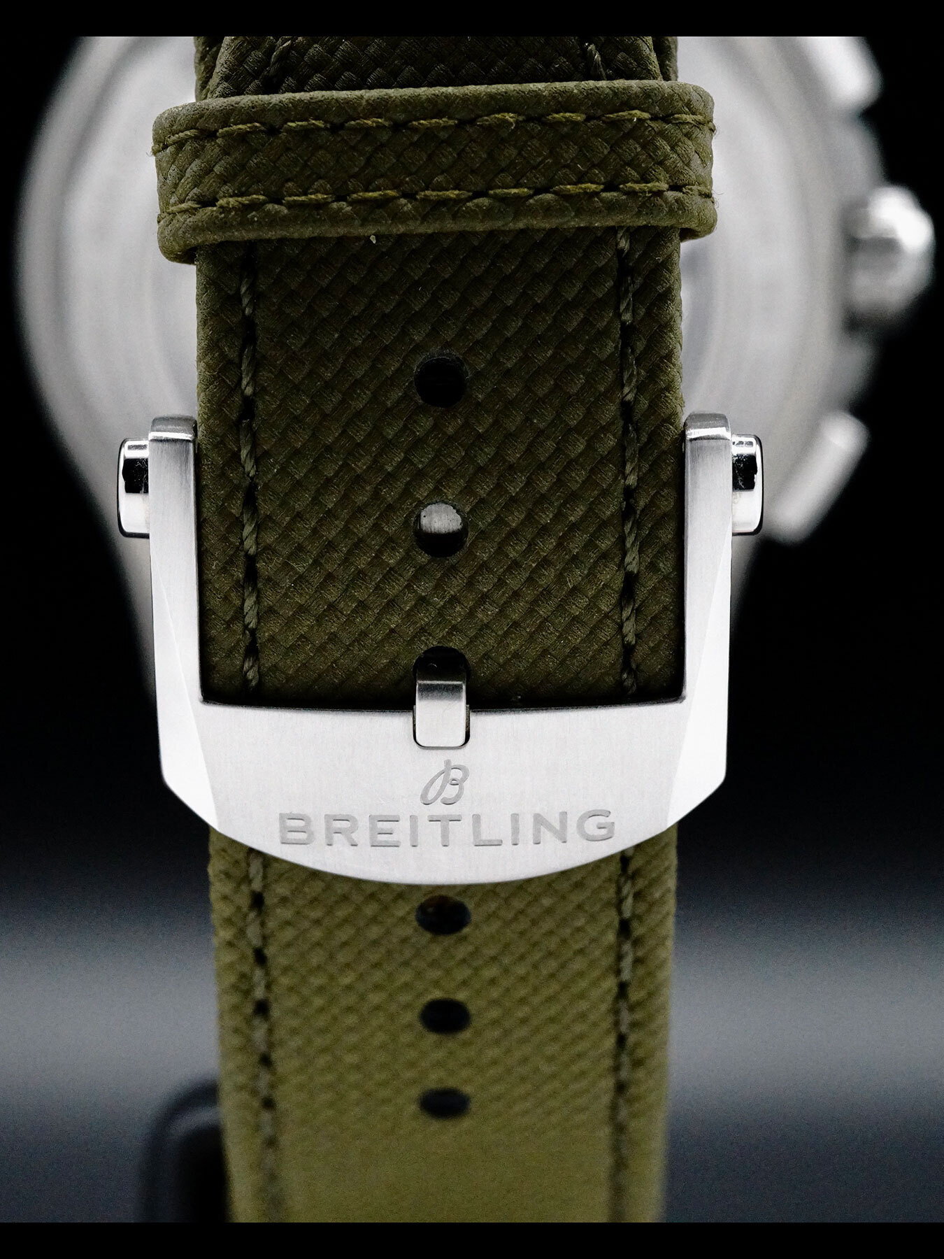 This Breitling AB0147 Avenger B01 Chronograph 44 is in EXCELLENT condition. This watch includes its original box, instruction manual, and warranty card. This watch has been fully authenticated and certified by Exquisite Timepieces. (Small scratch on buckle).