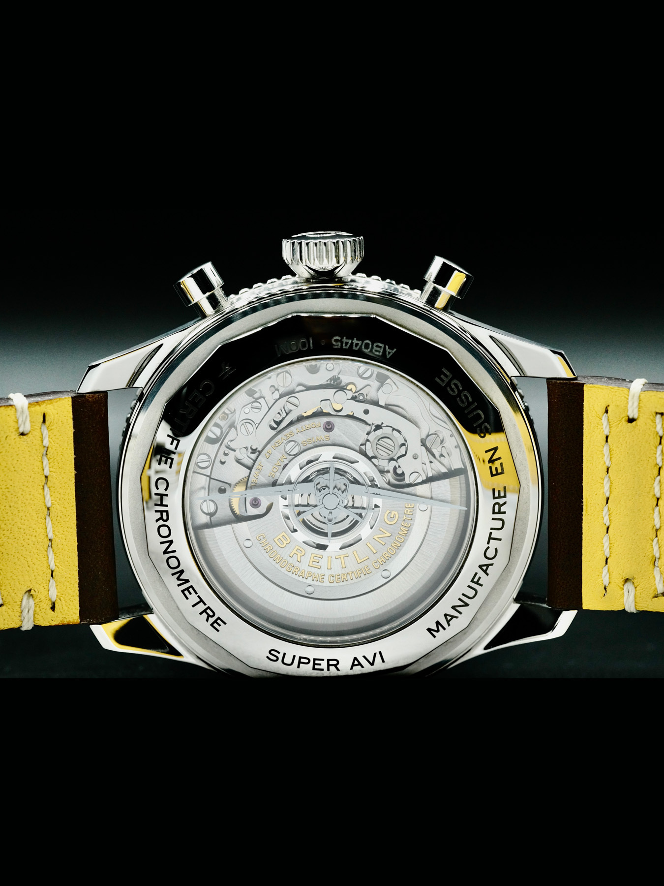 Self-winding movement powered by Breitling Calibre B04 with a power reserve of approximately 70 hours. Water resistance up to 100 meters.